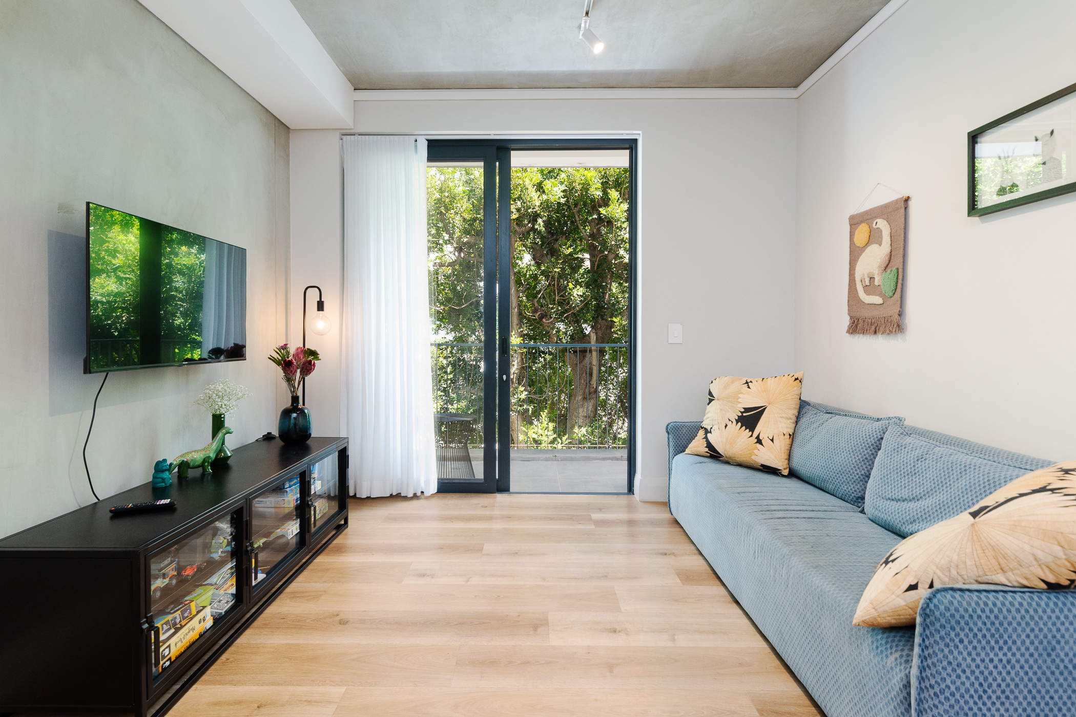 The spacious open-plan living area benefits from an AC unit and has a leafy outlook, opening onto a peaceful balcony, sheltered from the wind being on the west side of the property. The modern kitchen has plenty of storage space and is plumbed for two appliances.