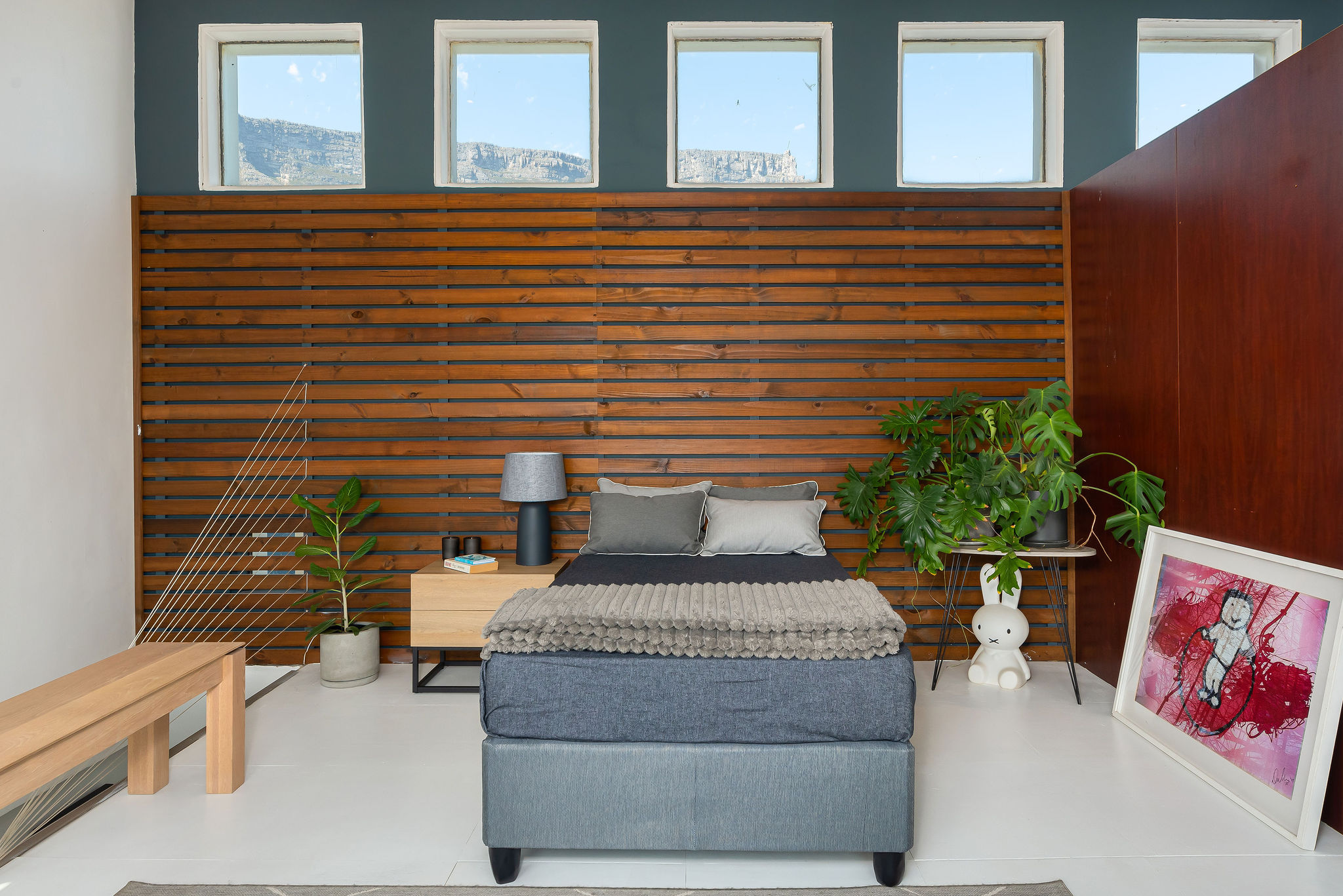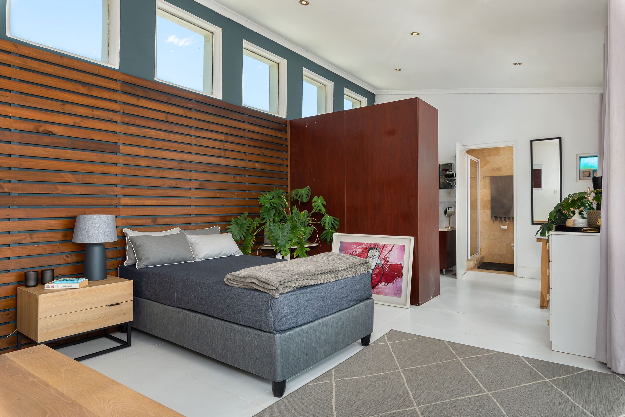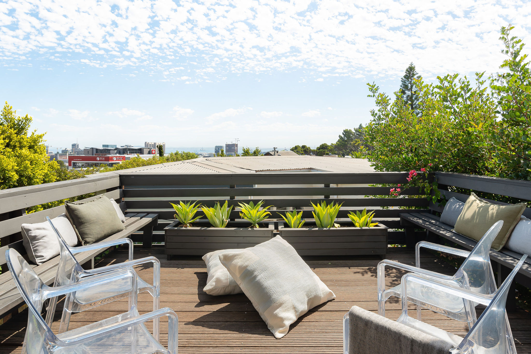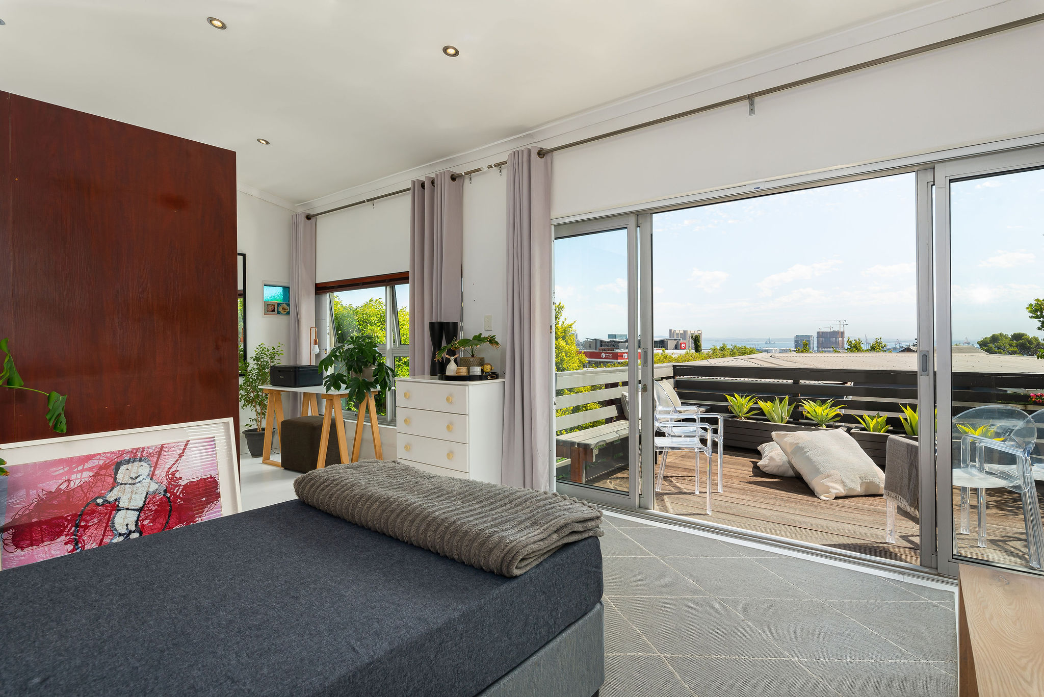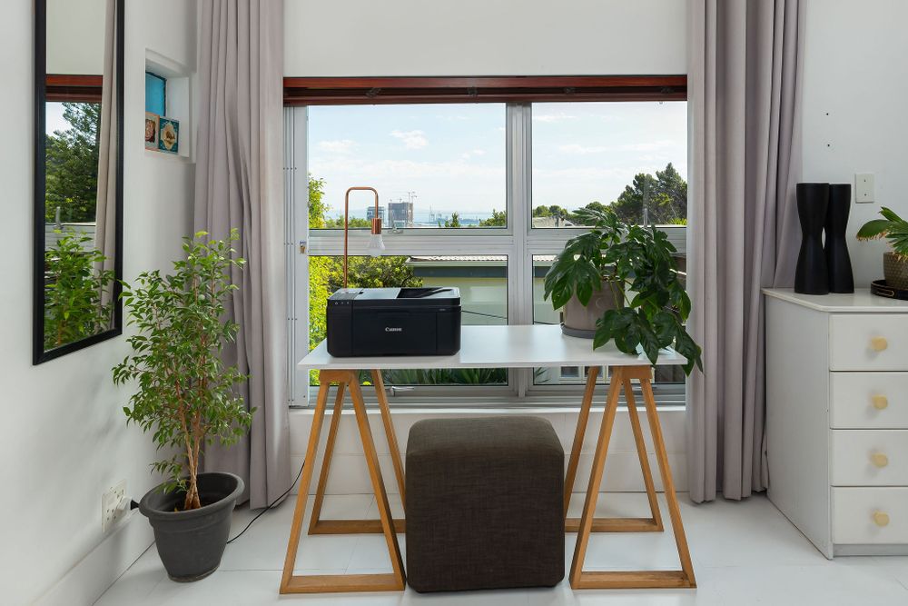 The carefully selected neutral colour scheme and tiles, black taps and luxurious Robin Sprong wallpaper show how much this home is loved by its current owners. The master bedroom on the first floor is a real showstopper, offering an extra-height ceiling and a panoramic view of Table Mountain. It opens onto a north-facing deck with built-in benches, offering fantastic views over the city, Signal Hill, the harbour, and Devil’s Peak, a peaceful spot for sundowners or a quiet read. An additional work space, walk-in cupboard, separate vanity, and compact en-suite bathroom complete this tranquil retreat.