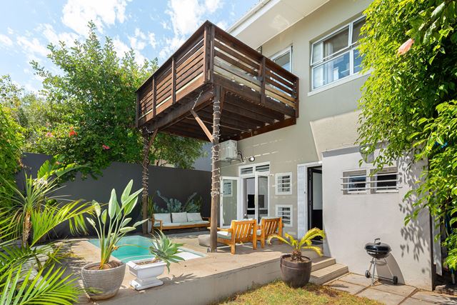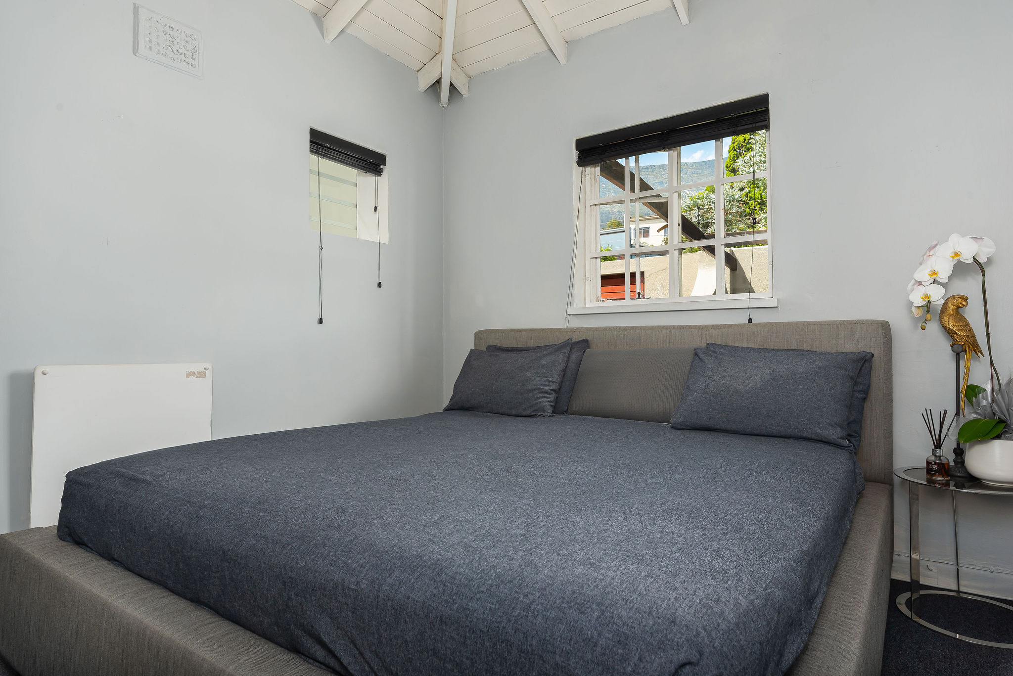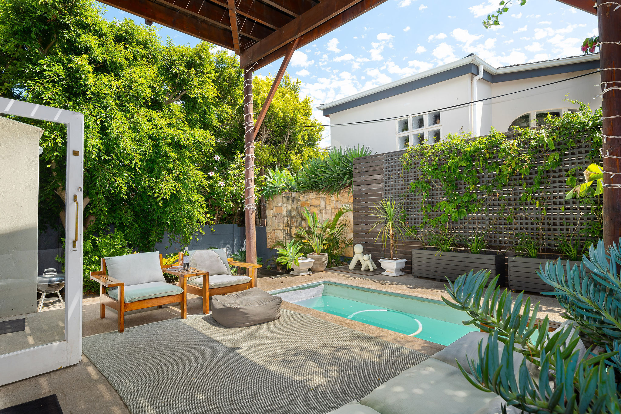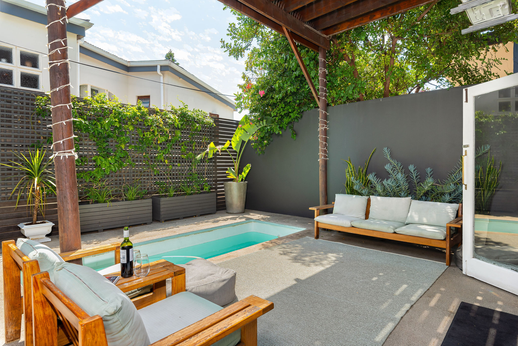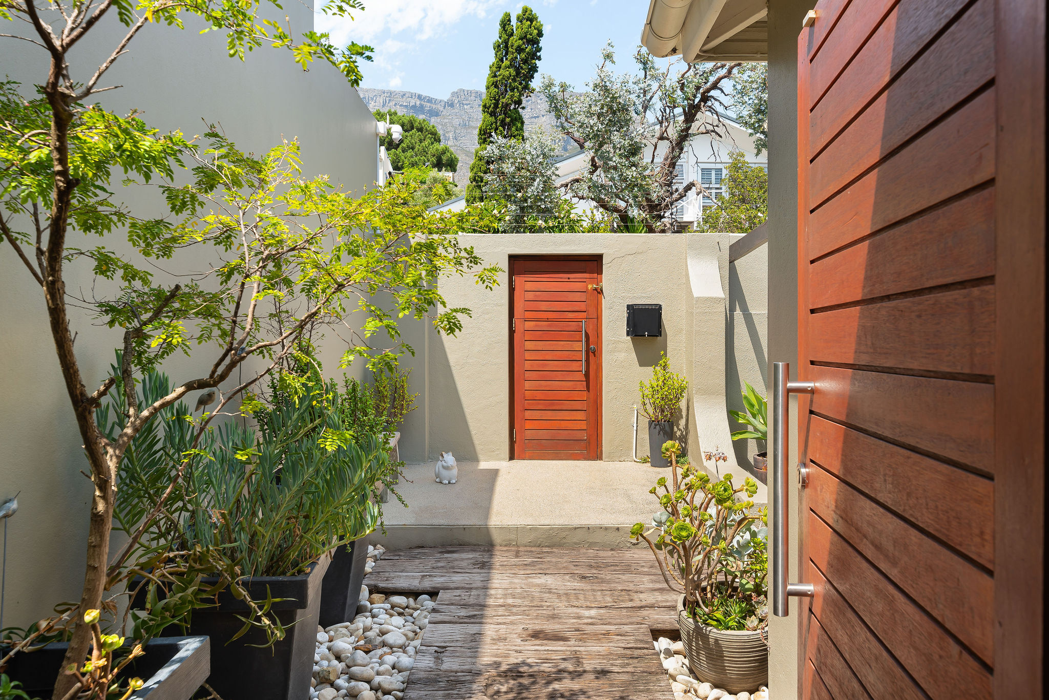 The carefully selected neutral colour scheme and tiles, black taps and luxurious Robin Sprong wallpaper show how much this home is loved by its current owners. The master bedroom on the first floor is a real showstopper, offering an extra-height ceiling and a panoramic view of Table Mountain. It opens onto a north-facing deck with built-in benches, offering fantastic views over the city, Signal Hill, the harbour, and Devil’s Peak, a peaceful spot for sundowners or a quiet read. An additional work space, walk-in cupboard, separate vanity, and compact en-suite bathroom complete this tranquil retreat.