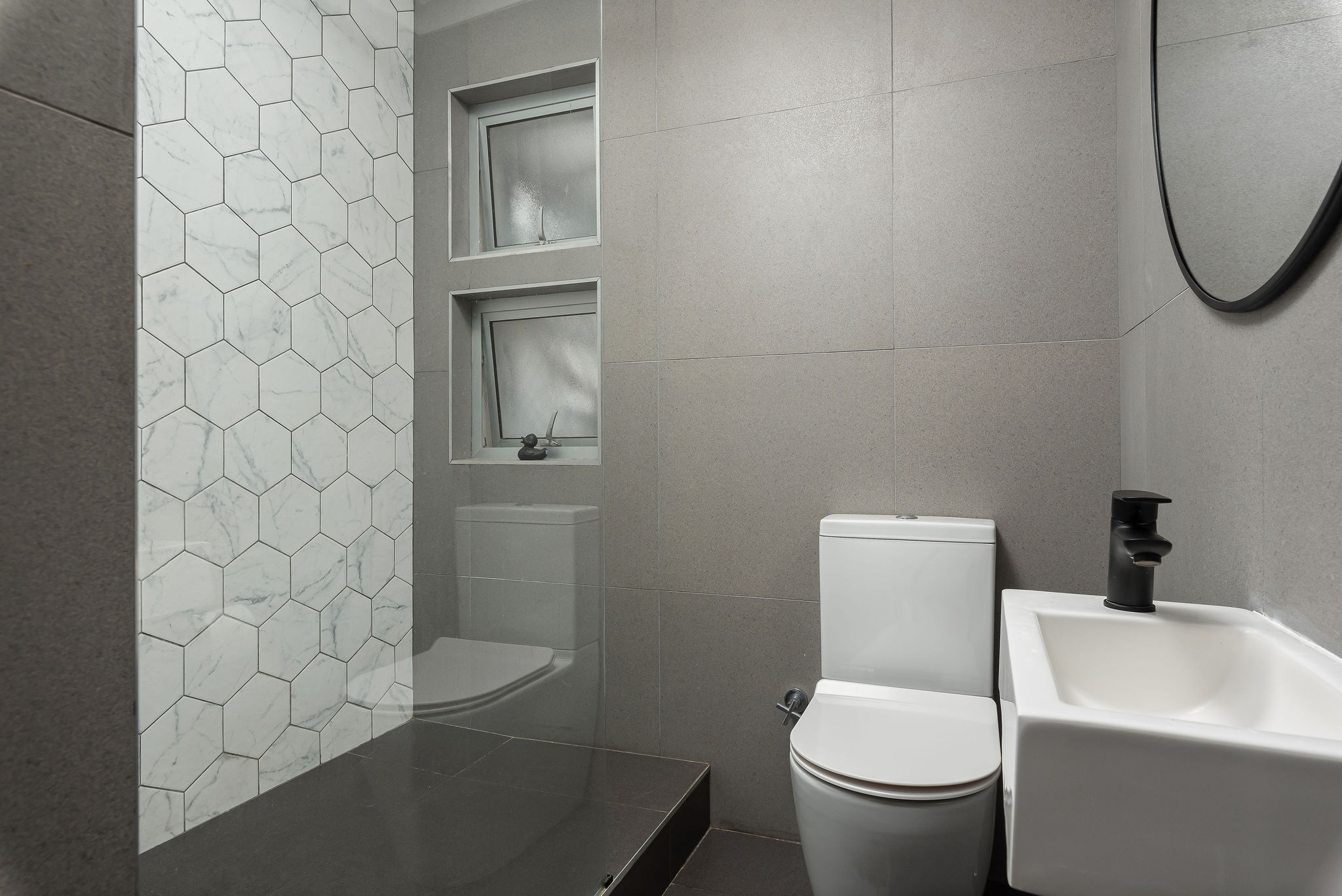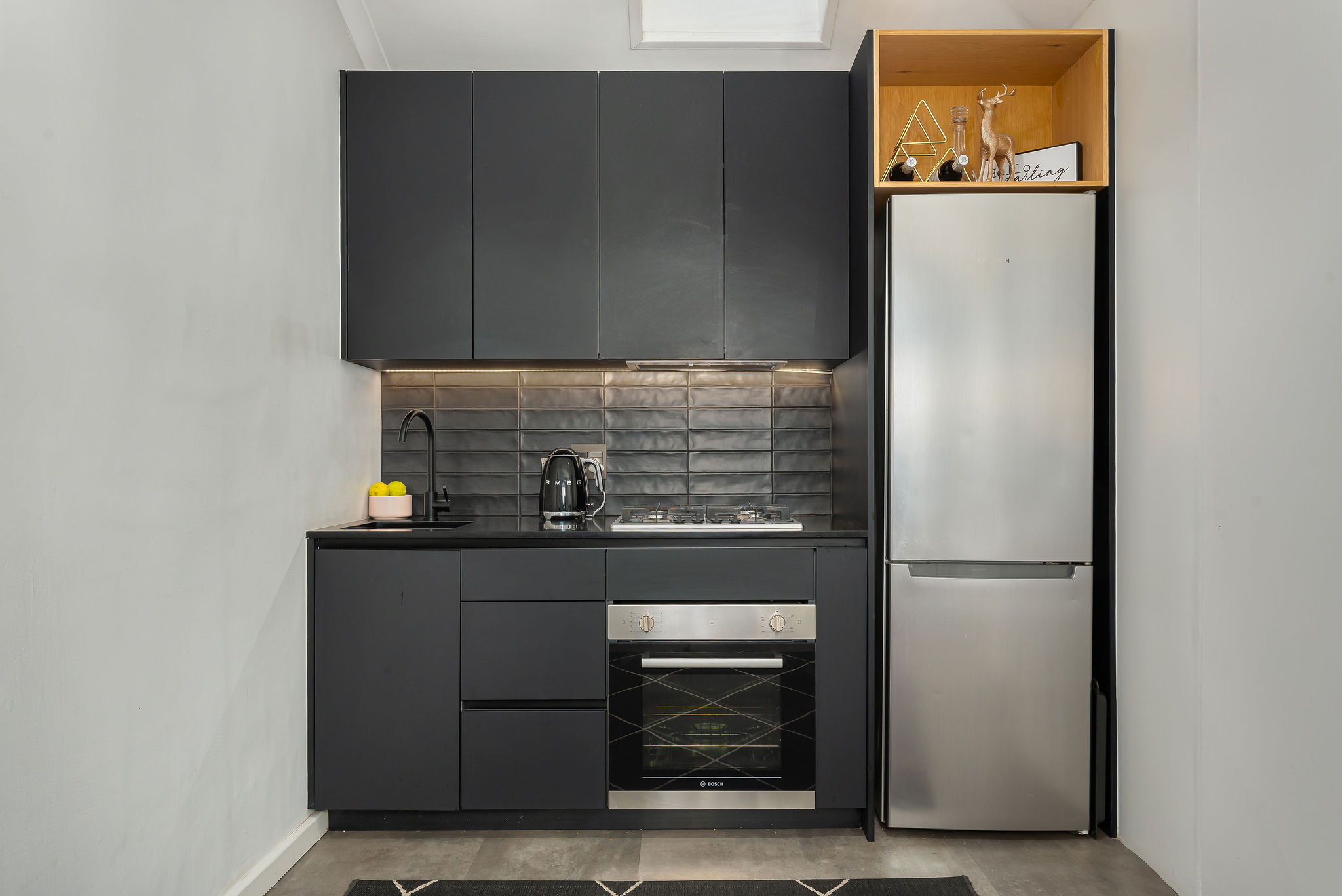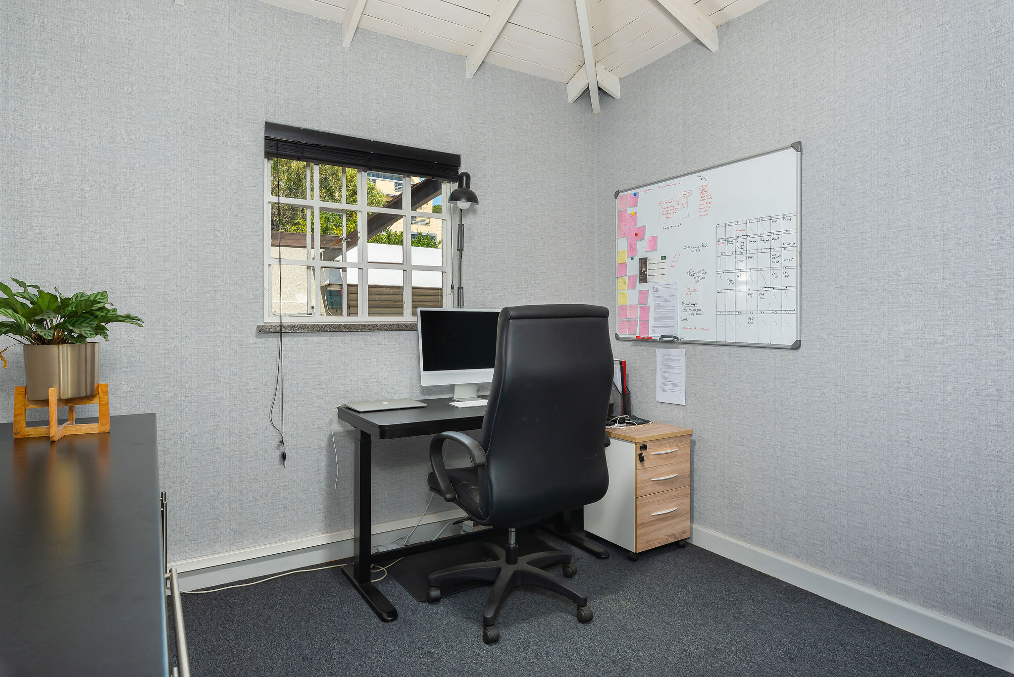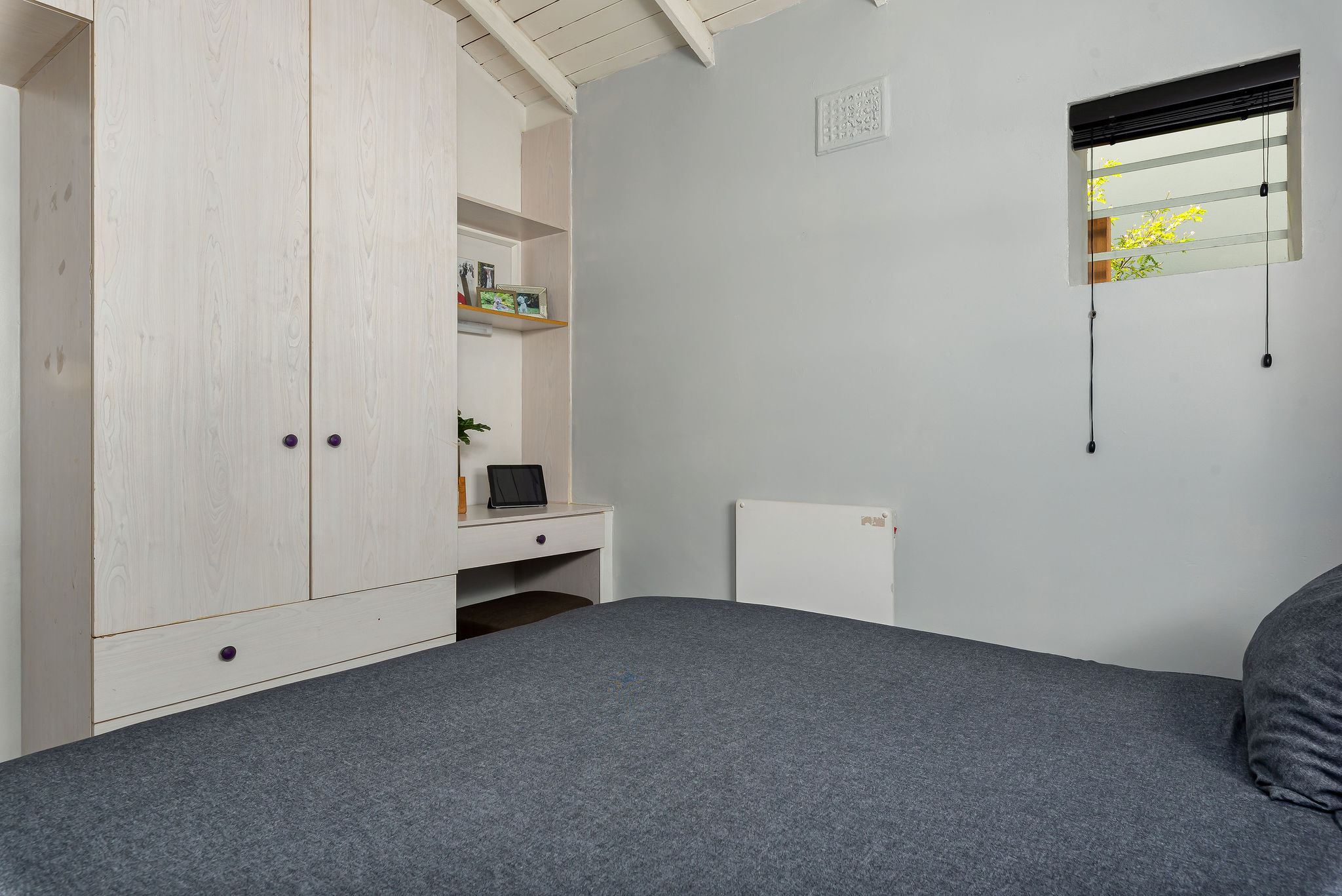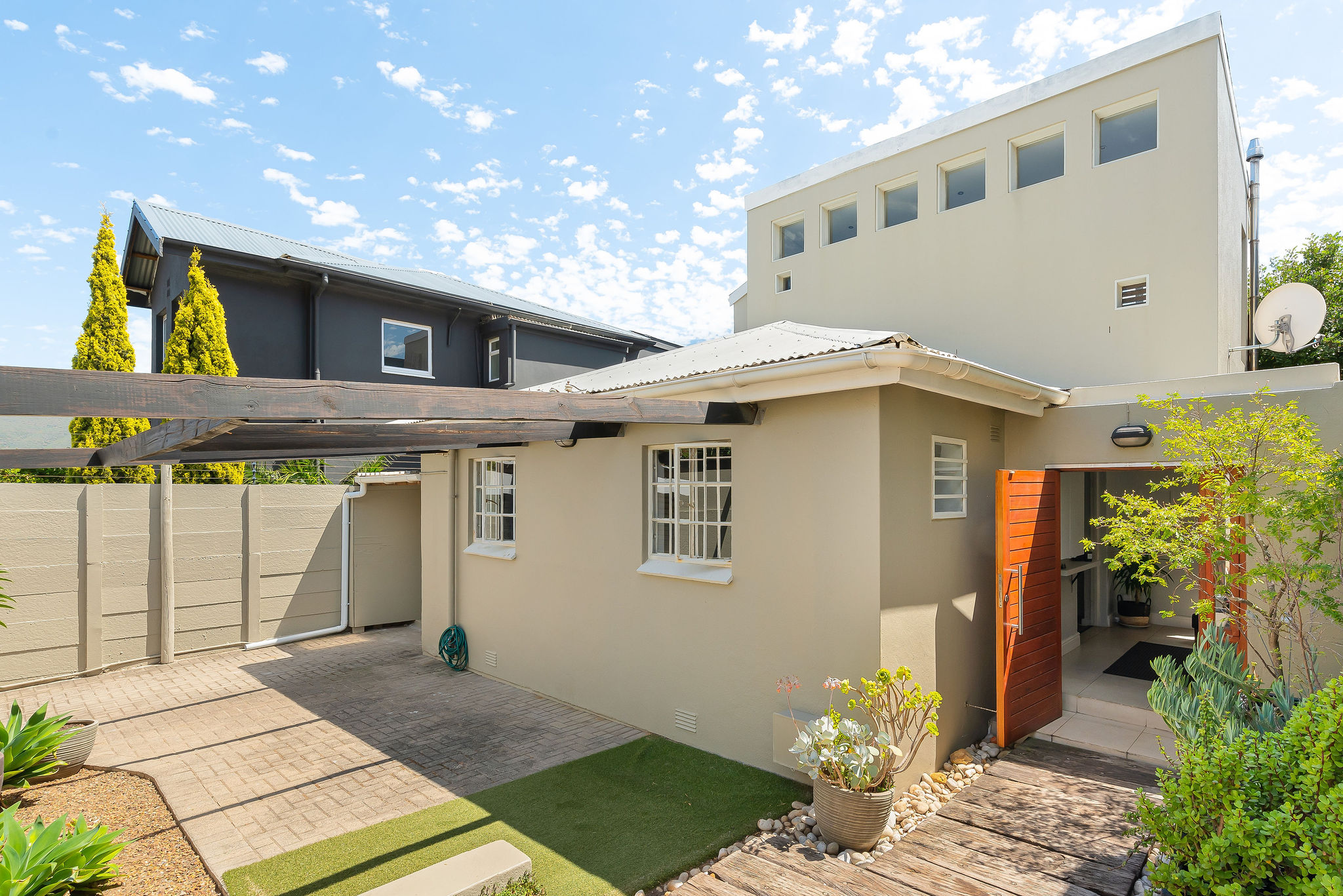 The carefully selected neutral colour scheme and tiles, black taps and luxurious Robin Sprong wallpaper show how much this home is loved by its current owners. The master bedroom on the first floor is a real showstopper, offering an extra-height ceiling and a panoramic view of Table Mountain. It opens onto a north-facing deck with built-in benches, offering fantastic views over the city, Signal Hill, the harbour, and Devil’s Peak, a peaceful spot for sundowners or a quiet read. An additional work space, walk-in cupboard, separate vanity, and compact en-suite bathroom complete this tranquil retreat.