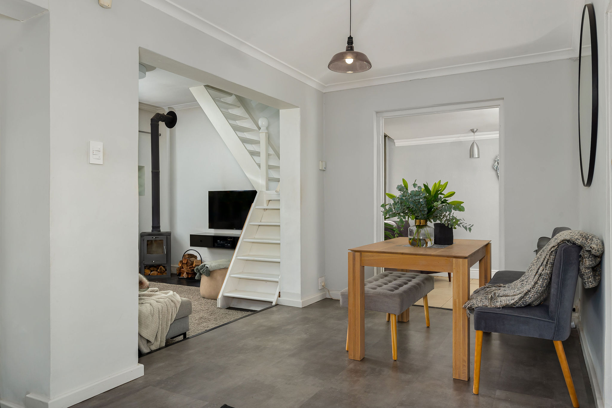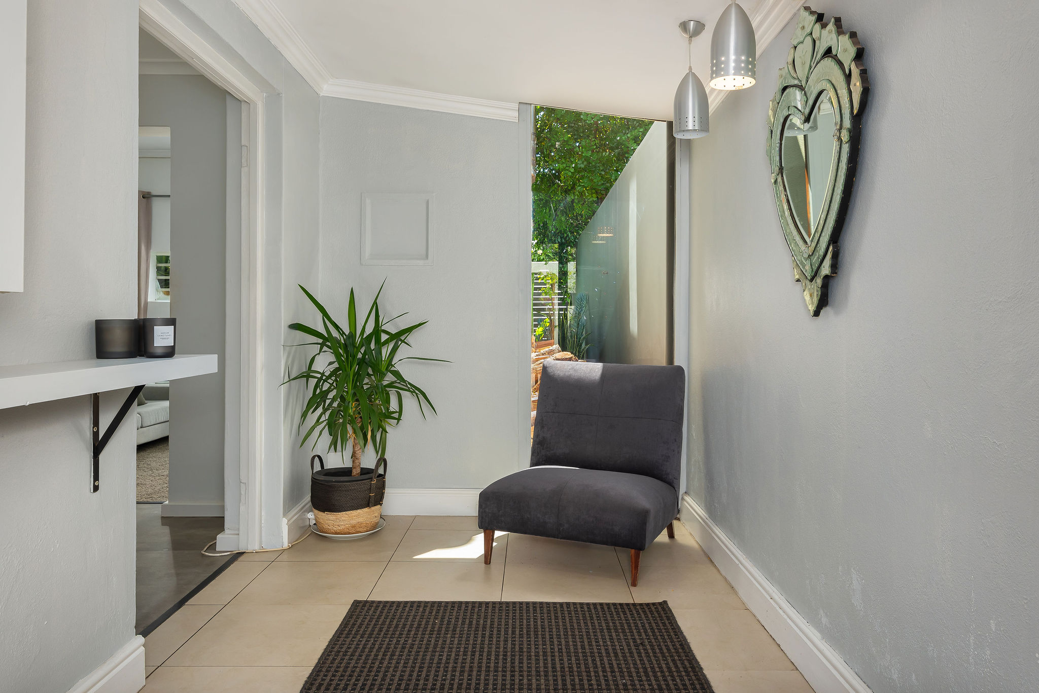 A spacious courtyard with indigenous pot plants and a wide, bright passage welcome you into this unique home. The L-shaped open-plan living area has an air-conditioning unit for warm summer days and a wood burner for cosy winter nights. The lounge opens onto the garden with a sparkling pool and covered outdoor seating area, an ideal setting for relaxed gatherings and summer days around the pool.