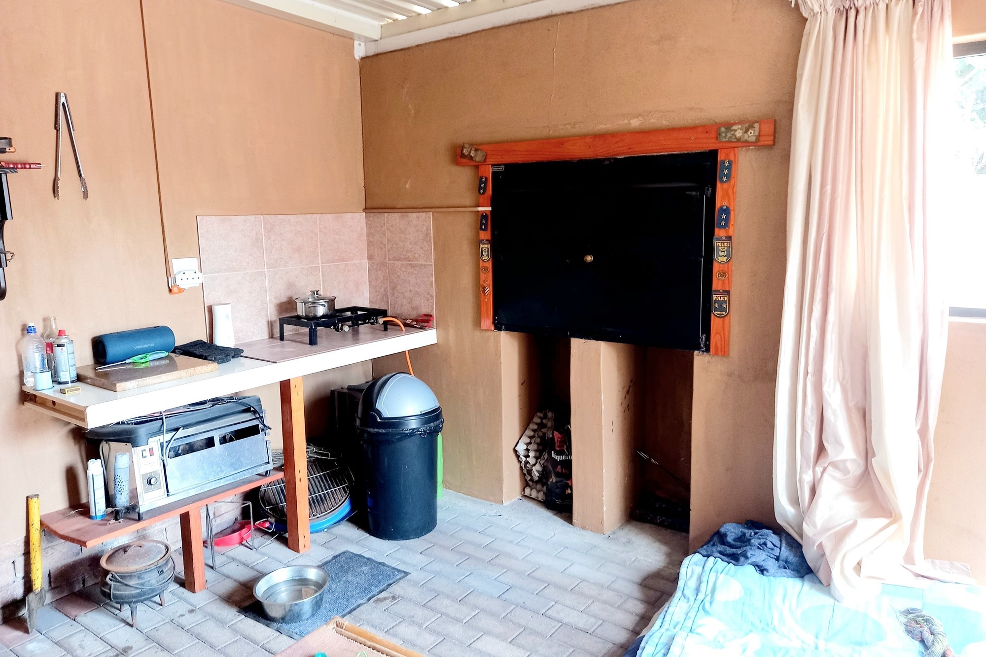 Entertainment & Outdoor SpaceBraai area with a built-in braai, offering an ideal space for socializing. Door opens to a paved backyard, perfect for outdoor enjoyment.
