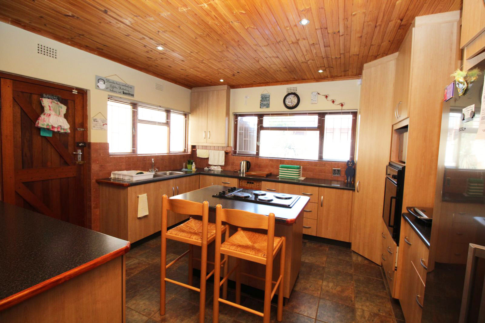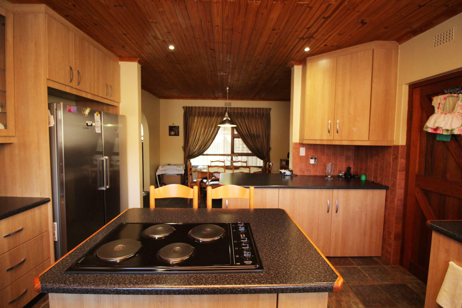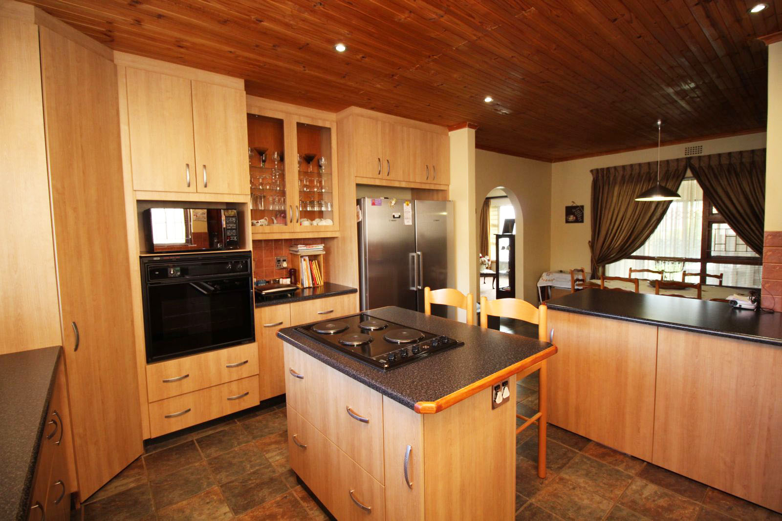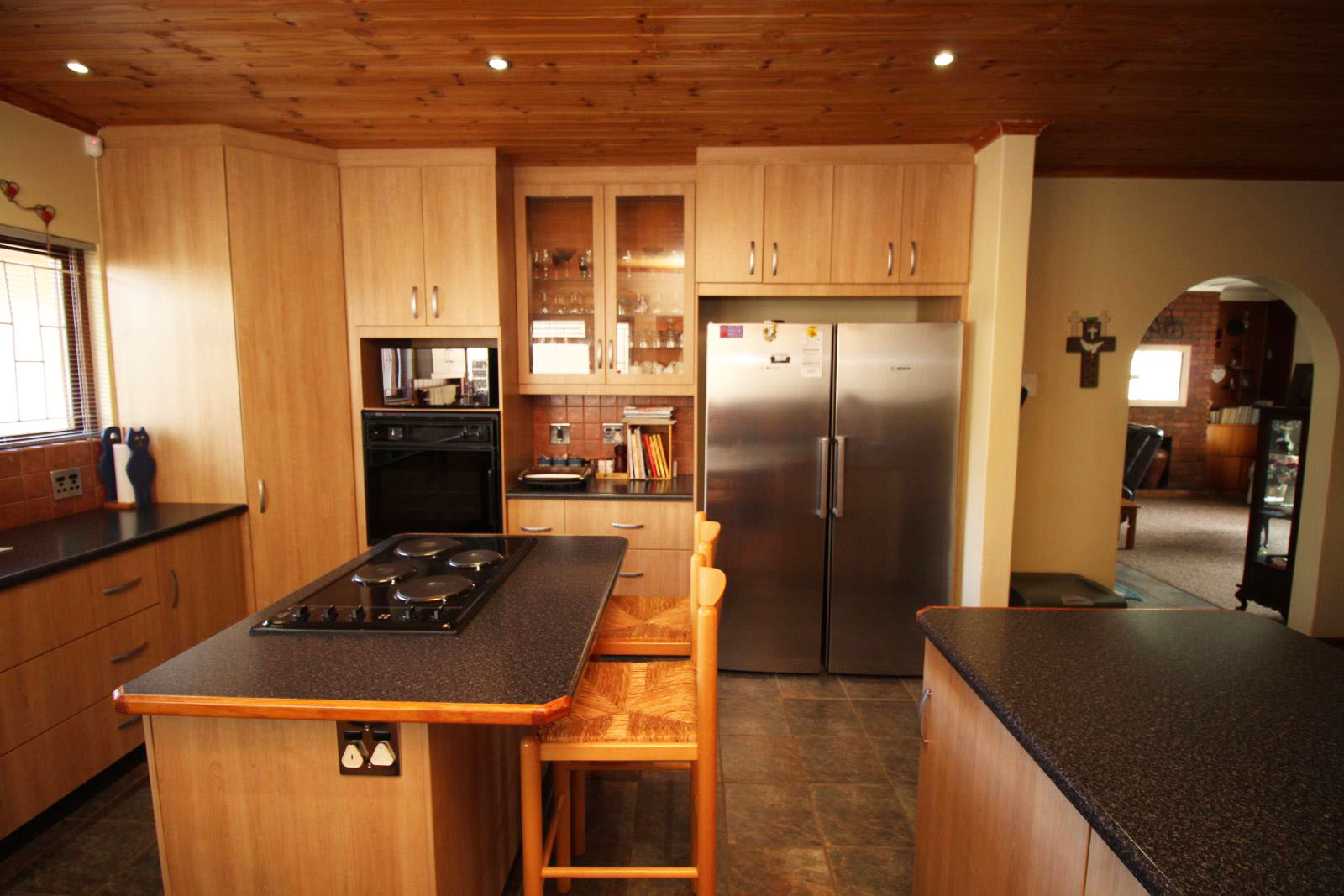 Adjacent to the lounge is the open-plan dining area and gourmet kitchen, both enhanced by beautiful notti pine ceilings. The kitchen is well-appointed with ample built-in cupboards, including a generous corner pantry, fitted blinds, washing machine and dishwasher points inside the copbaords, an island breakfast nook with hob, and a built-in oven just below eye level.