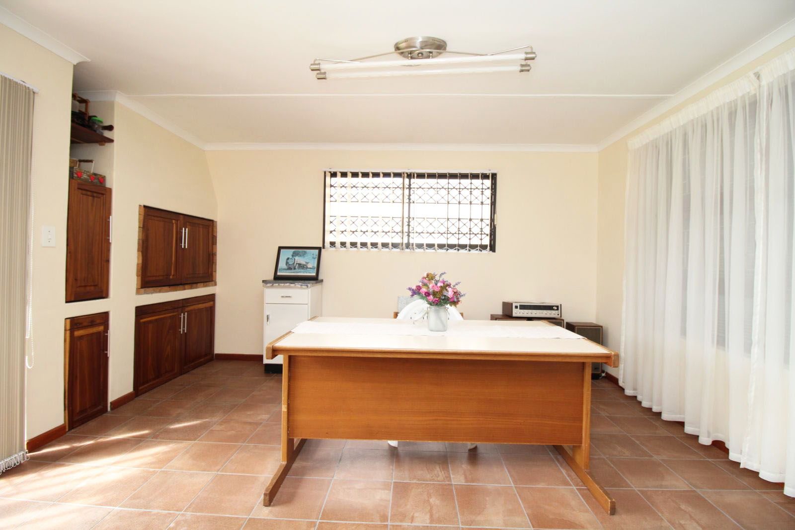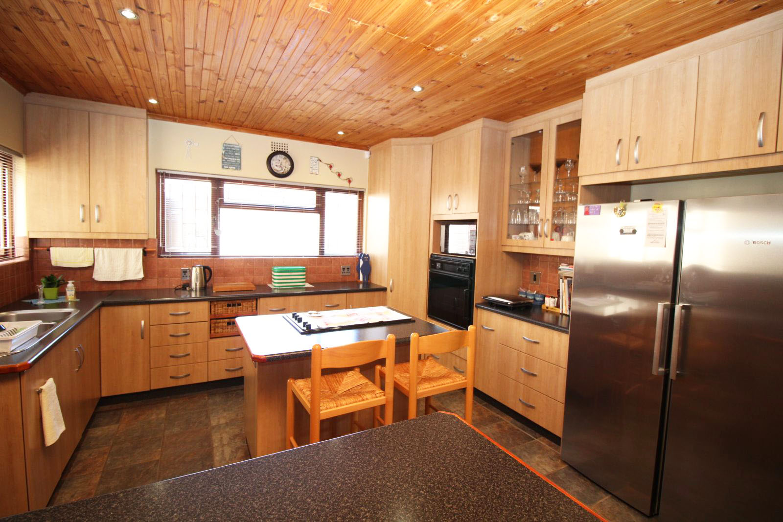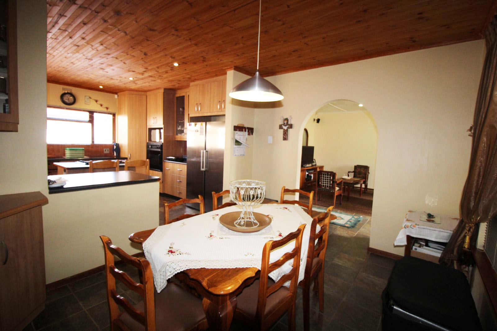 Adjacent to the lounge is the open-plan dining area and gourmet kitchen, both enhanced by beautiful notti pine ceilings. The kitchen is well-appointed with ample built-in cupboards, including a generous corner pantry, fitted blinds, washing machine and dishwasher points inside the copbaords, an island breakfast nook with hob, and a built-in oven just below eye level.