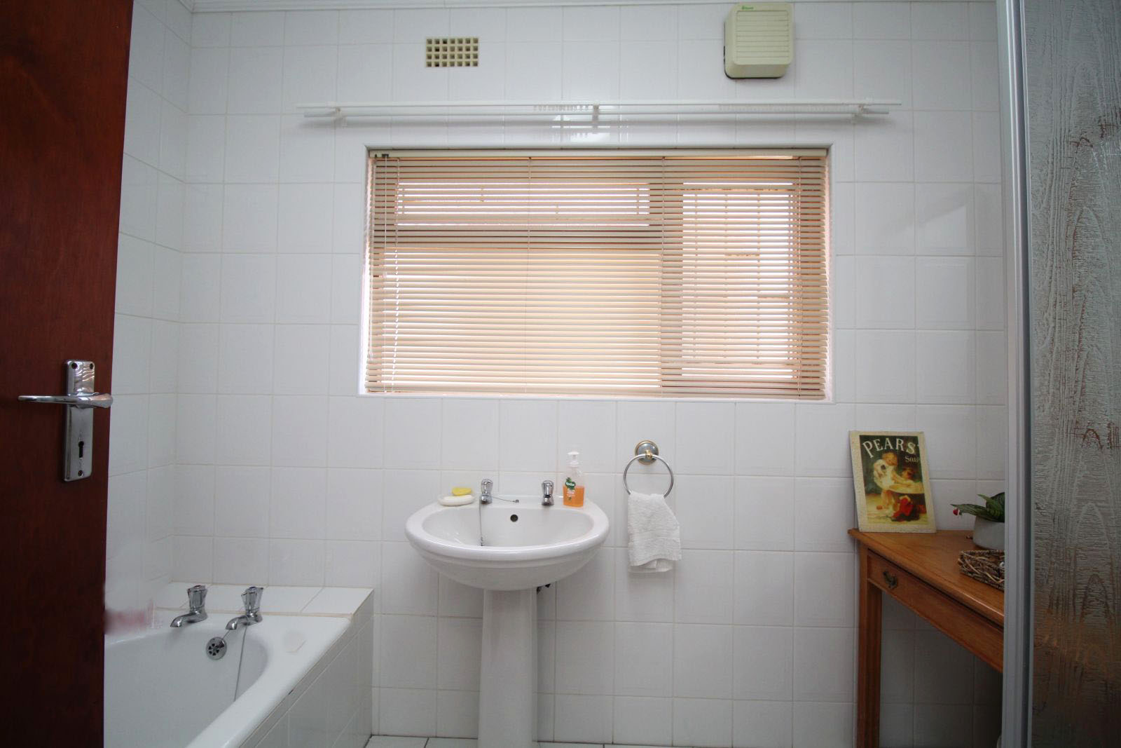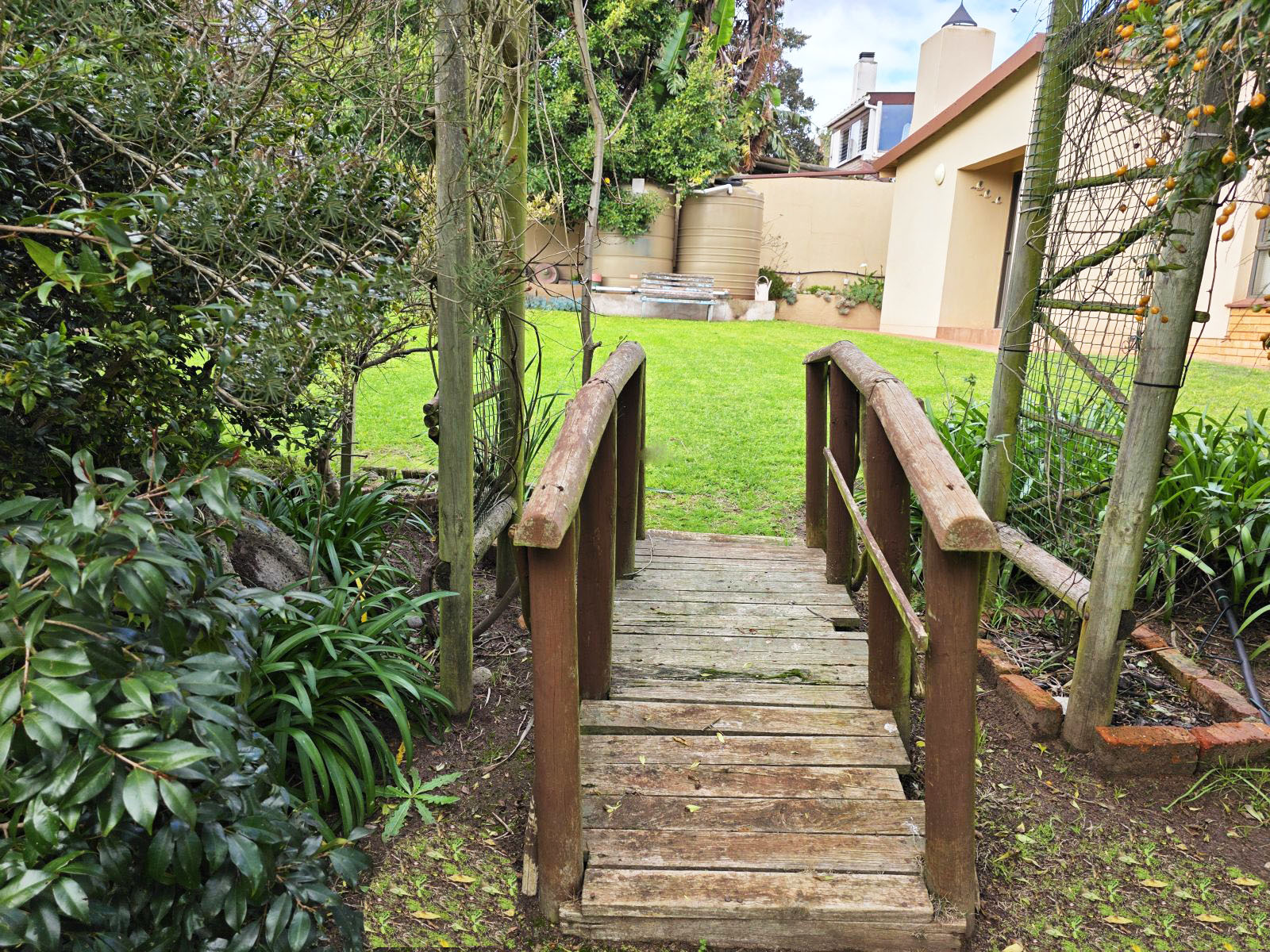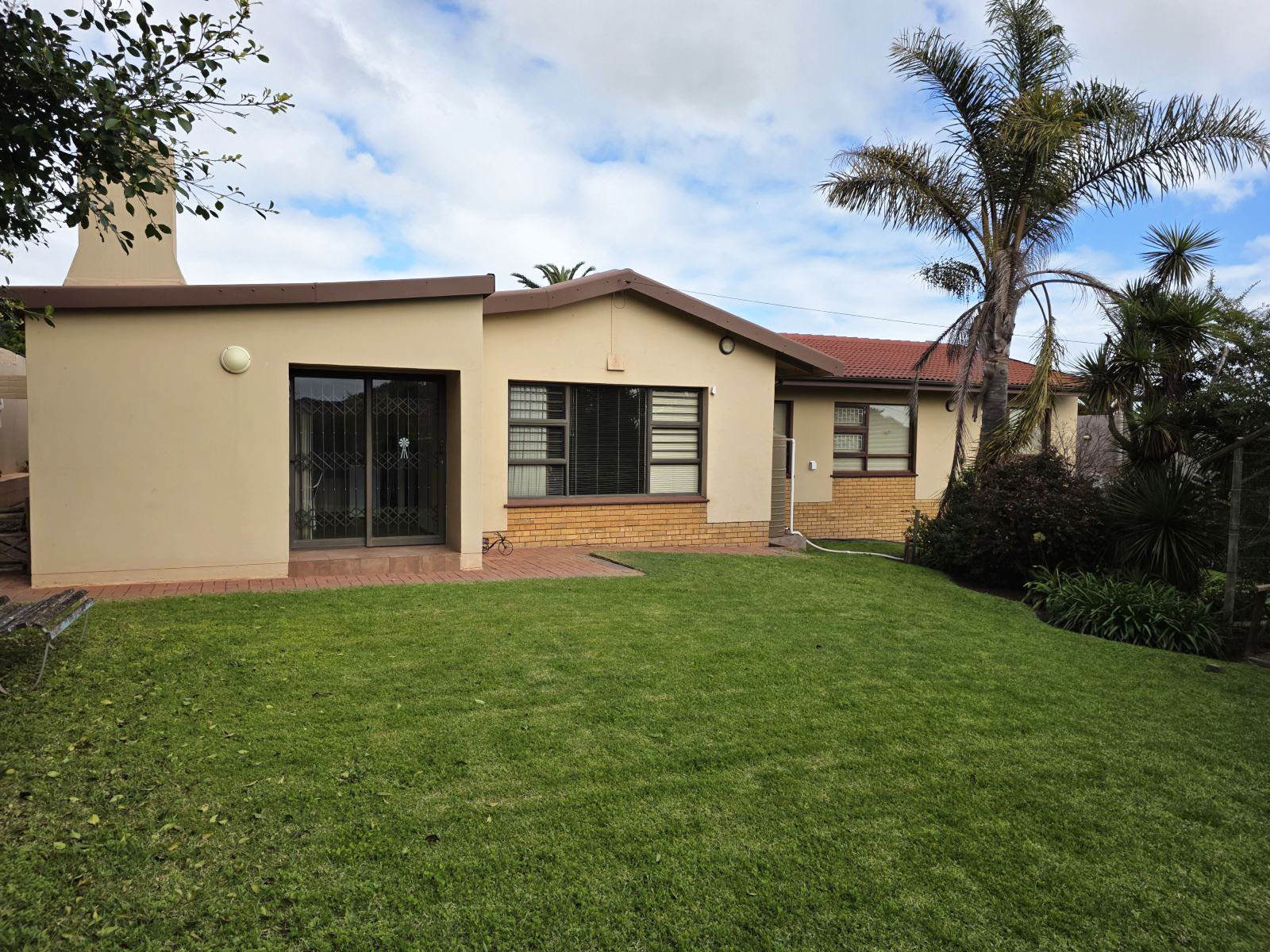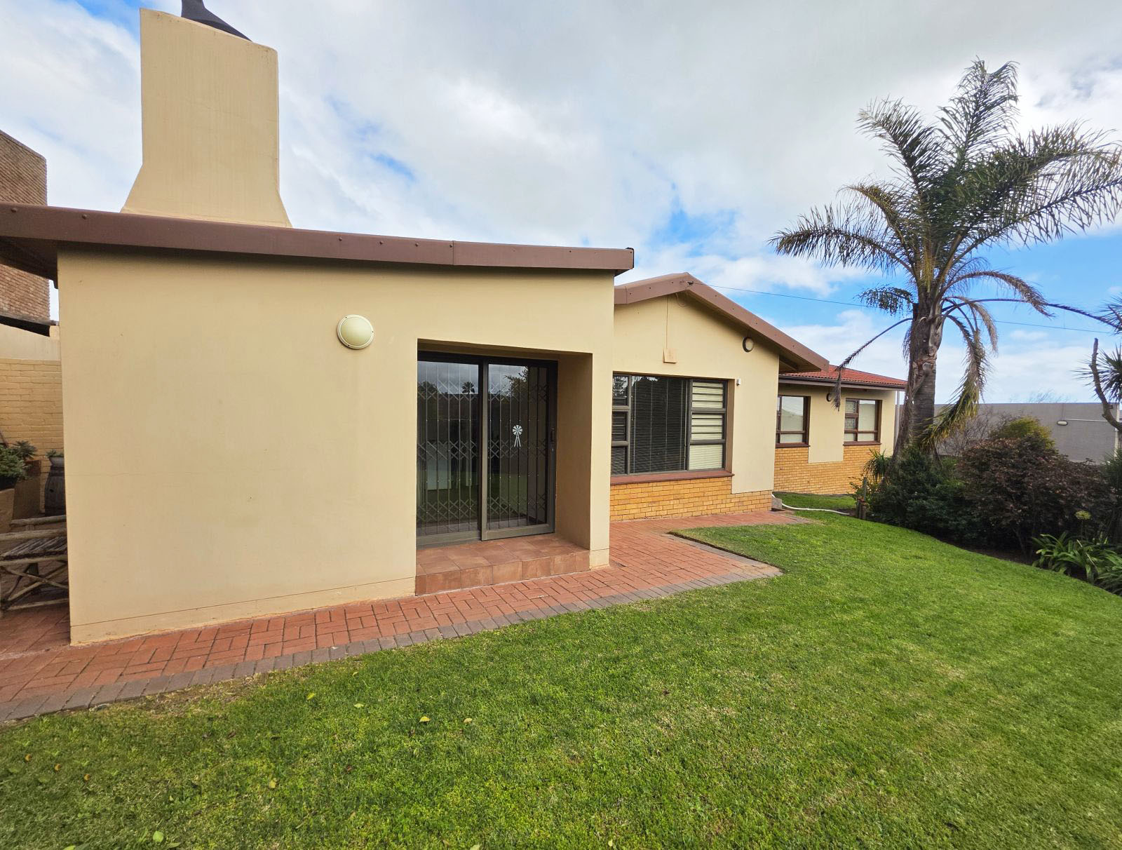 The lounge features a rustic facebrick gas fireplace, flanked by solid wood shelving and cupboards, creating a warm and inviting ambiance. From here, sliding doors lead to a tiled braai room—an entertainer’s dream—boasting solid wood finishes, built-in cupboards, and seamless flow to the expansive, lush backyard via aluminium sliding doors. The large garden is perfect for children and pets, and offers ample space to install a swimming pool—ideal for a growing family.