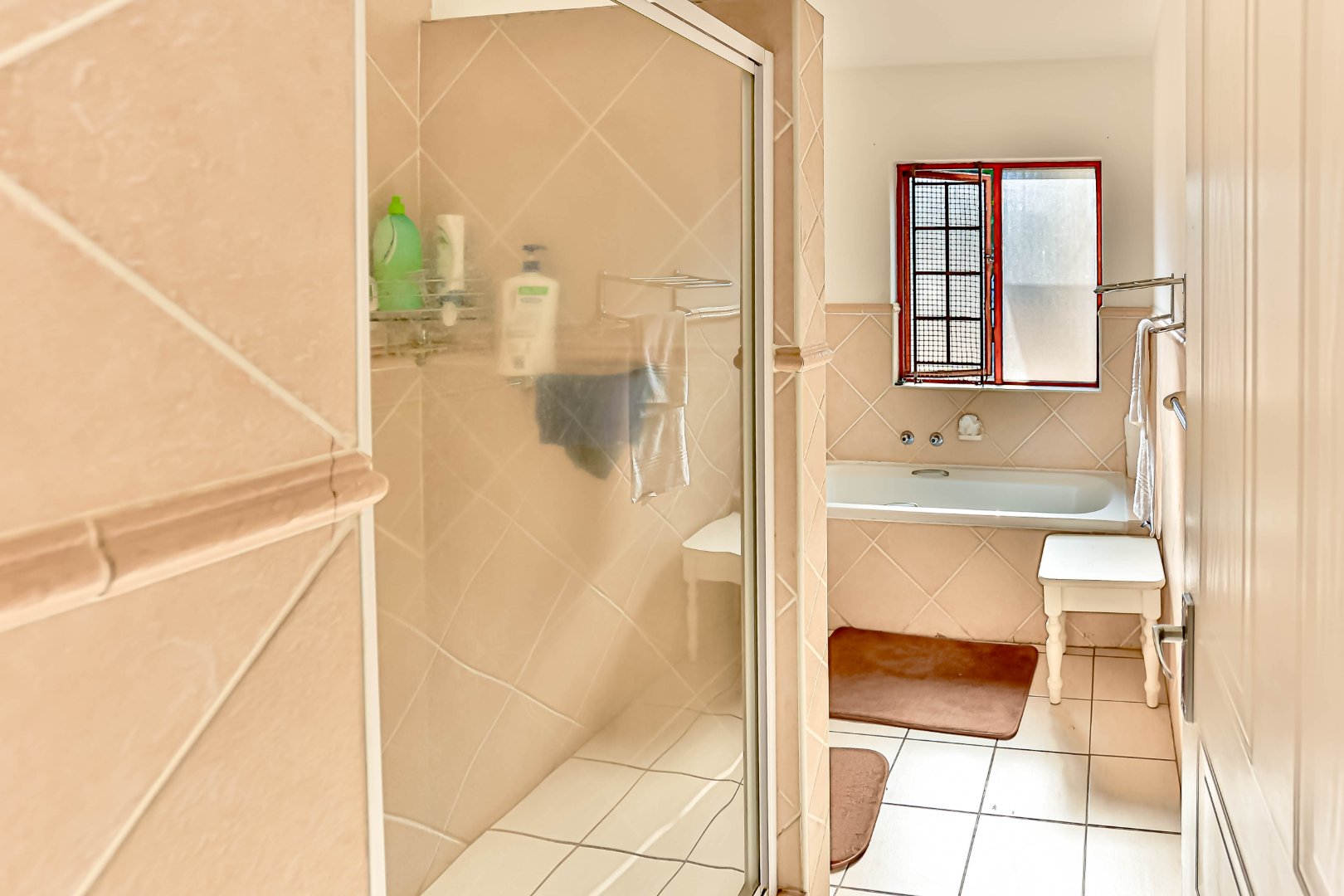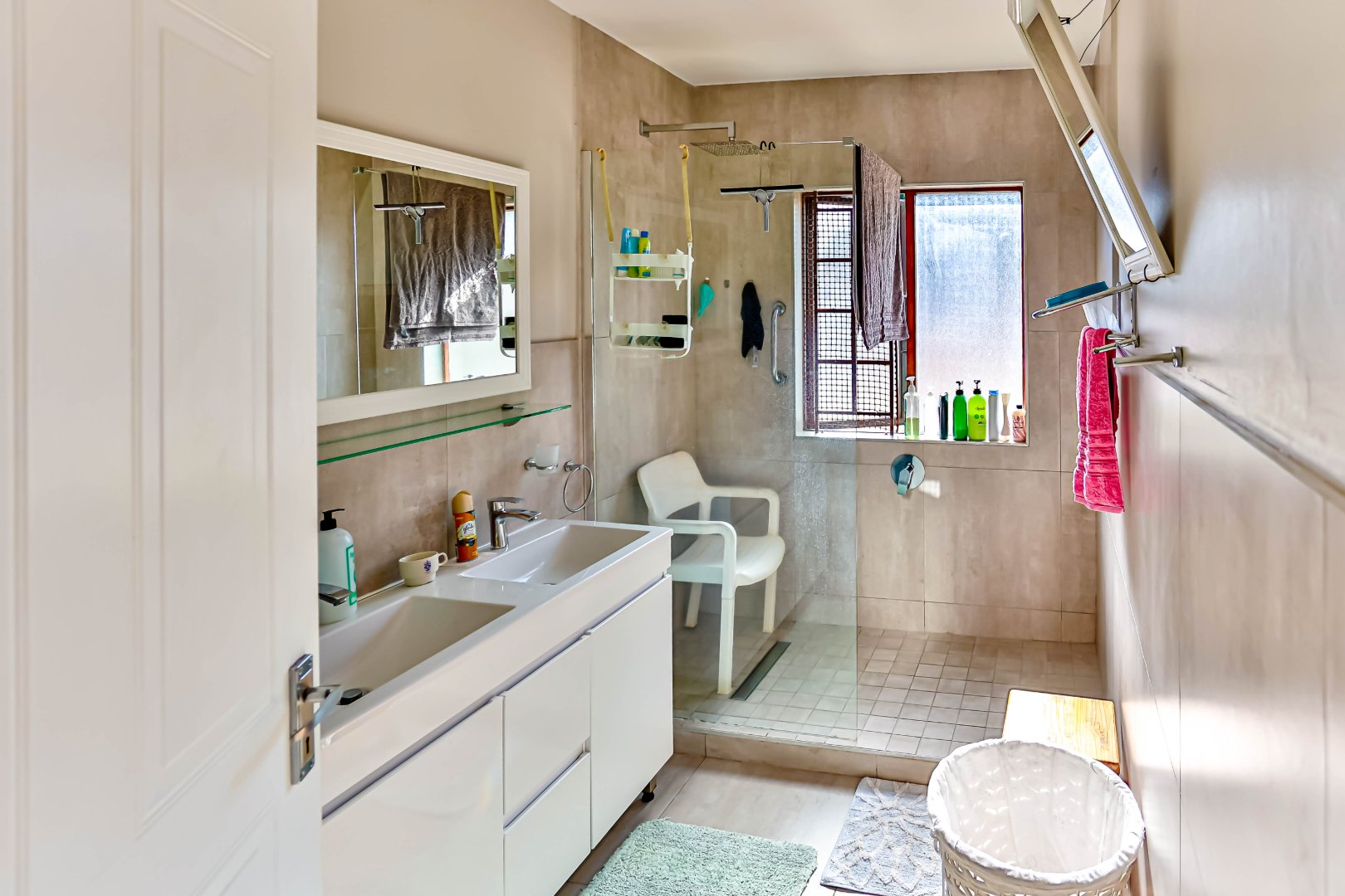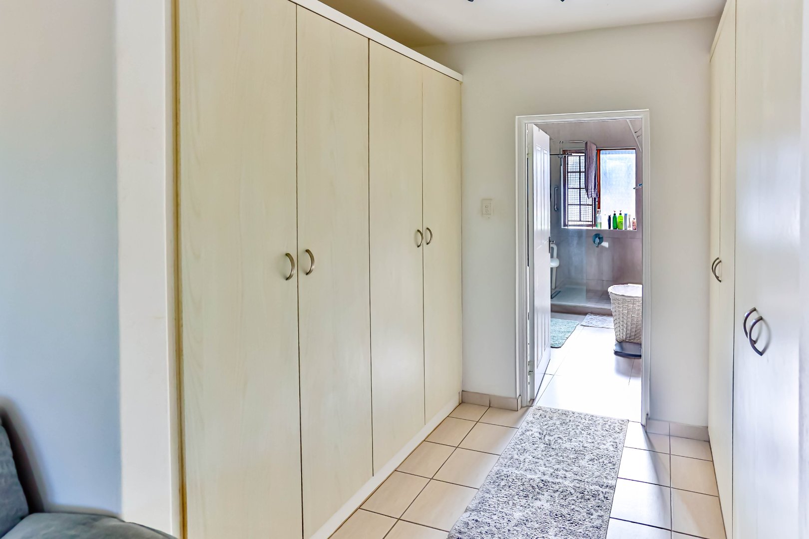 All three bedrooms are well-sized and fitted with built-in cupboards. The main bedroom includes an ensuite bathroom, while the second bathroom conveniently services the remaining bedrooms. The ground-floor position provides easy access, making the home suitable for families, retirees, or those seeking step-free living.