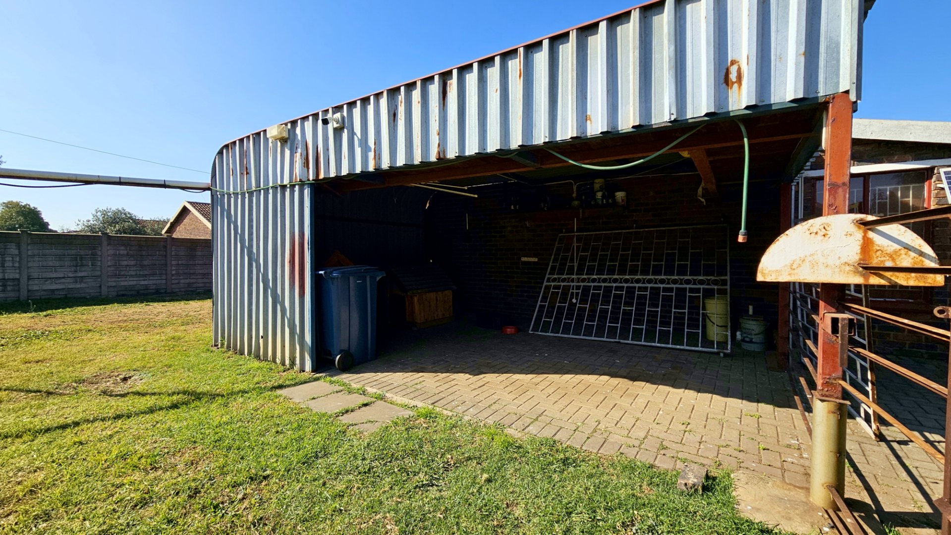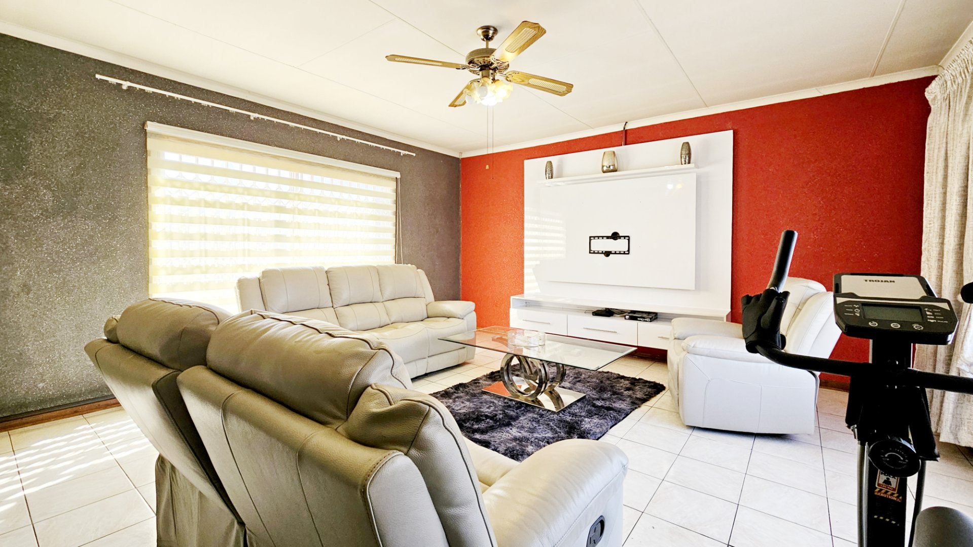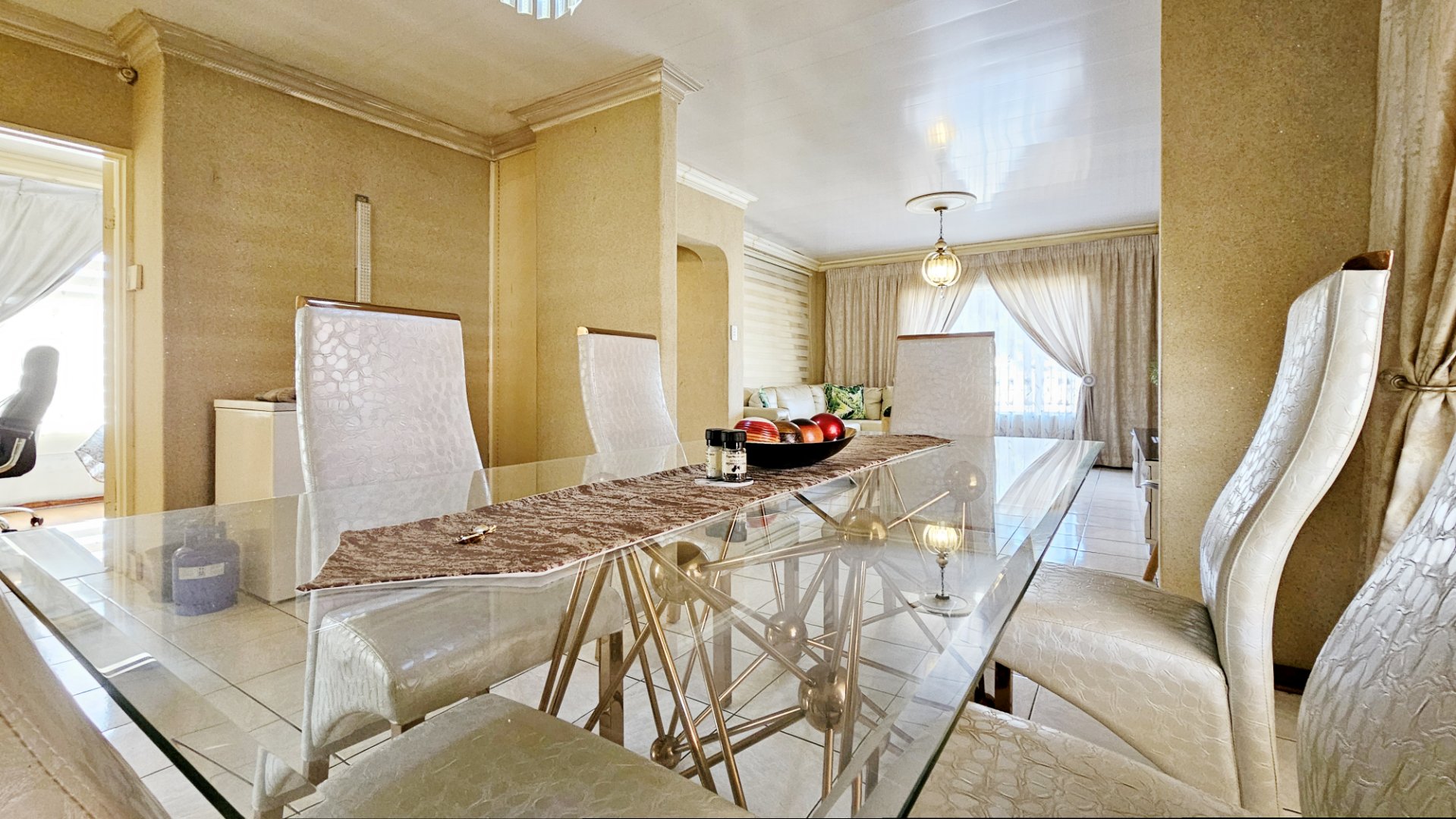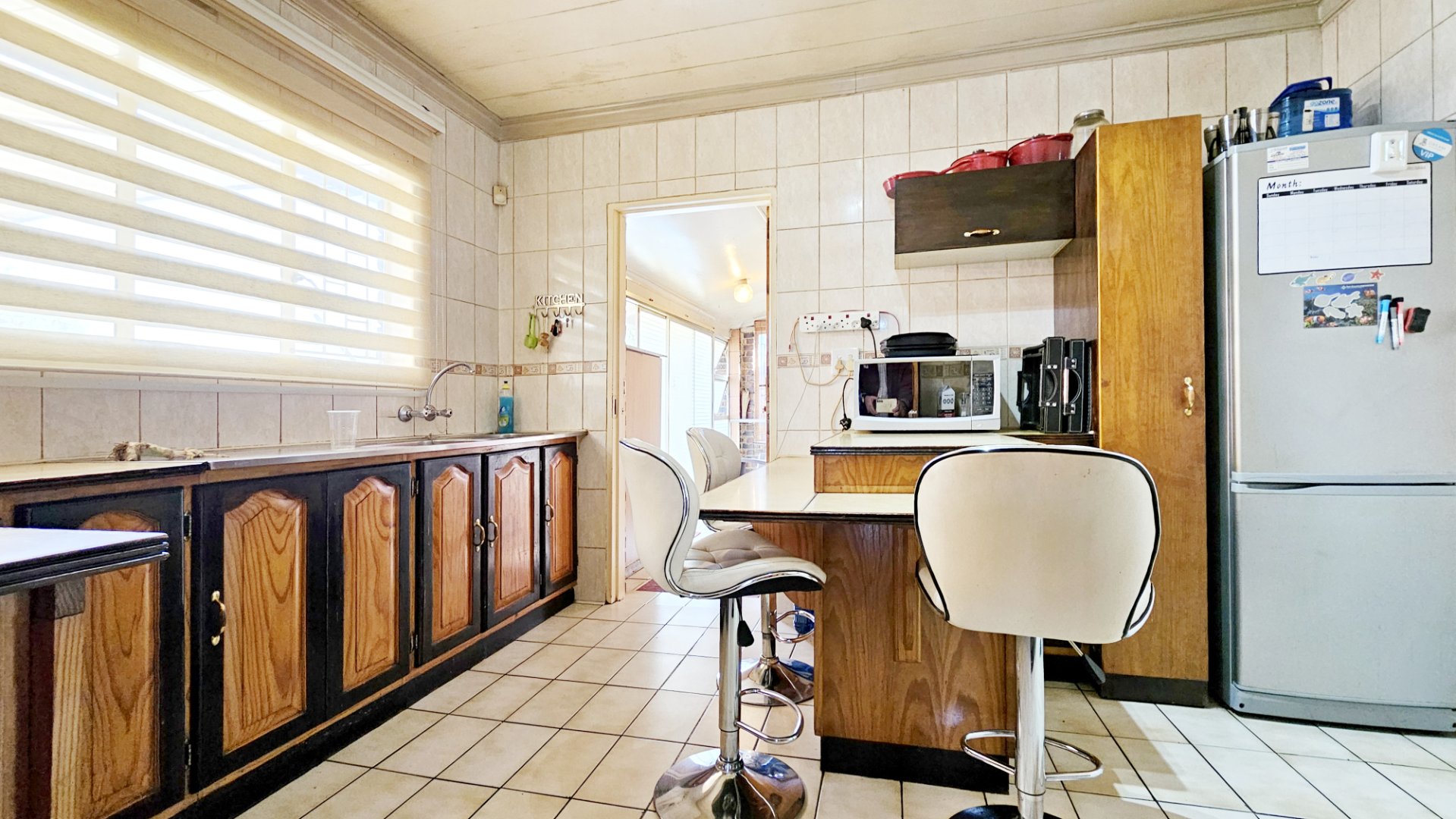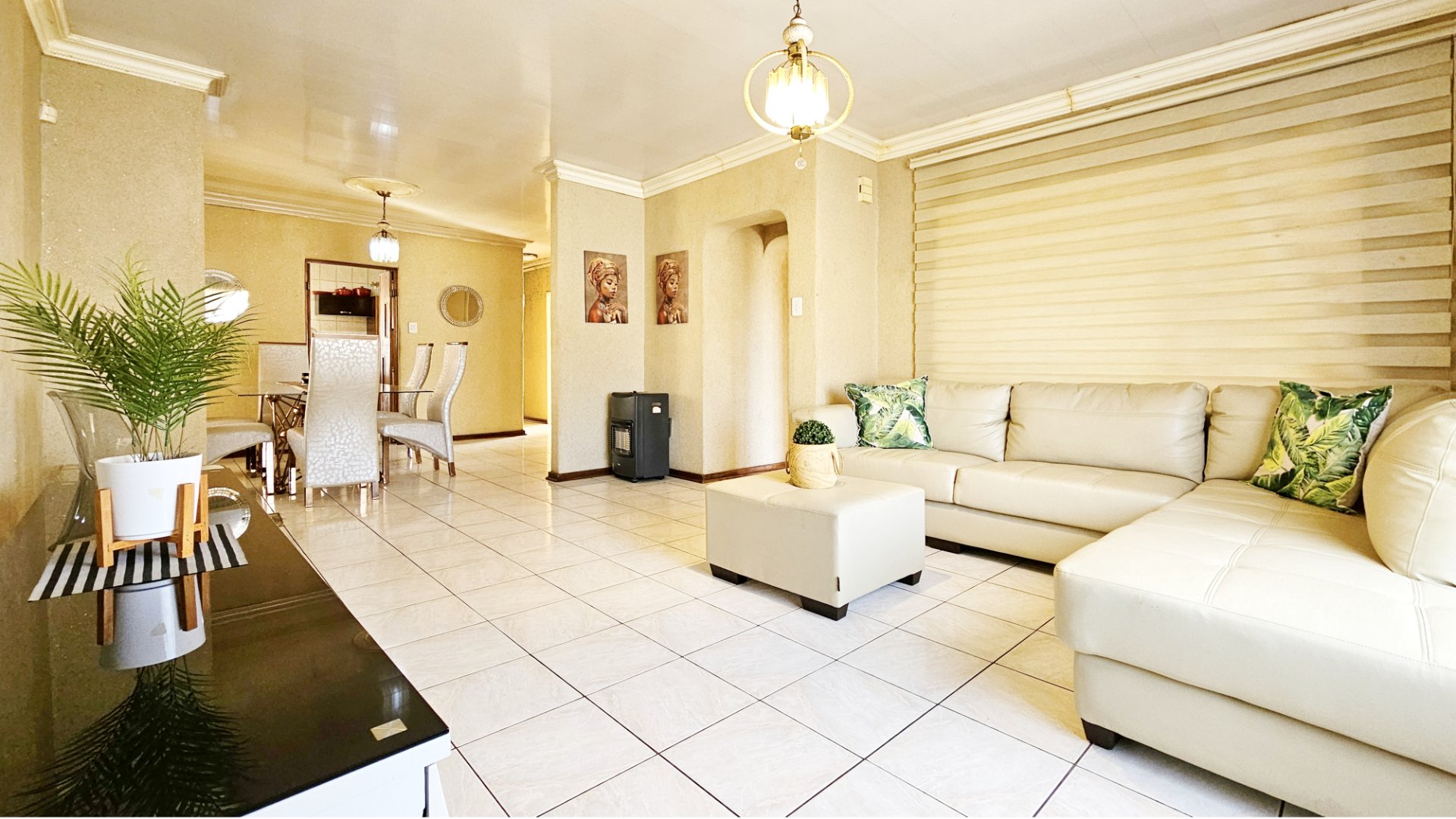 The interior of this property has a modern feel, with beautiful floor tiles throughout as well as PVC ceilings. Accommodation is surprisingly spacious, boasting a large lounge, a dining room and a huge family / TV room with a wall-mounted back panel with a TV bracket. It offers thee North-facing bedrooms, two bathrooms, and a neatly fitted eat-in kitchen with a separate scullery / laundry area.