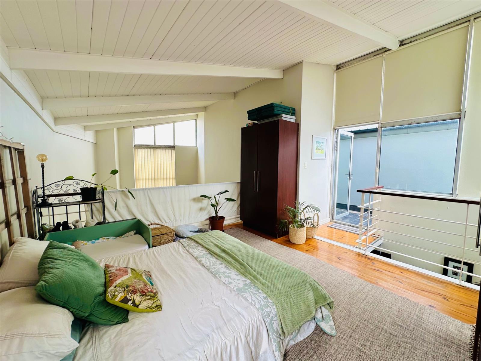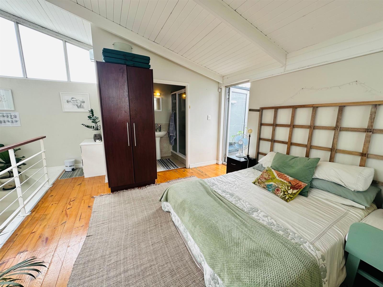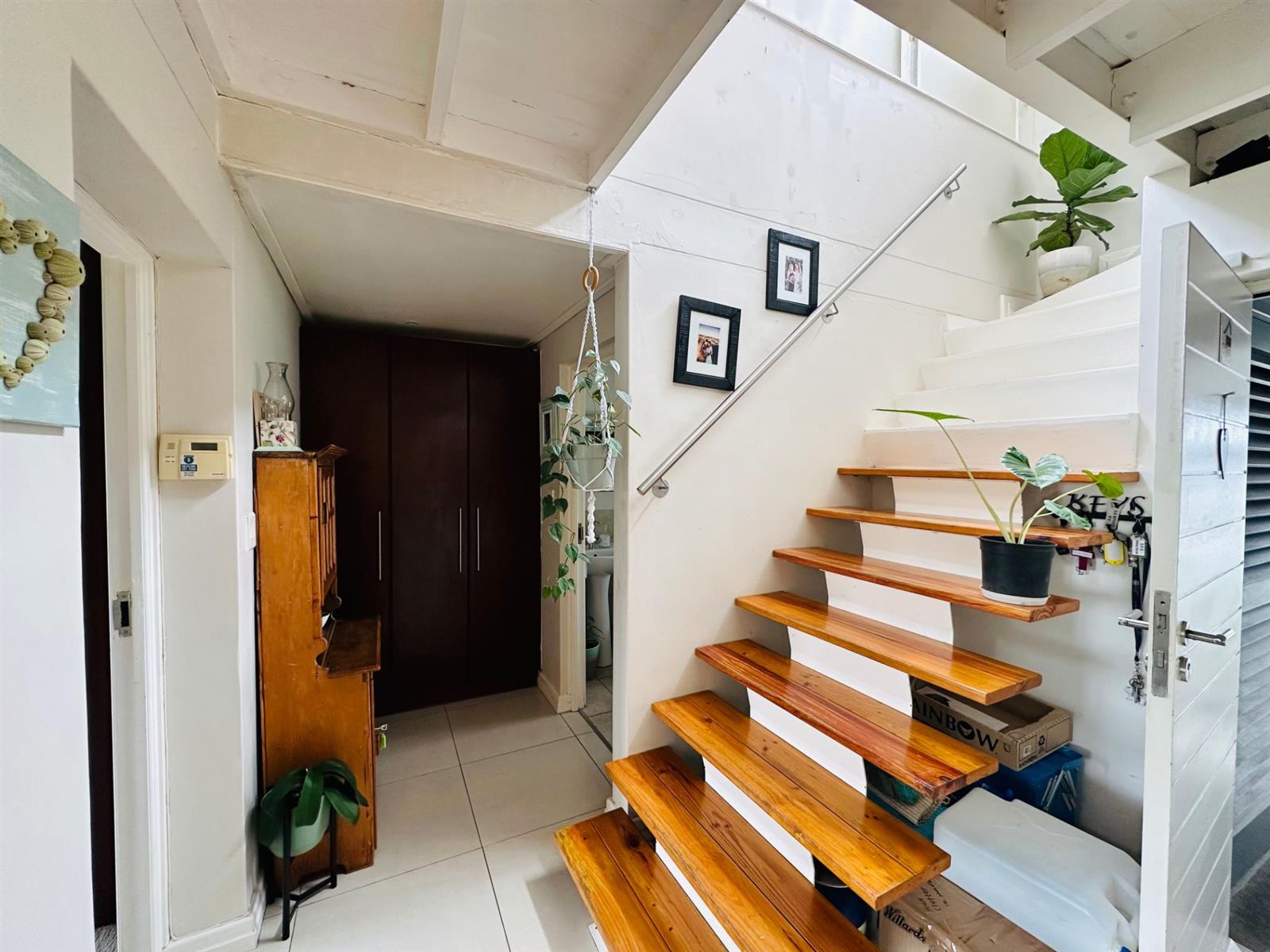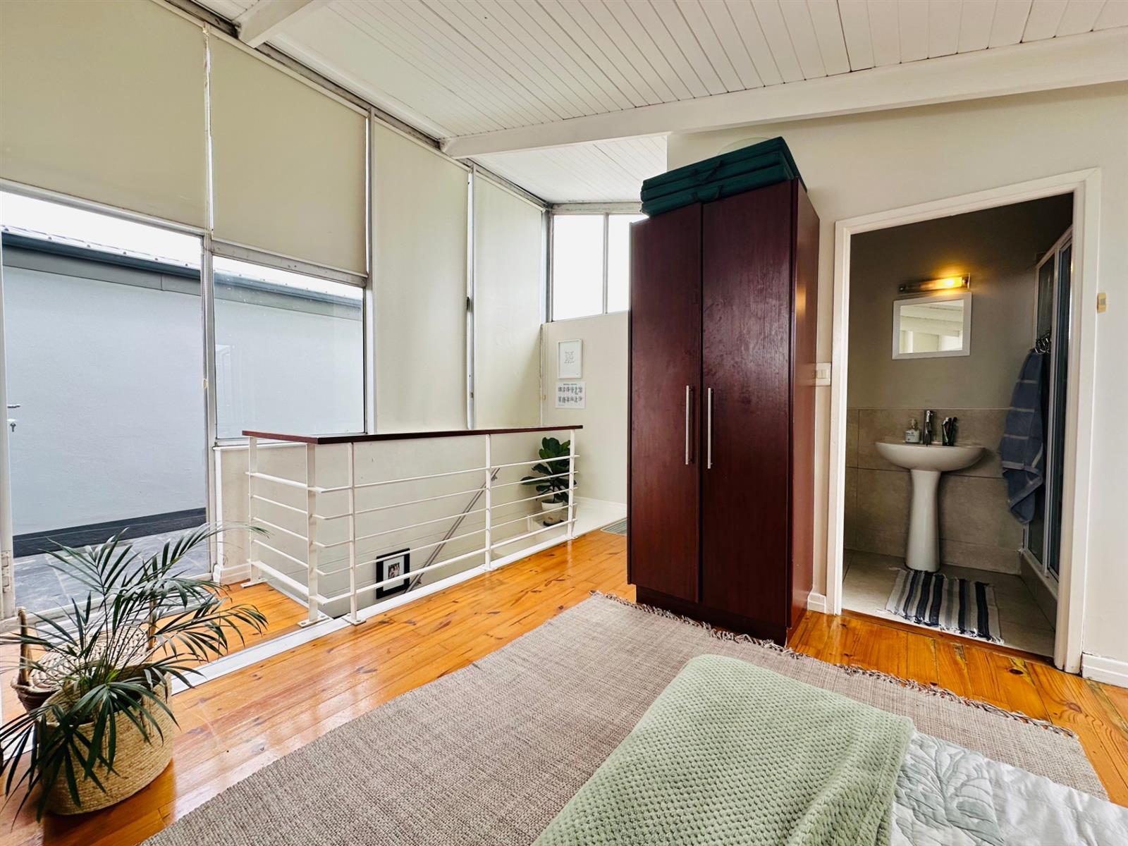 Upstairs, a floating staircase leads to the main bedroom which has a couple of built in cupboards as well as a shower en-suite and not one but two, private balconies flanking the room. The larger balcony has a built-in-braai and some decent southerly views and the smaller balcony is like a “private rooftop drying yard”, which houses the wash line and some plant life.