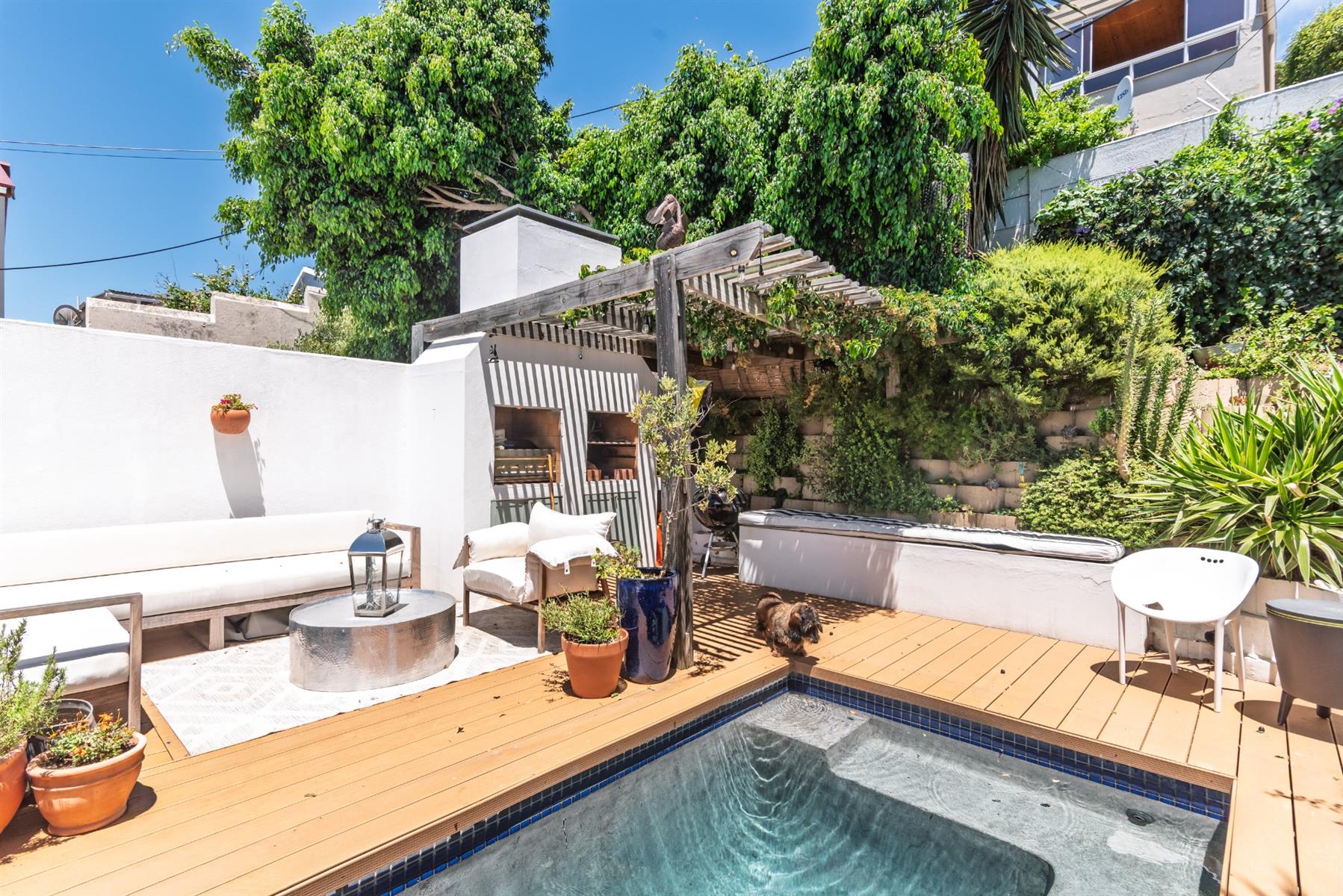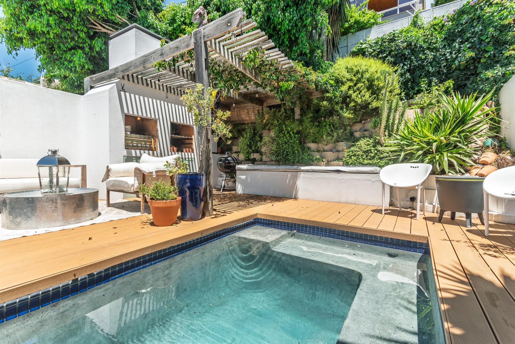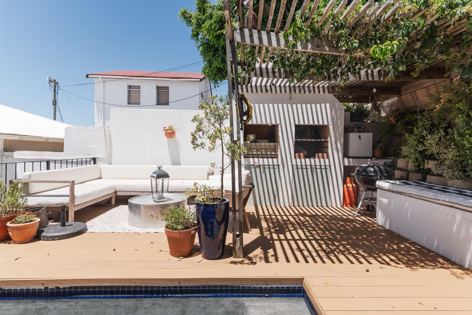 Outdoor living is a standout feature. A wind-sheltered, decked entertainment area with both a built-in braai and a gas braai flows to a heated pool, creating an elevated outdoor level perfect for entertaining or unwinding. Additional conveniences include deck storage for braai wood and equipment, an outdoor storeroom, and a small, stylish, low-maintenance garden currently enhanced with artificial grass.