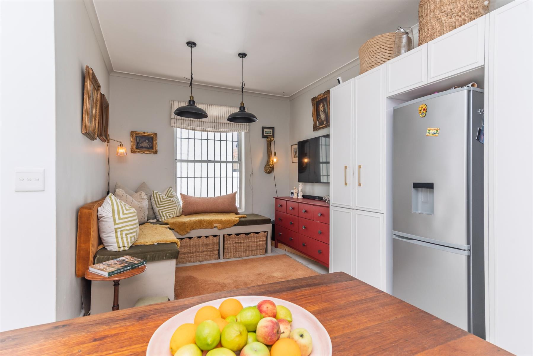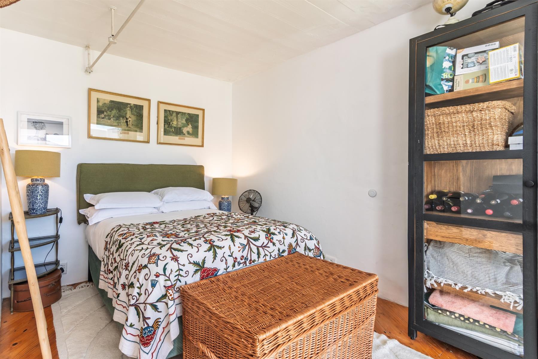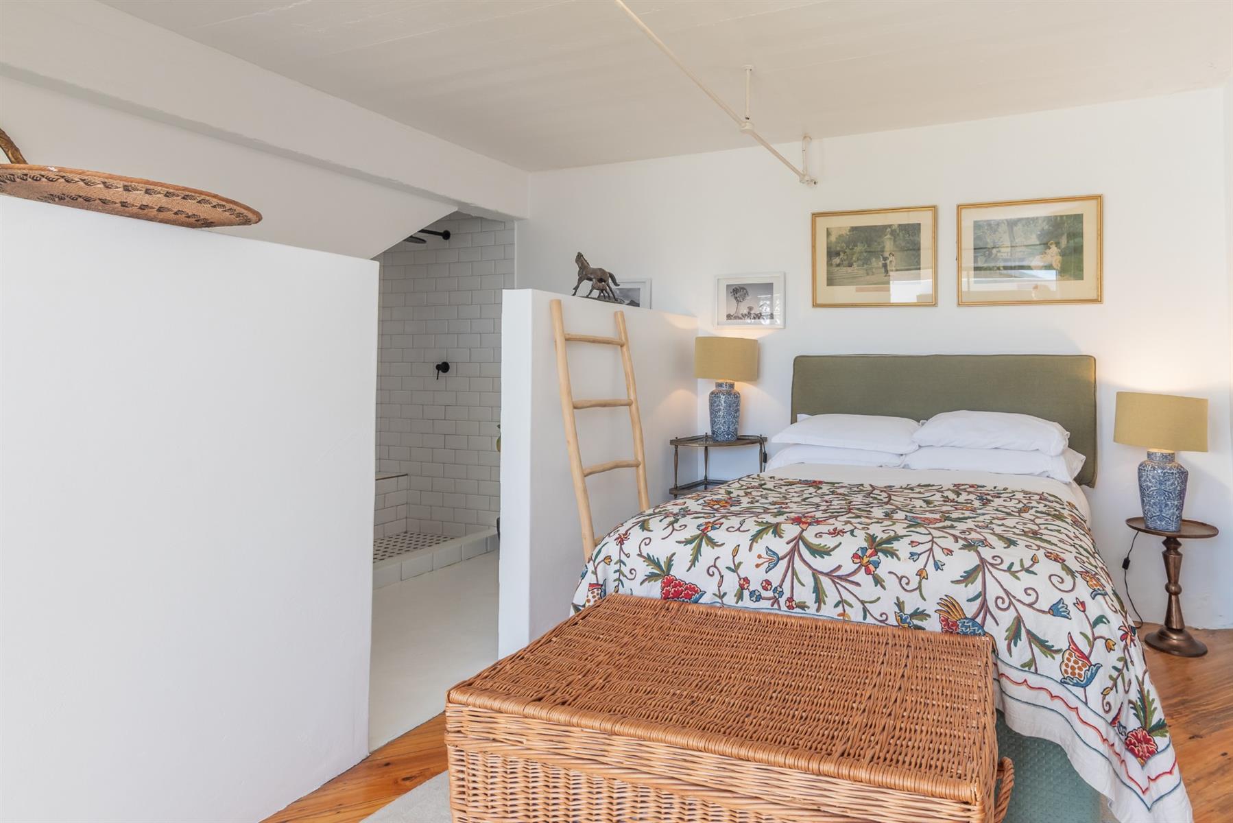 Accommodation comprises three well-proportioned bedrooms, two of which are fitted with built-in cupboards, and two thoughtfully designed bathrooms. Throughout the home, character features elevate daily living, including antique tile niches, a practical low foot-cleaning tap in the shower, adjustable light fittings, basket storage spaces and cleverly integrated storage solutions.