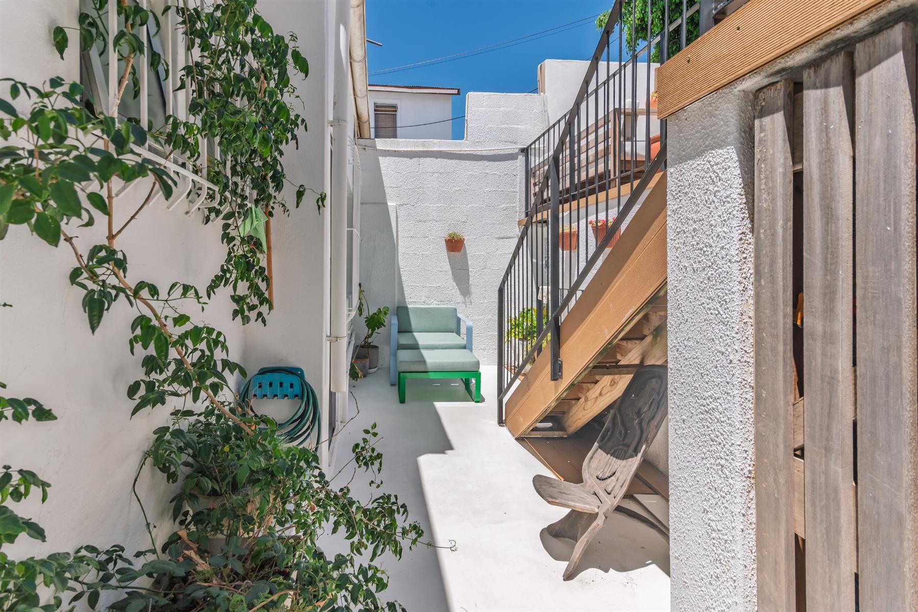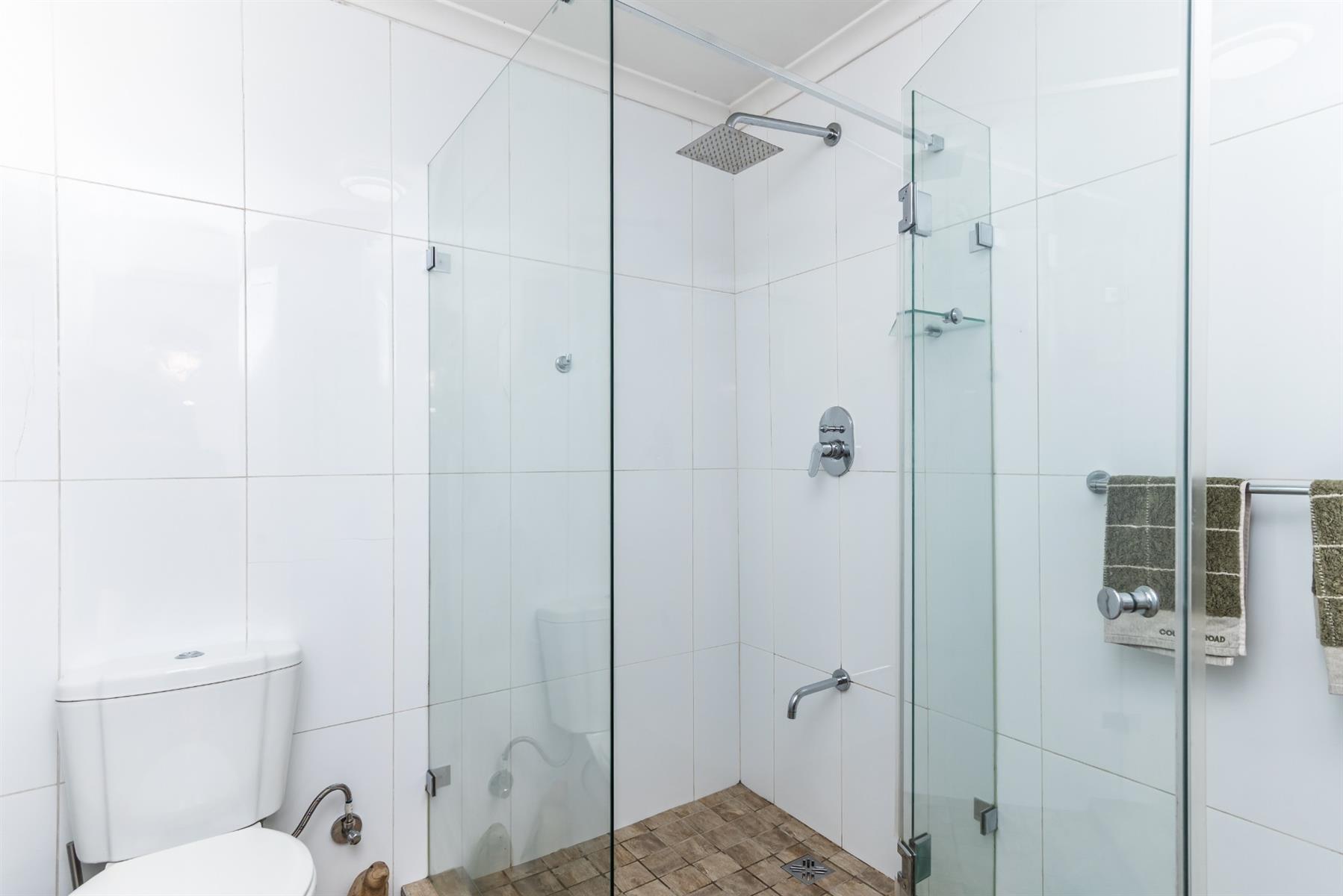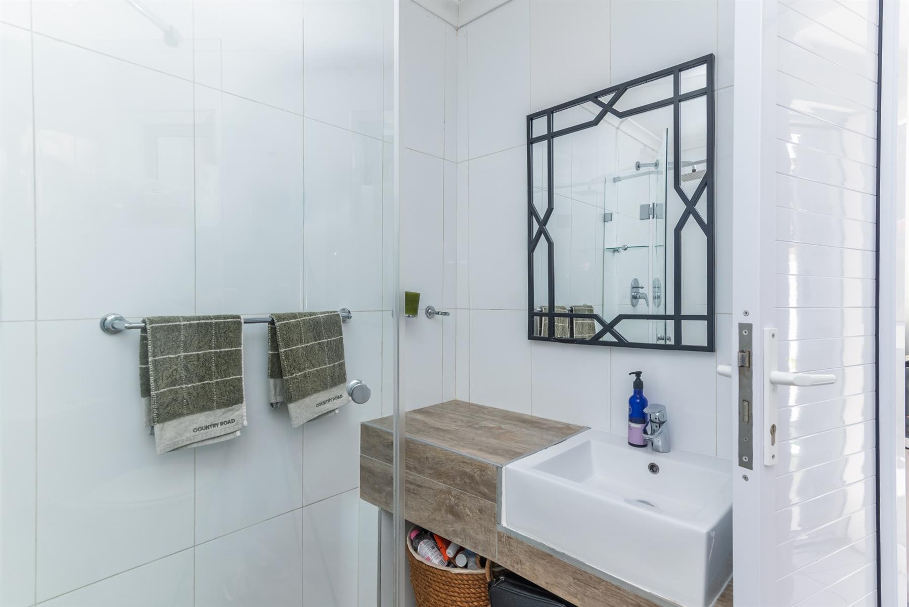 Accommodation comprises three well-proportioned bedrooms, two of which are fitted with built-in cupboards, and two thoughtfully designed bathrooms. Throughout the home, character features elevate daily living, including antique tile niches, a practical low foot-cleaning tap in the shower, adjustable light fittings, basket storage spaces and cleverly integrated storage solutions.