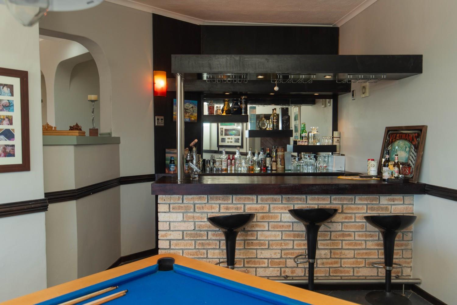 Combined TV and entertainment room with frameless folding glass doors, opening to patio. Indoor entertainment spaces featuring a gas braai, built-in bars, and snooker/pool table area.