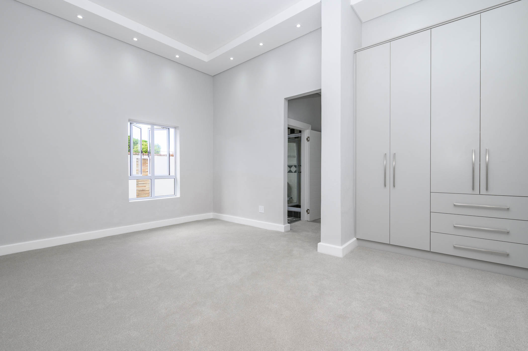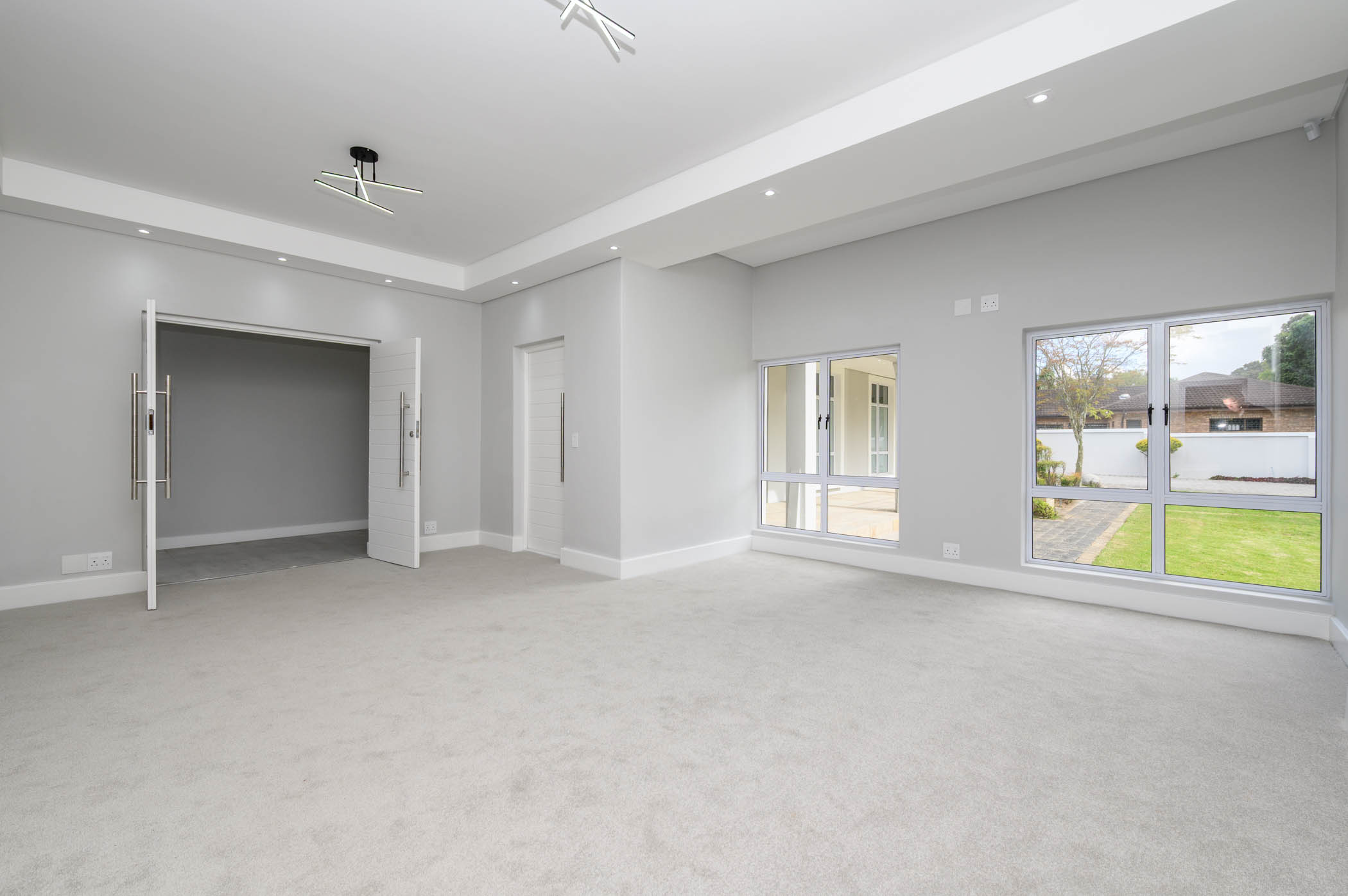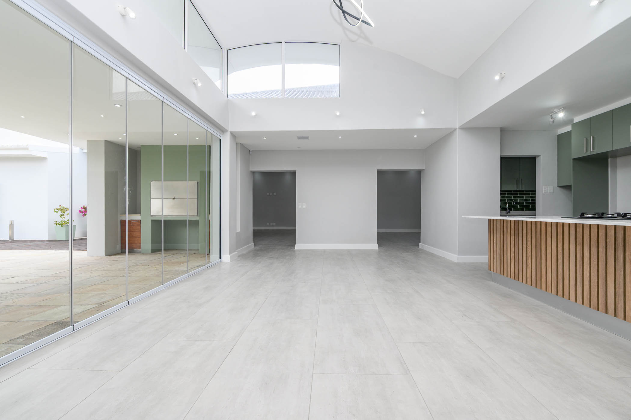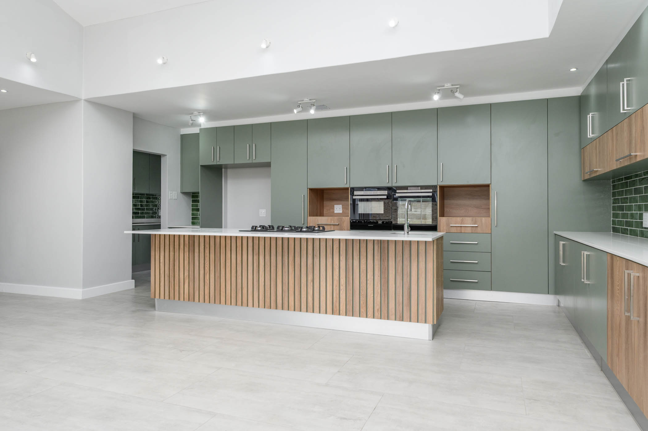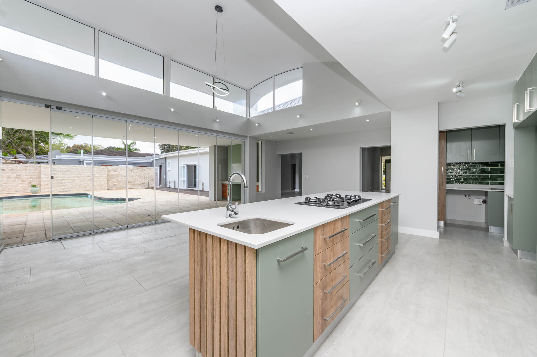 The heart of the home is the contemporary kitchen – a culinary haven that seamlessly connects to the covered braai and pool area through expansive stacker doors, creating an inviting indoor-outdoor flow. The kitchen is complemented by a separate scullery and a generous pantry, designed for both practicality and style.