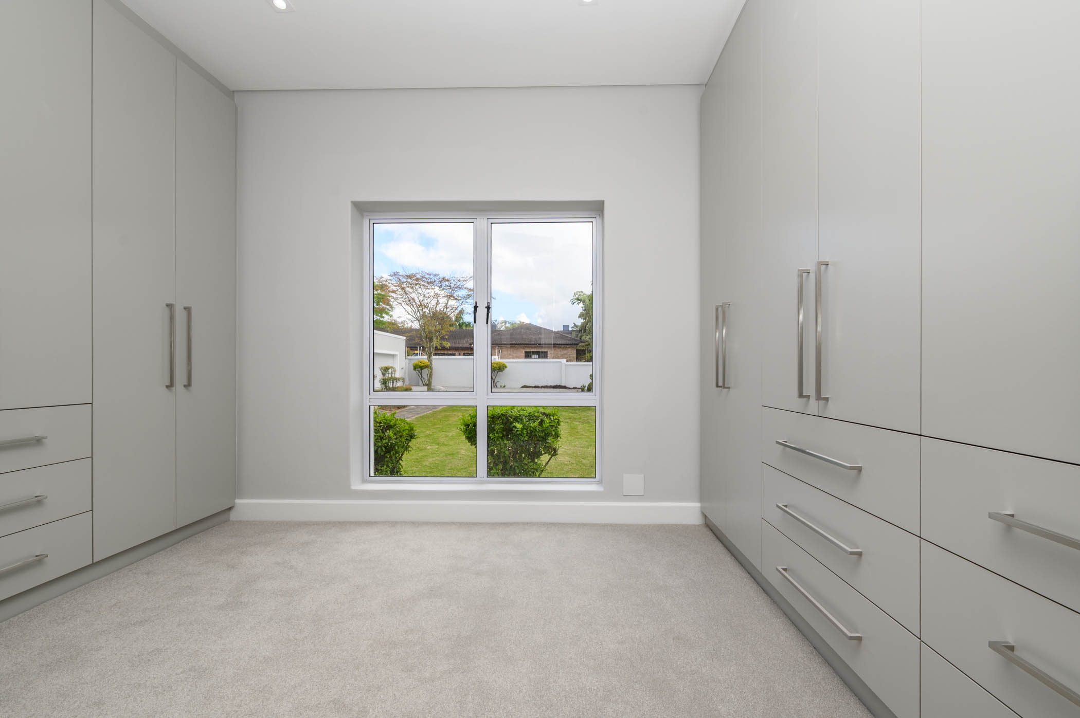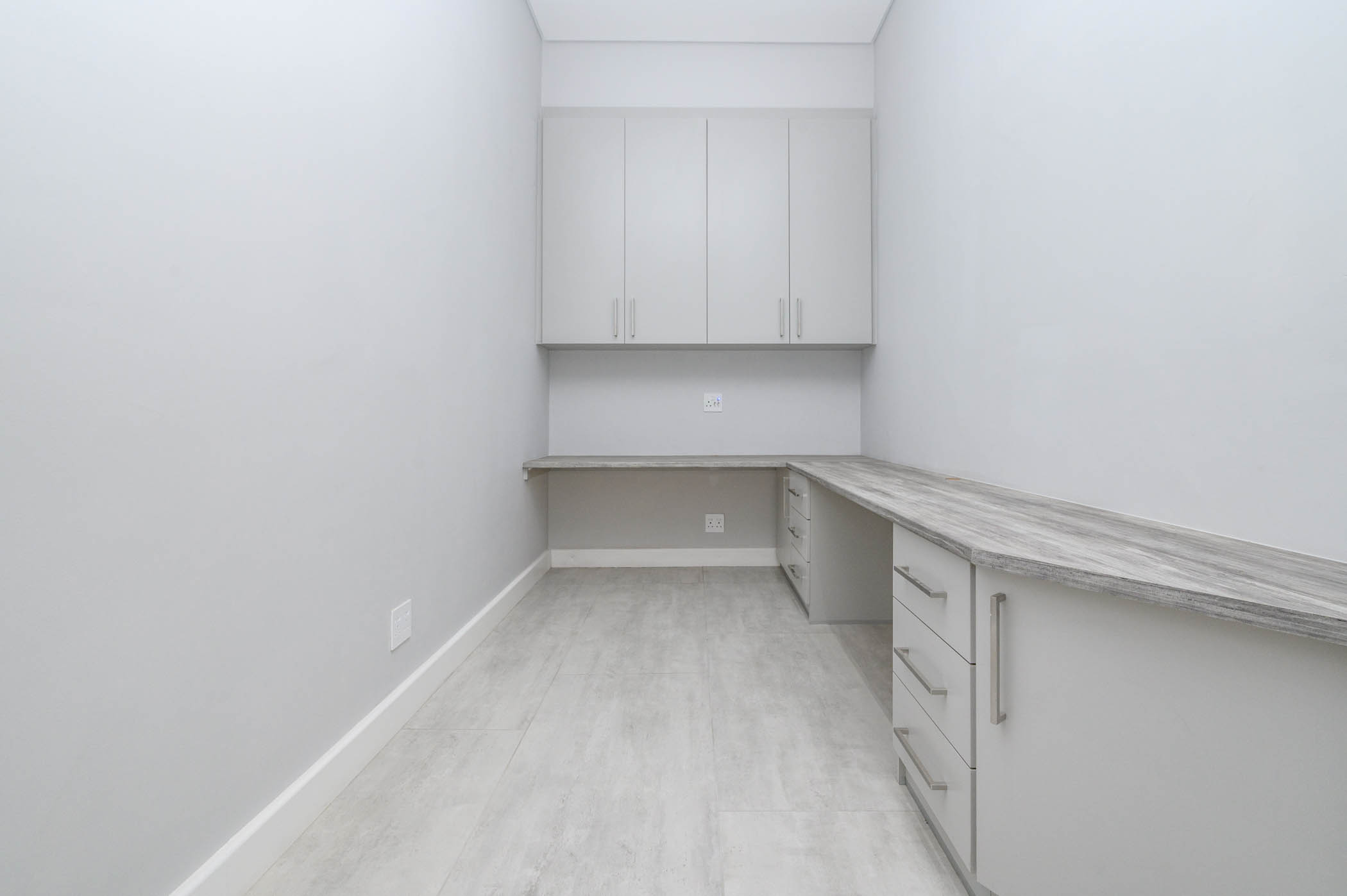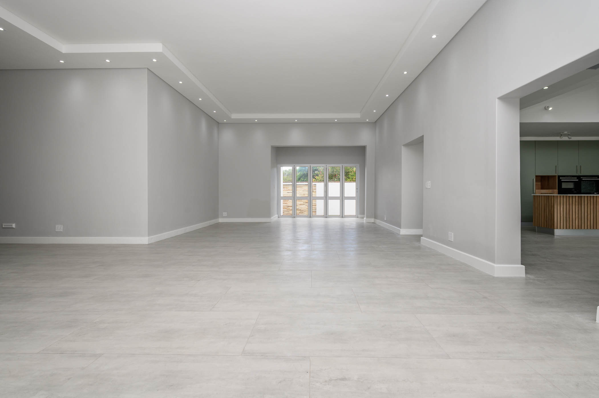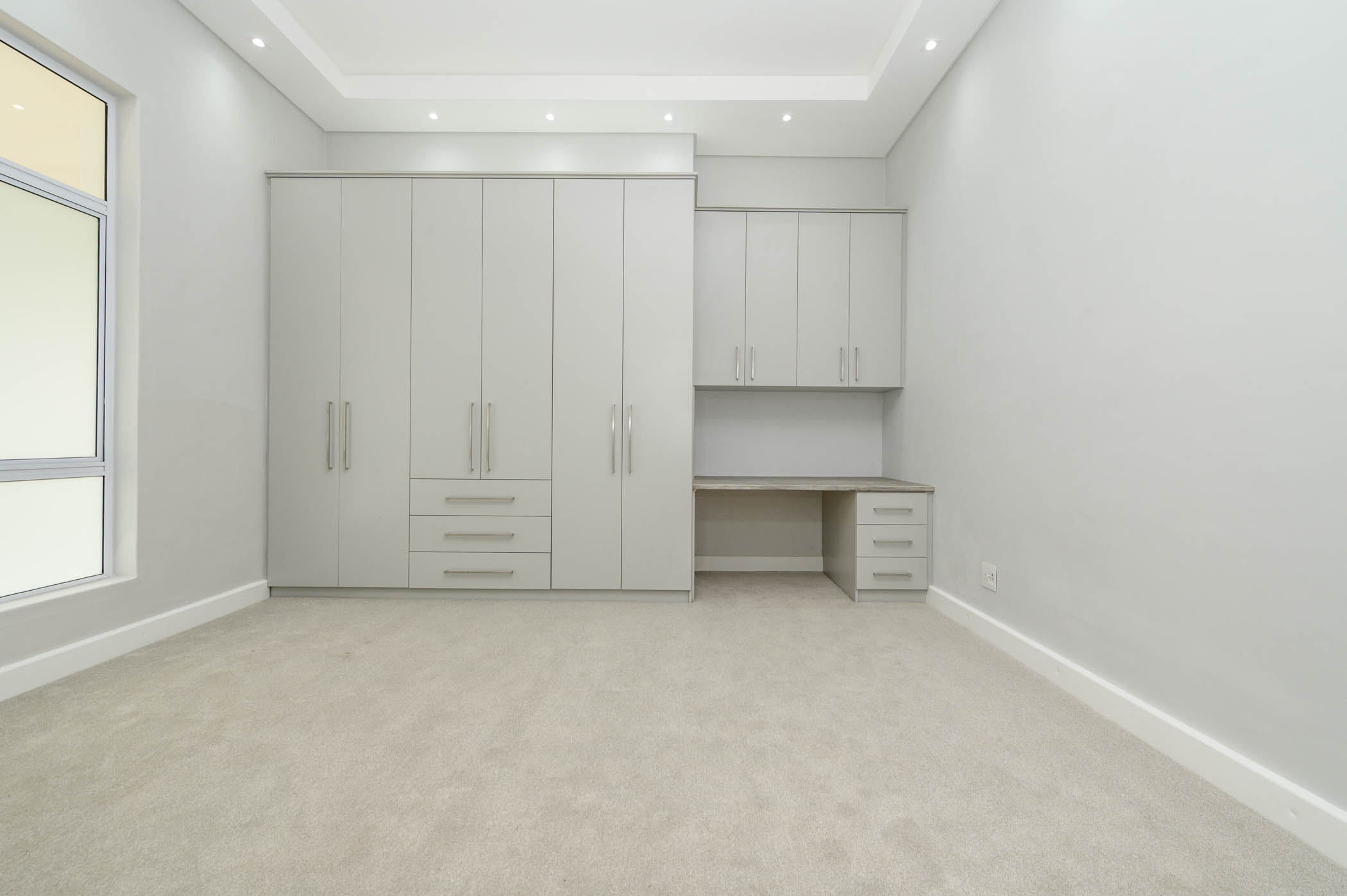 The heart of the home is the contemporary kitchen – a culinary haven that seamlessly connects to the covered braai and pool area through expansive stacker doors, creating an inviting indoor-outdoor flow. The kitchen is complemented by a separate scullery and a generous pantry, designed for both practicality and style.