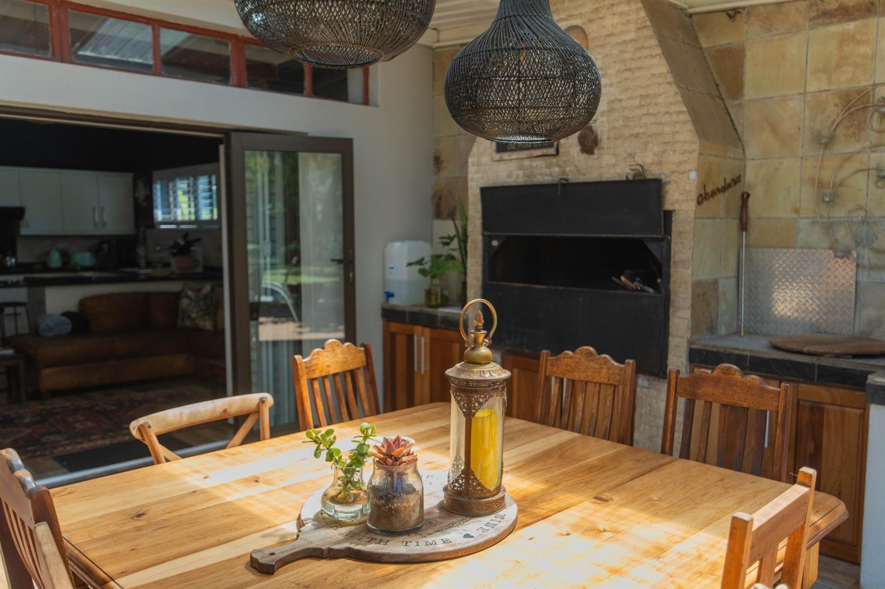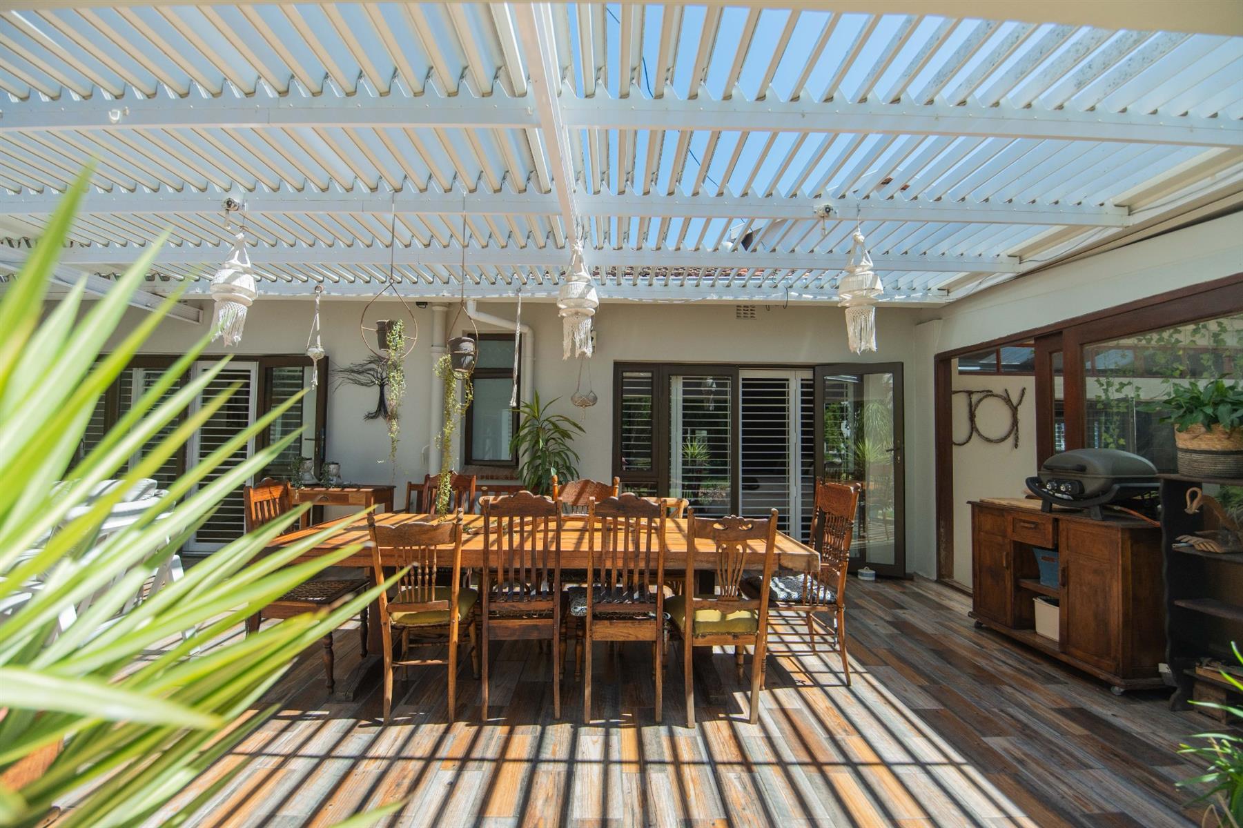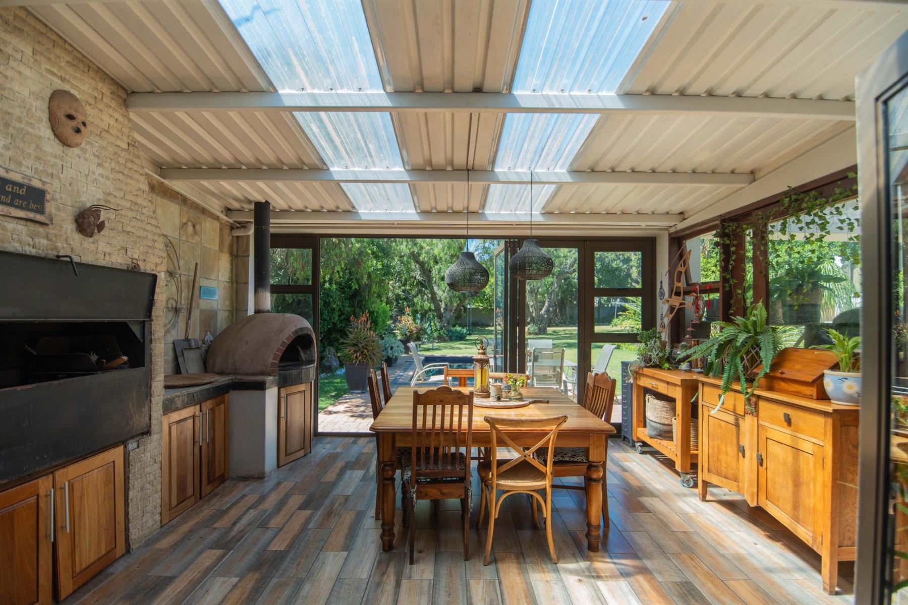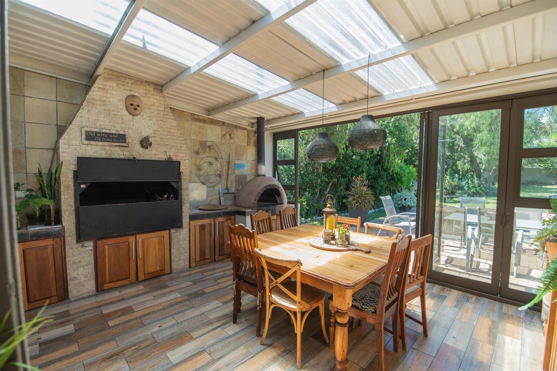 The open-plan kitchen and TV room lead to an impressive indoor braai and entertainment area complete with a built-in braai and pizza oven. Stack doors open to an undercover patio with a louvre roof, overlooking a private, low-maintenance garden and chip-tile swimming pool.