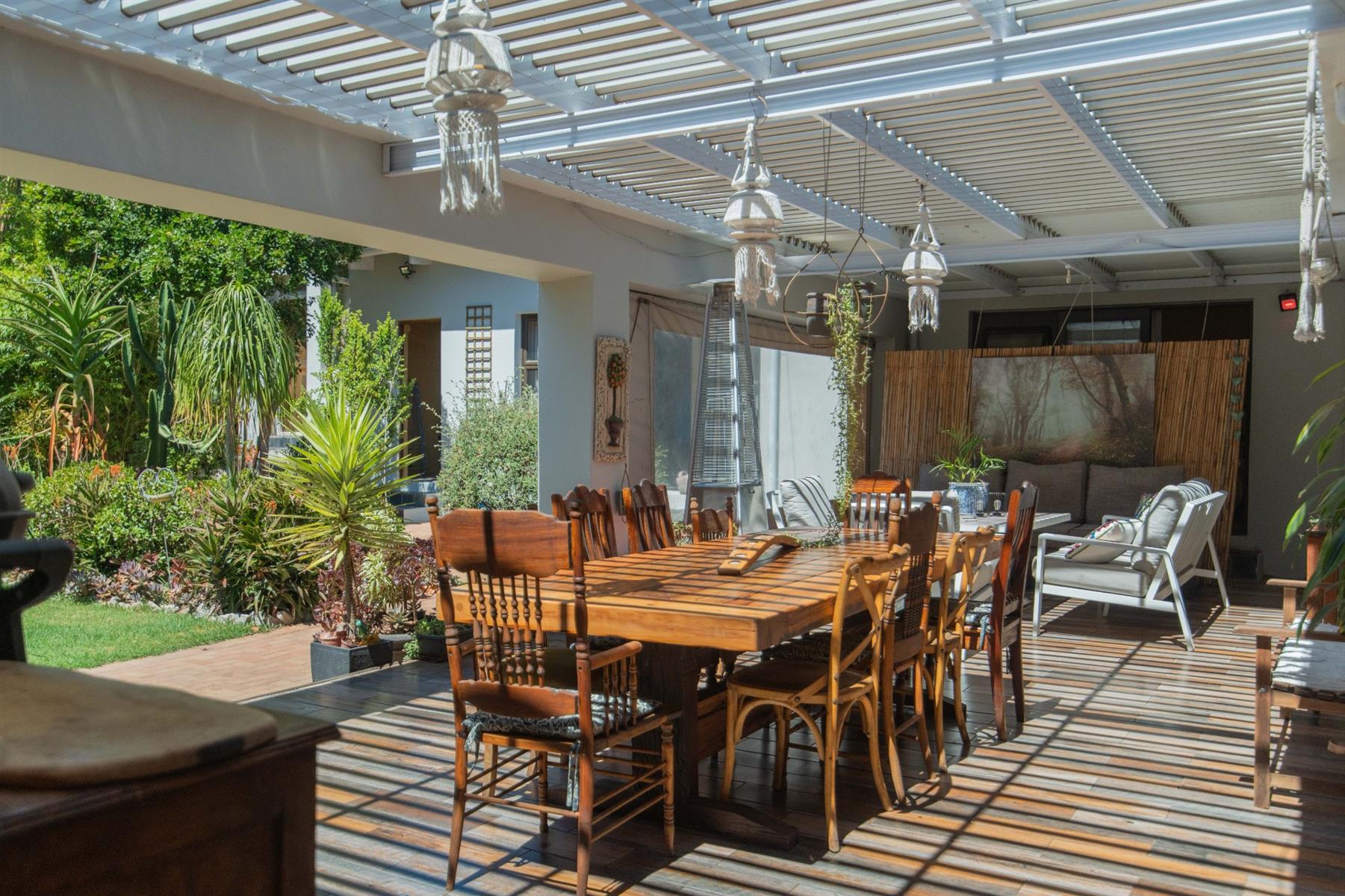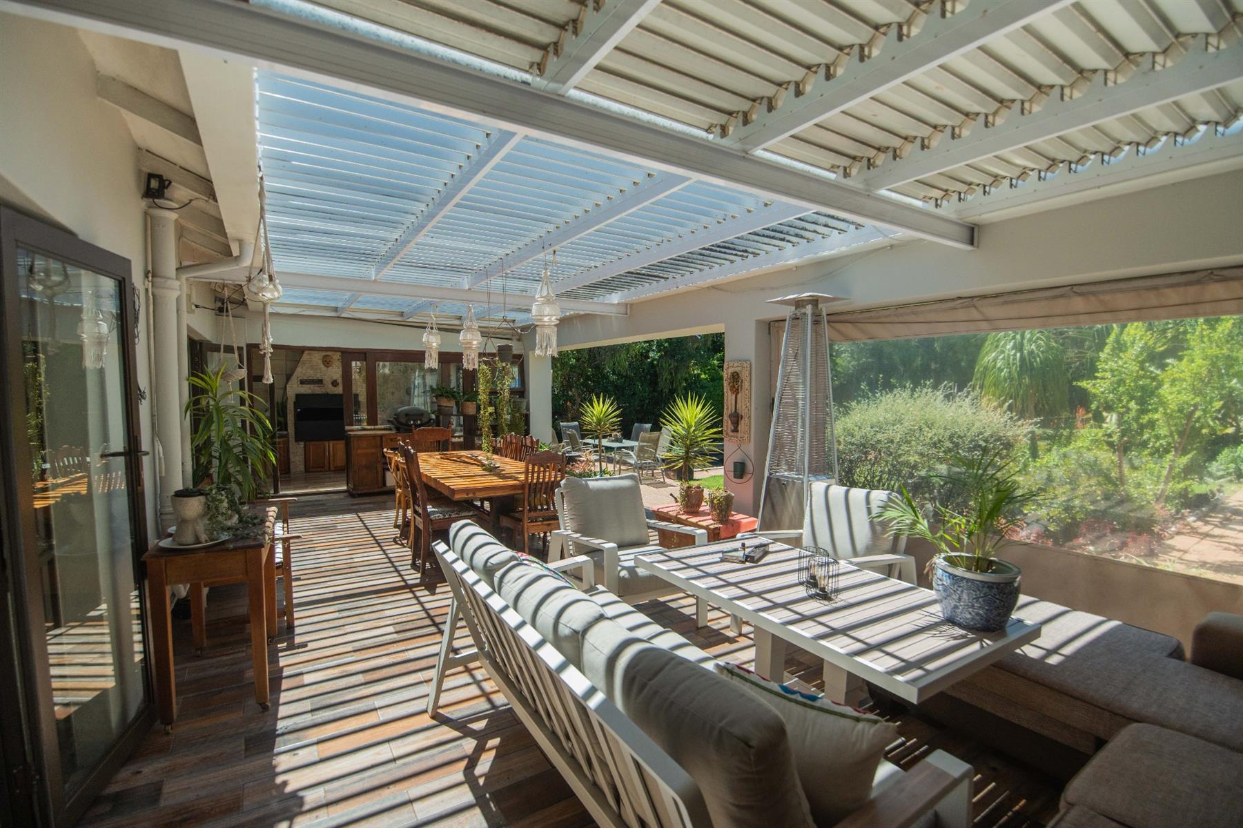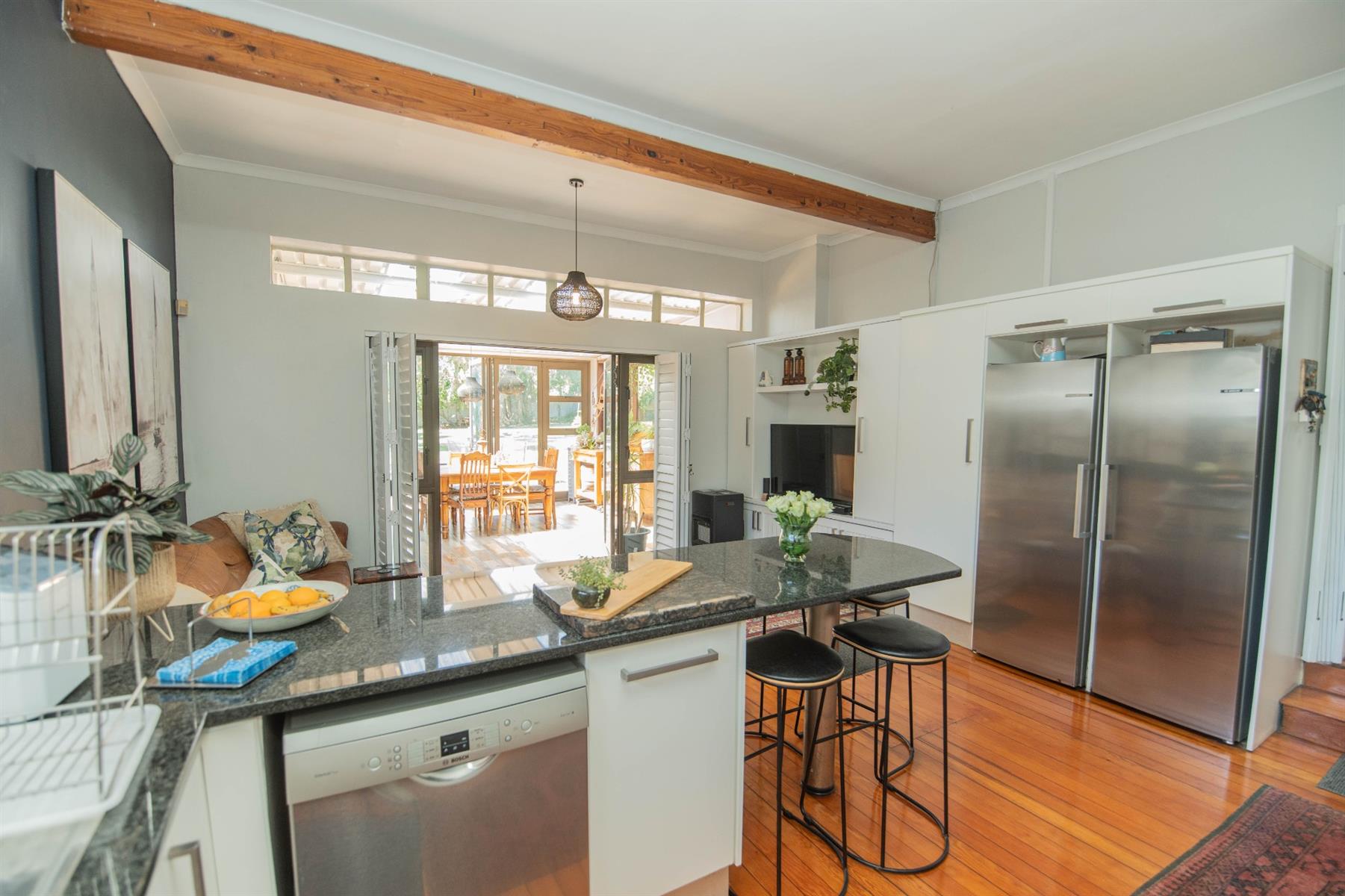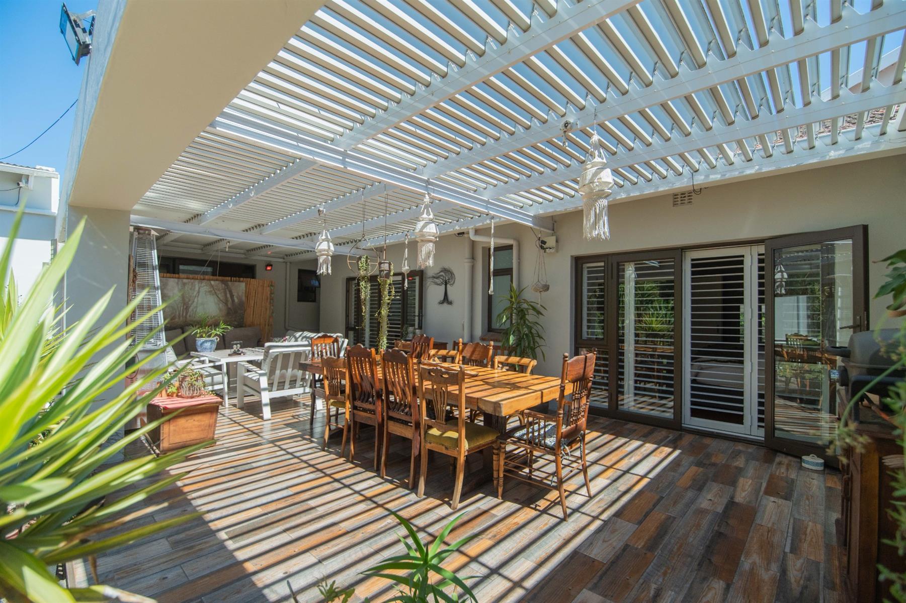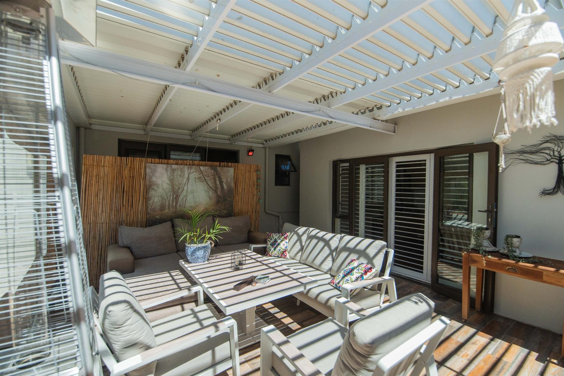 The open-plan kitchen and TV room lead to an impressive indoor braai and entertainment area complete with a built-in braai and pizza oven. Stack doors open to an undercover patio with a louvre roof, overlooking a private, low-maintenance garden and chip-tile swimming pool.