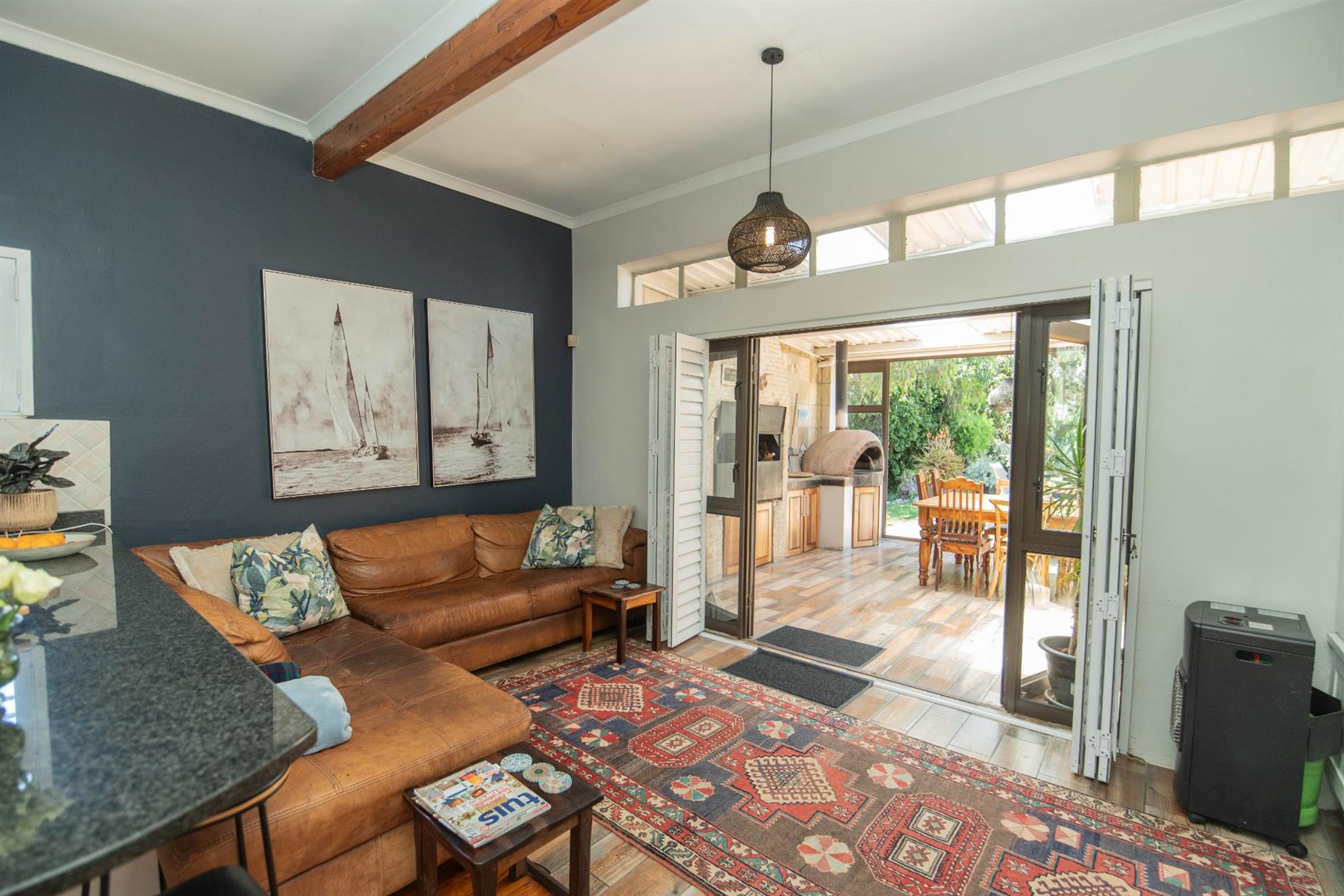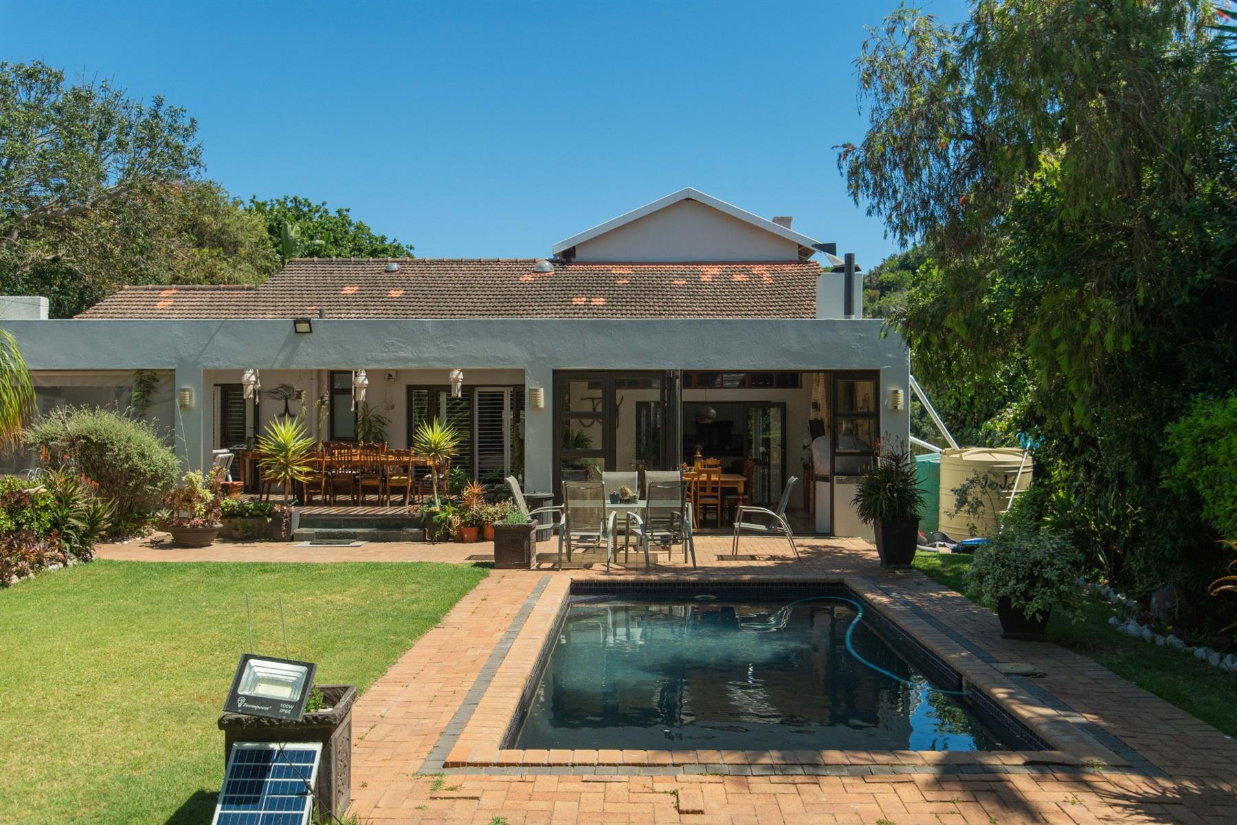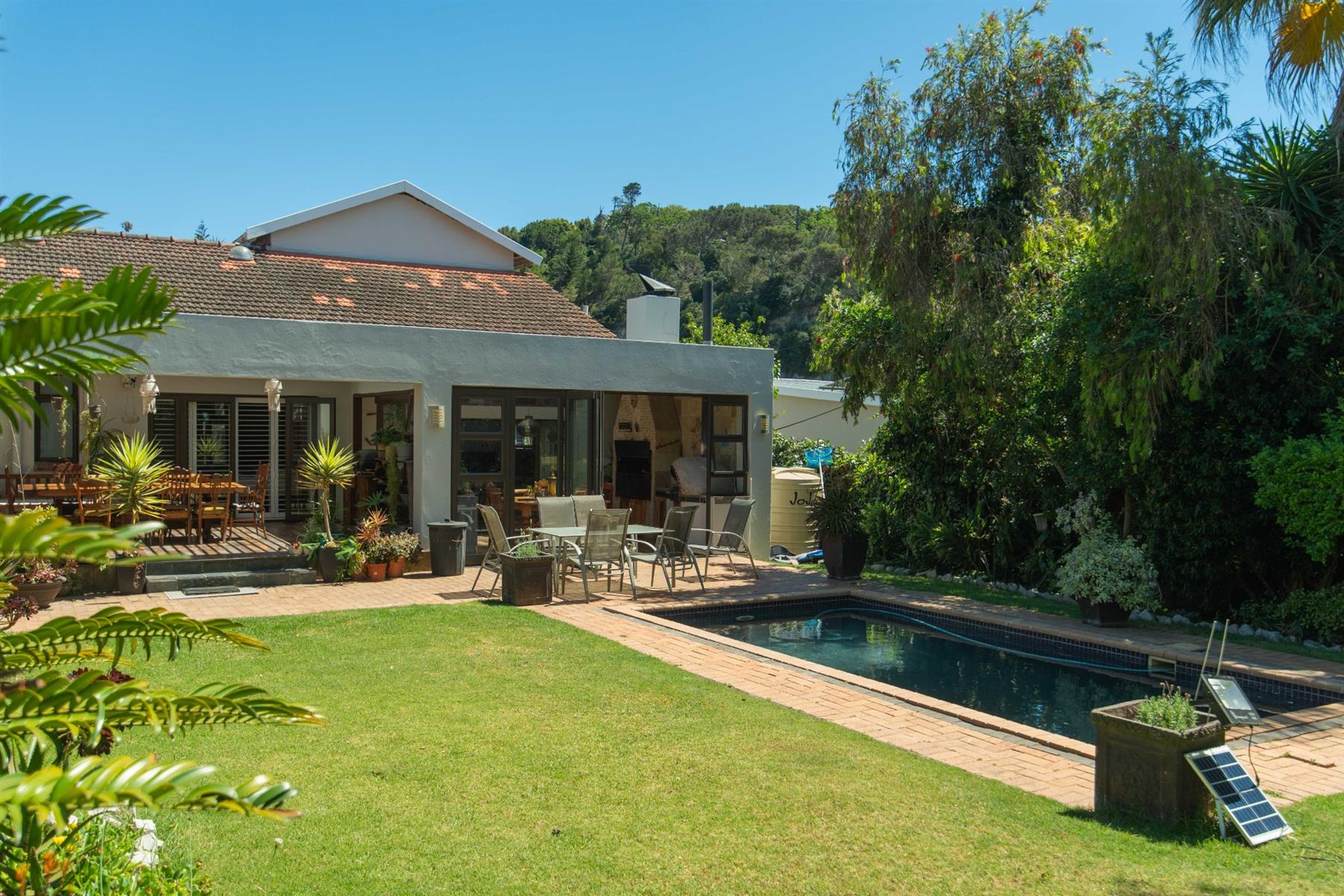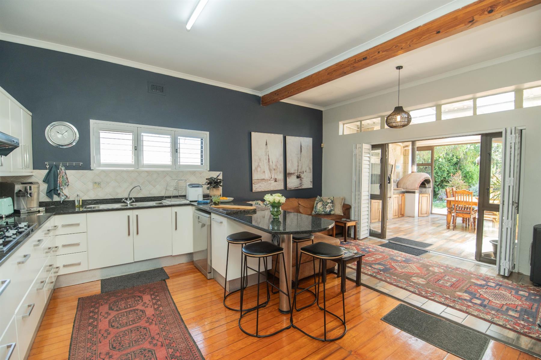 The open-plan kitchen and TV room lead to an impressive indoor braai and entertainment area complete with a built-in braai and pizza oven. Stack doors open to an undercover patio with a louvre roof, overlooking a private, low-maintenance garden and chip-tile swimming pool.