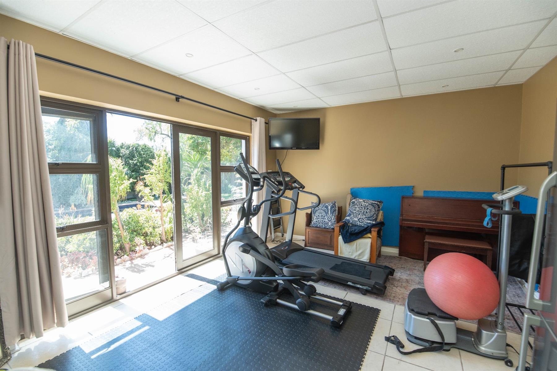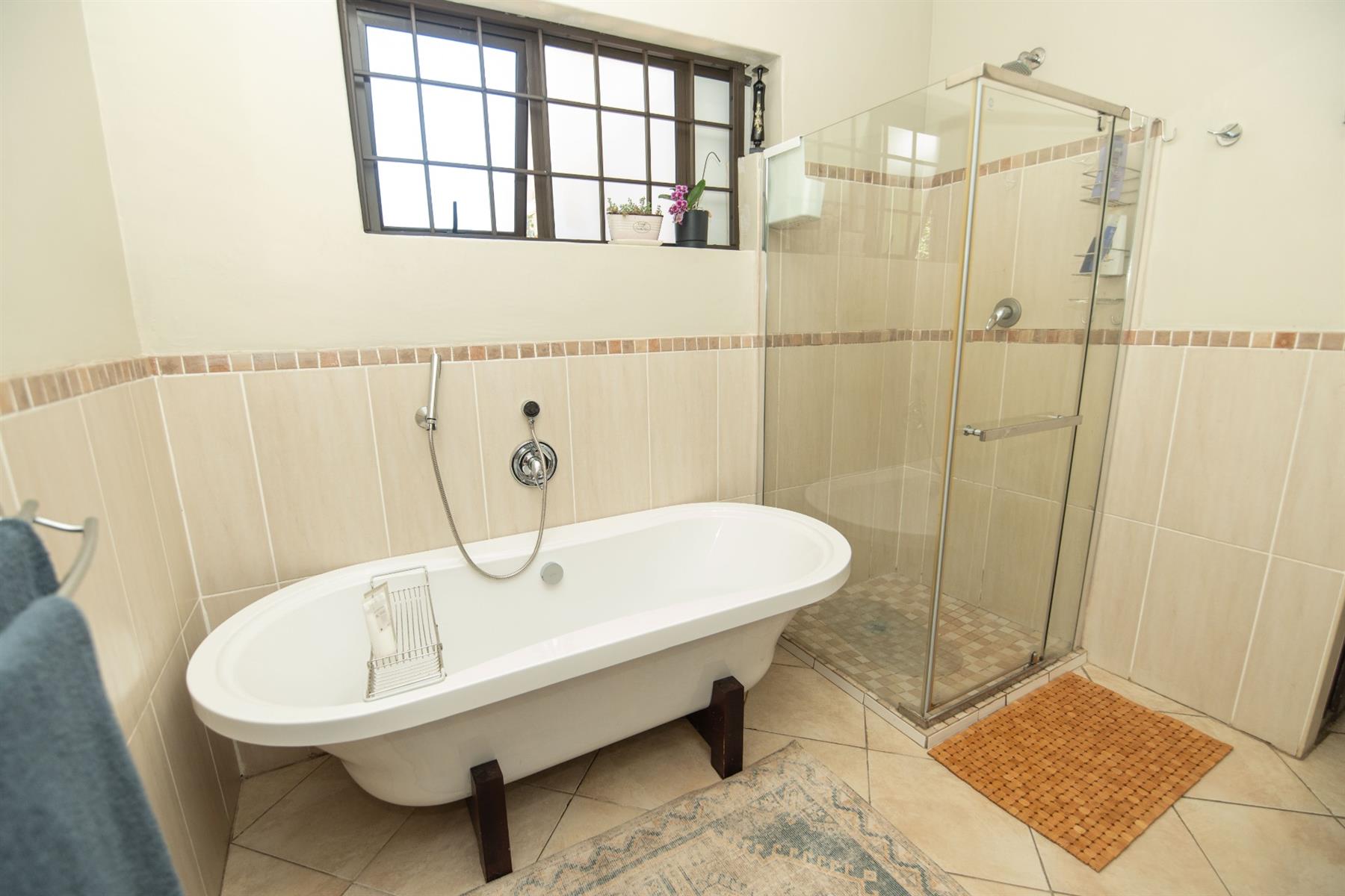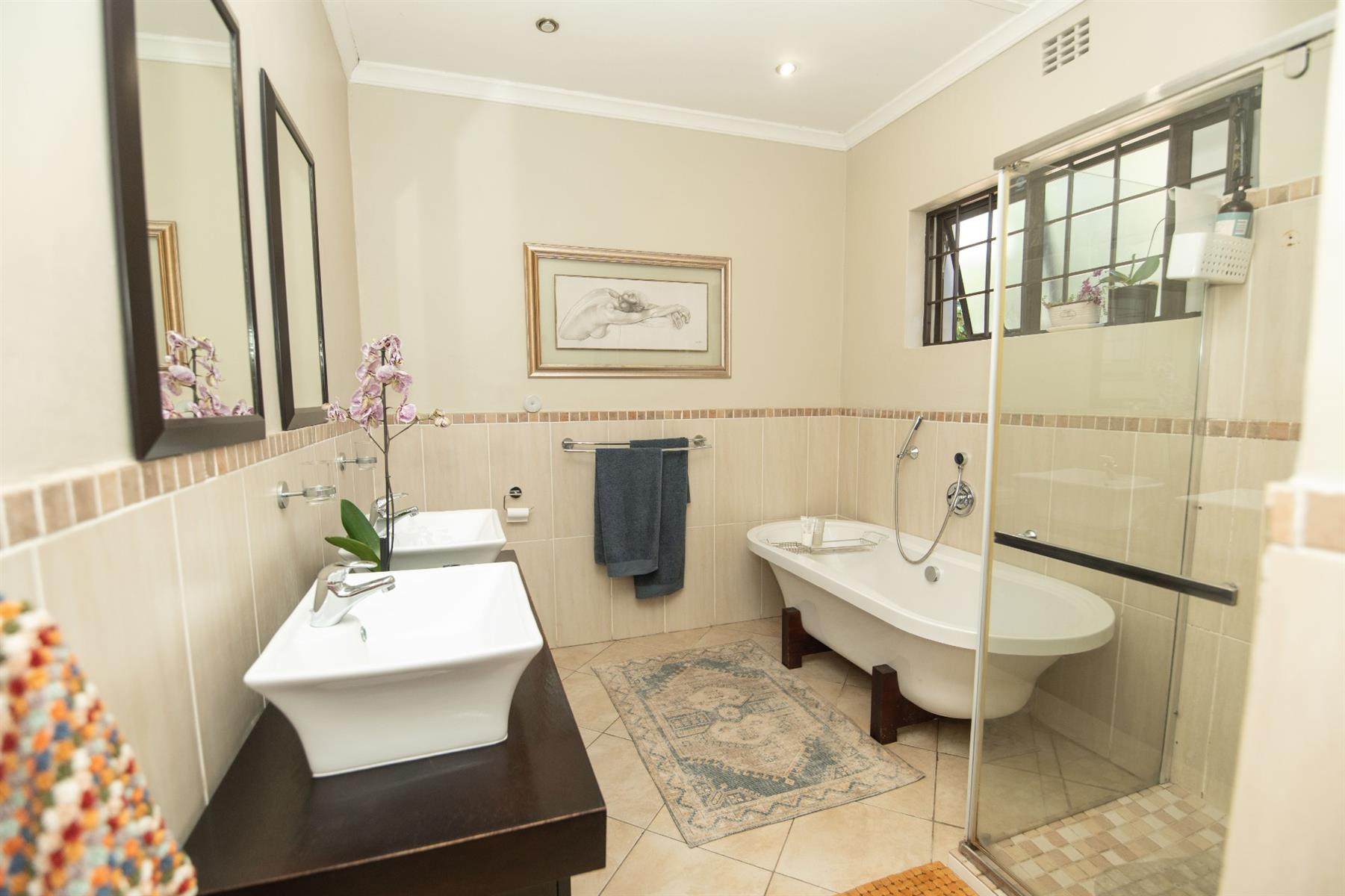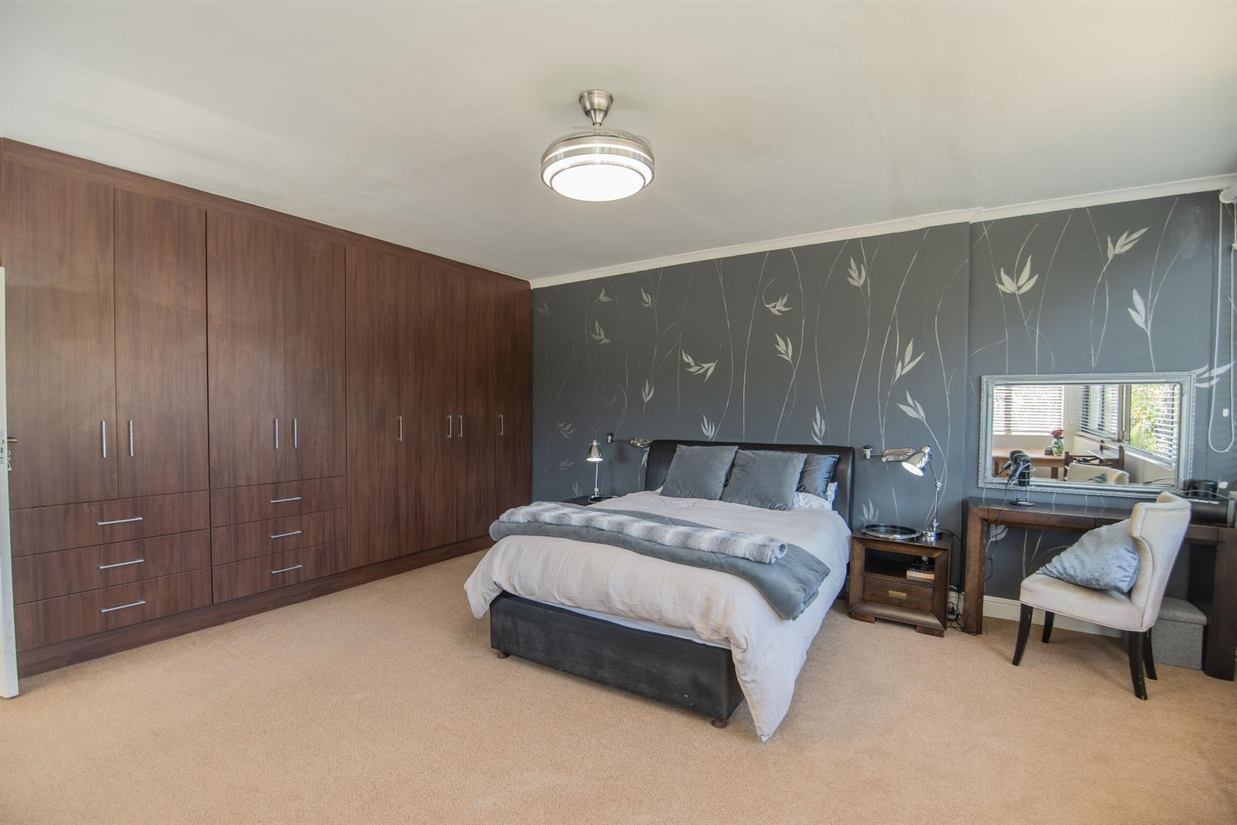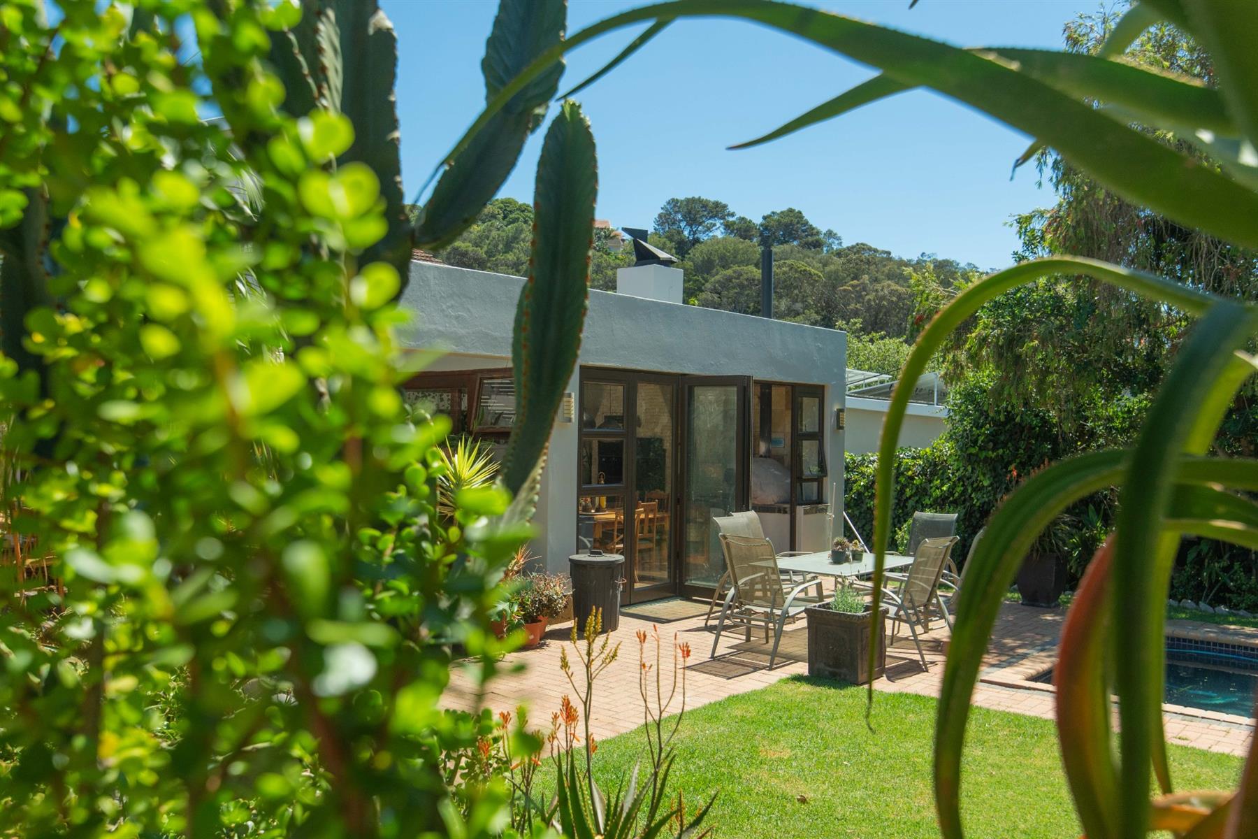 The open-plan kitchen and TV room lead to an impressive indoor braai and entertainment area complete with a built-in braai and pizza oven. Stack doors open to an undercover patio with a louvre roof, overlooking a private, low-maintenance garden and chip-tile swimming pool.
