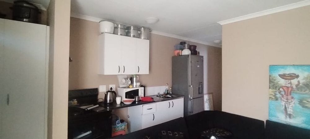 It features a modern open-plan kitchenette with built-in cupboards that flows into a cosy lounge area—ideal for easy, everyday living. The home offers two well-sized bedrooms with great natural light, and a neatly tiled bathroom with a bathtub, shower, and toilet. The property is fully tiled throughout, offering a clean, modern look and effortless upkeep.