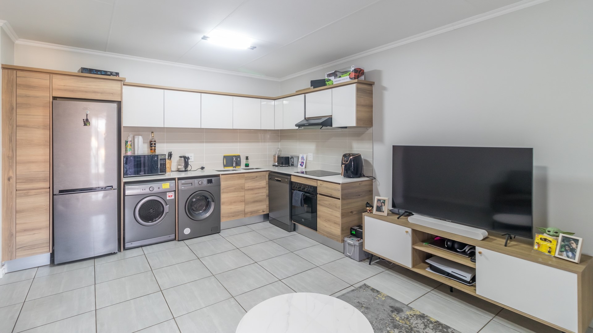 The contemporary kitchen is equipped with modern appliances, including a refrigerator, dishwasher, and built-in oven, perfect for culinary enthusiasts.