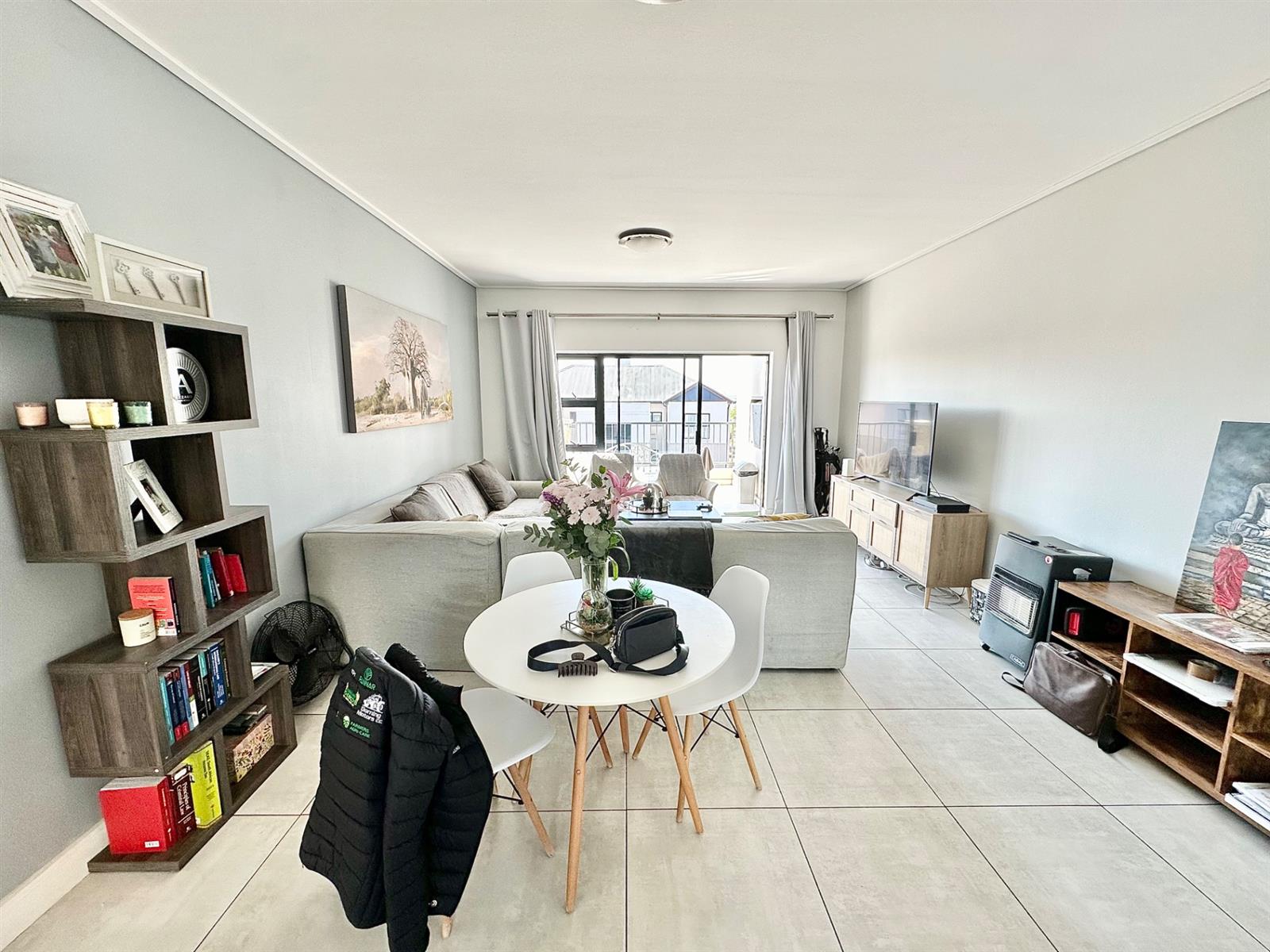 The light-filled living and dining area flows effortlessly onto a covered balcony with a built-in braai, creating the ideal setting for relaxed entertaining and enjoying tranquil estate views.