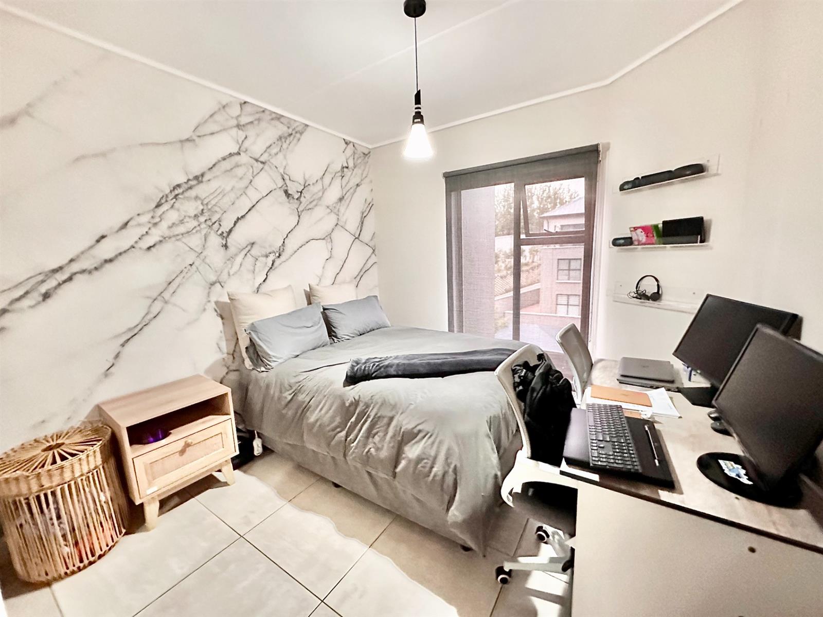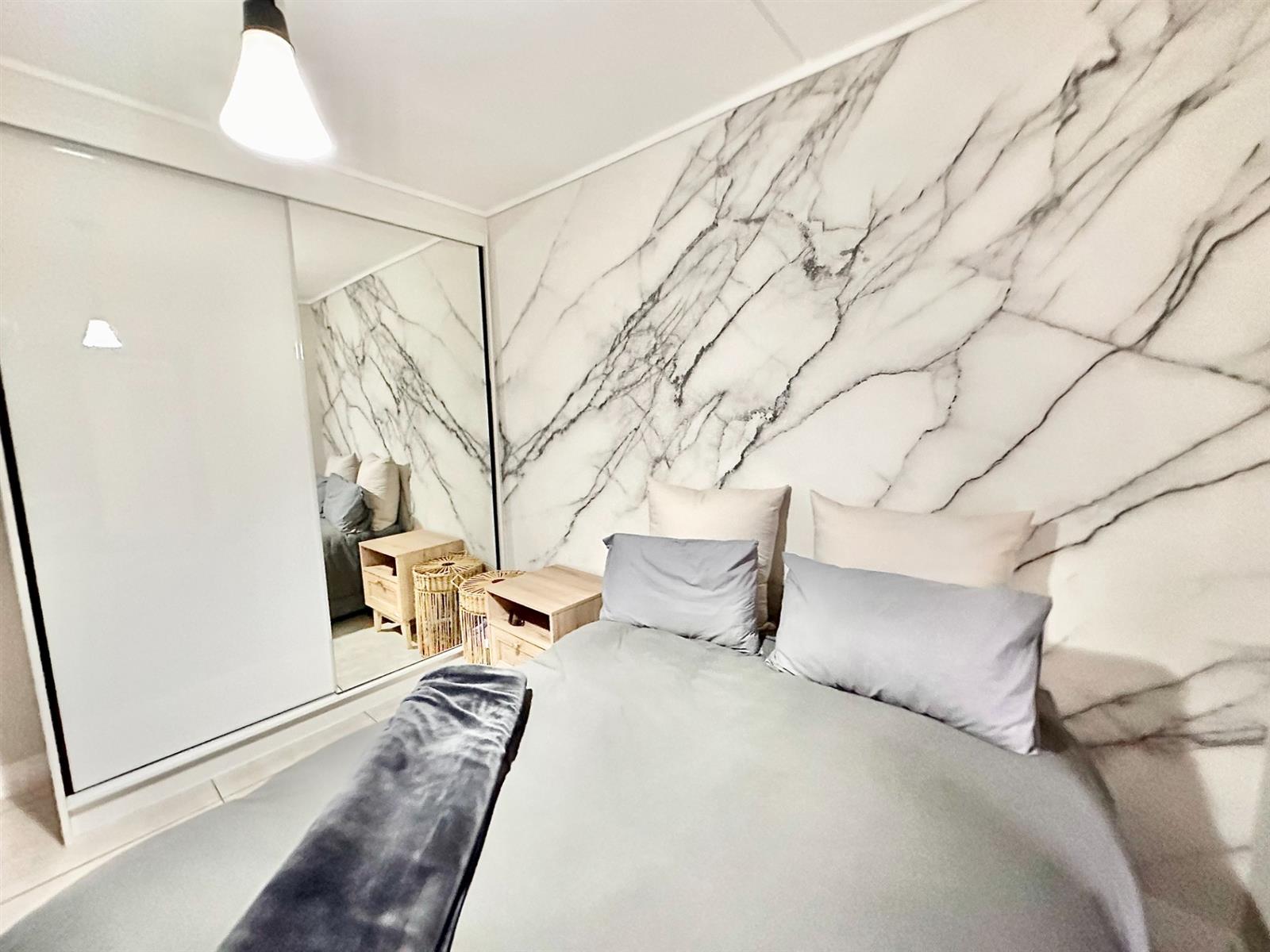 - Stylish marble-effect wallpaper feature in the second bedroom
