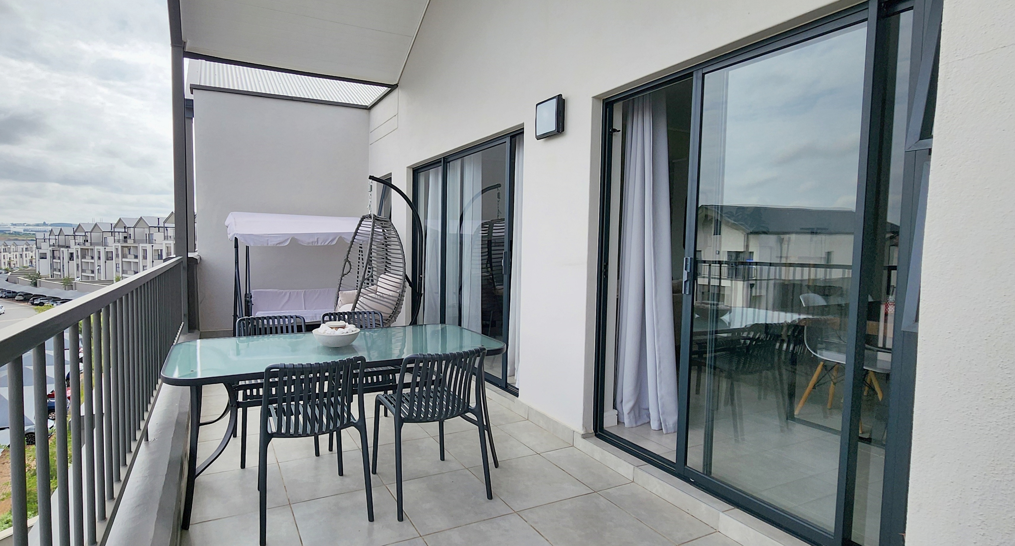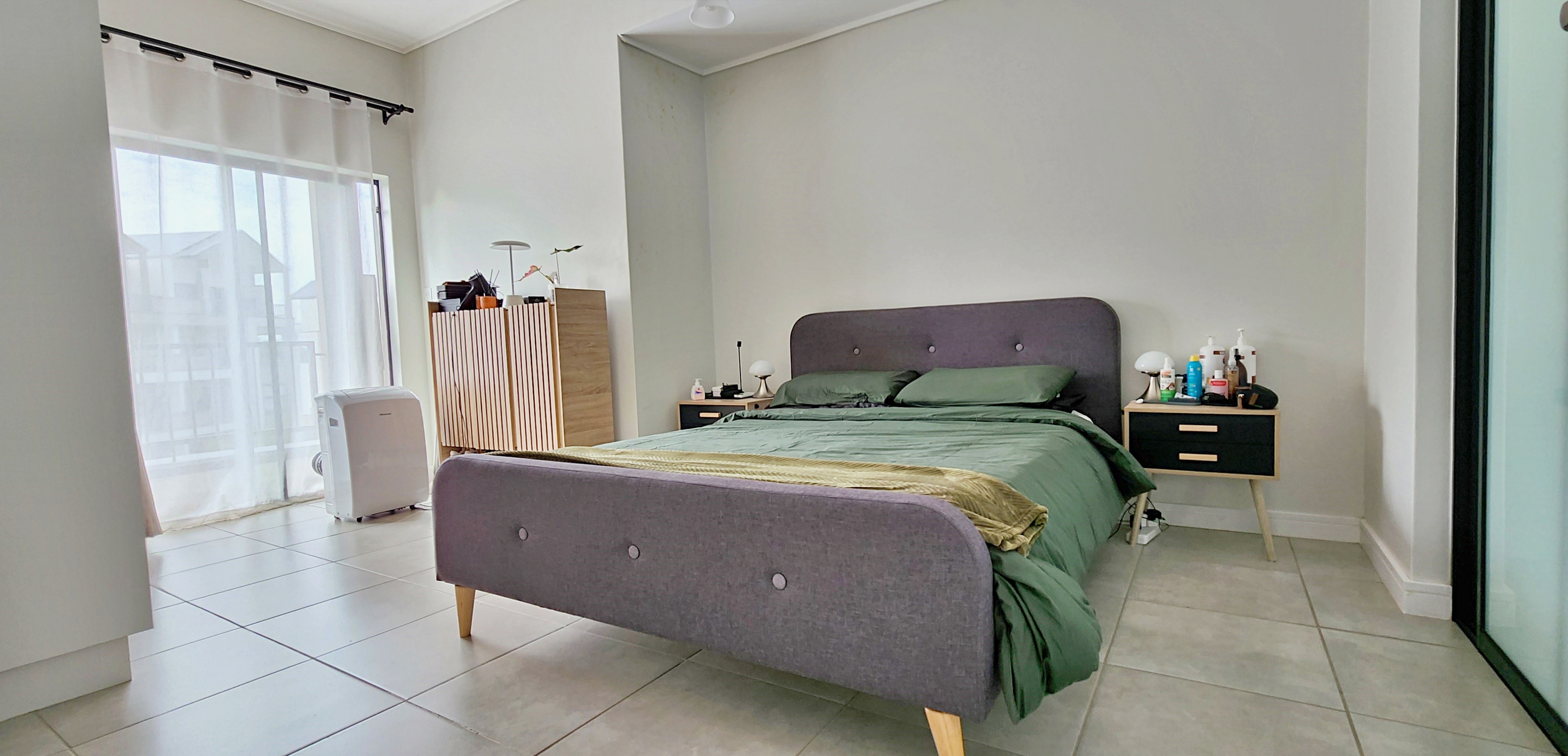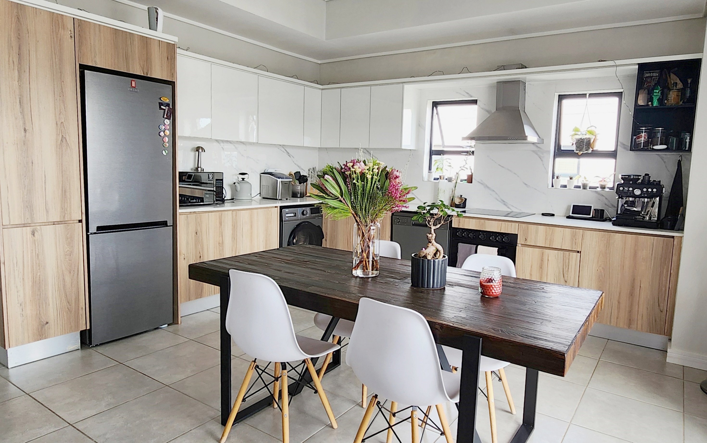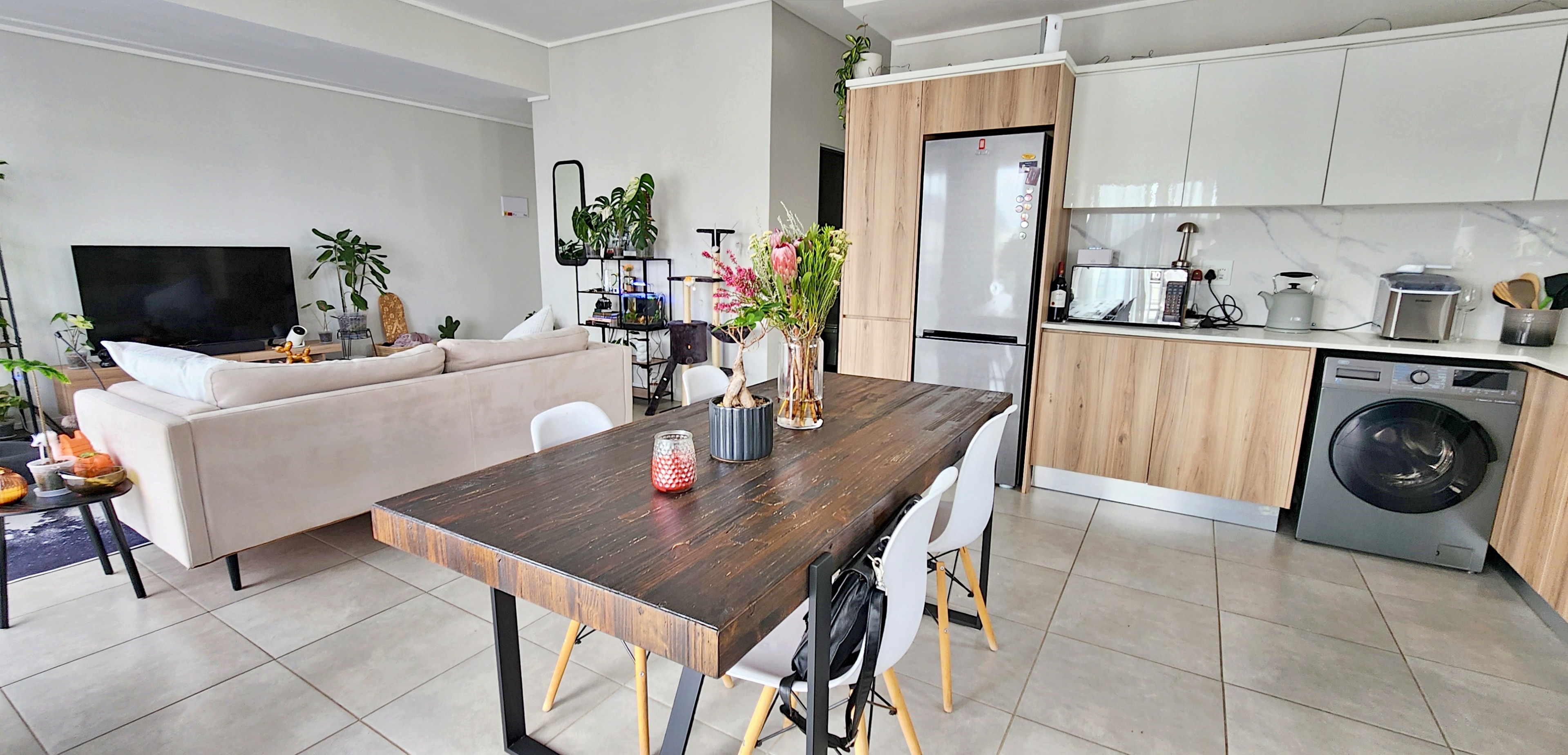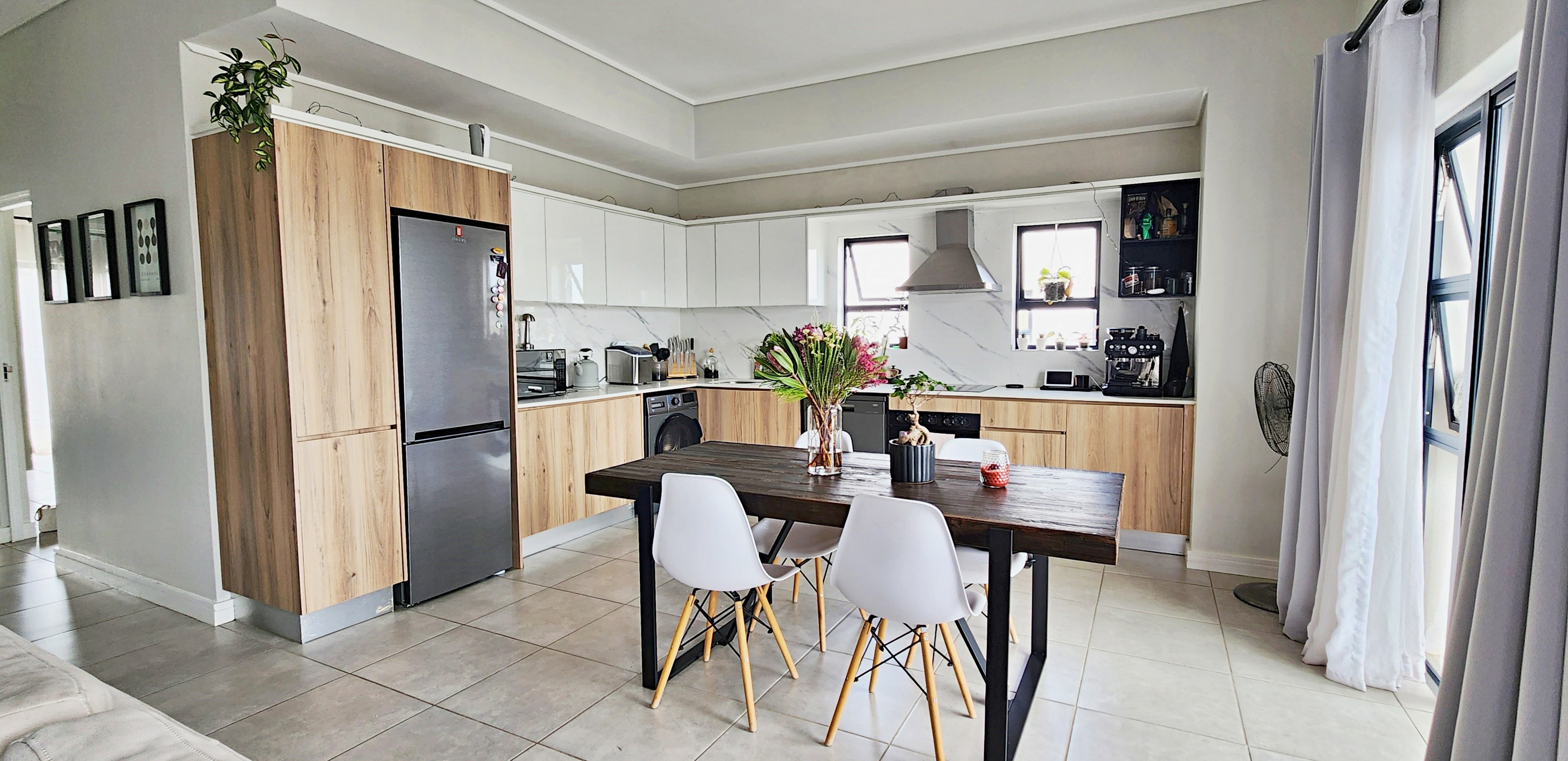 The open-plan living area is bright and airy, with sleek tiled floors and expansive aluminium-framed glass sliders that invite natural light. A contemporary kitchen, fully equipped with high-end DEFY appliances—including an electric oven, hob with extractor, refrigerator, washing machine, and dishwasher—ensures effortless meal preparation and seamless daily living.