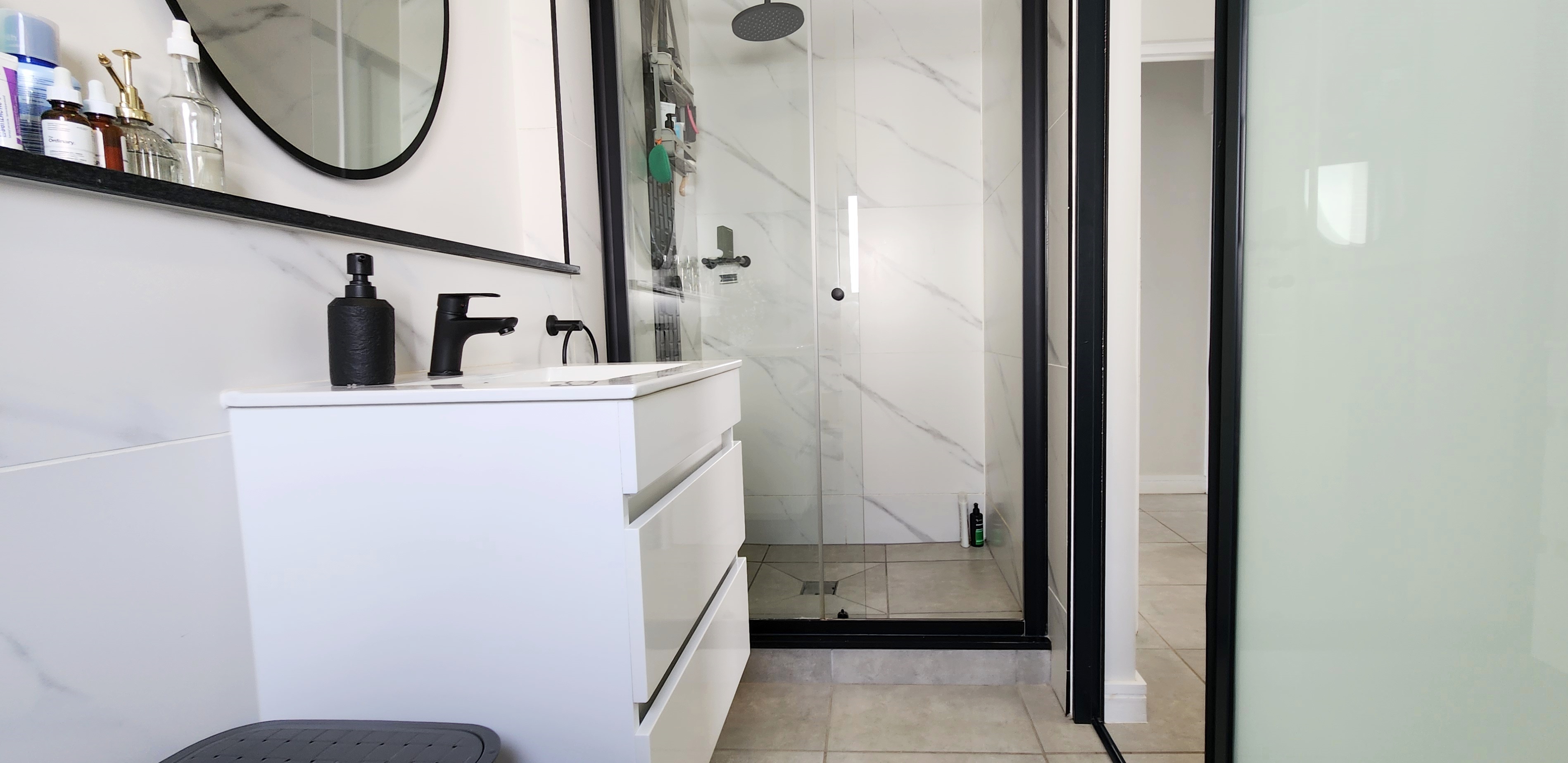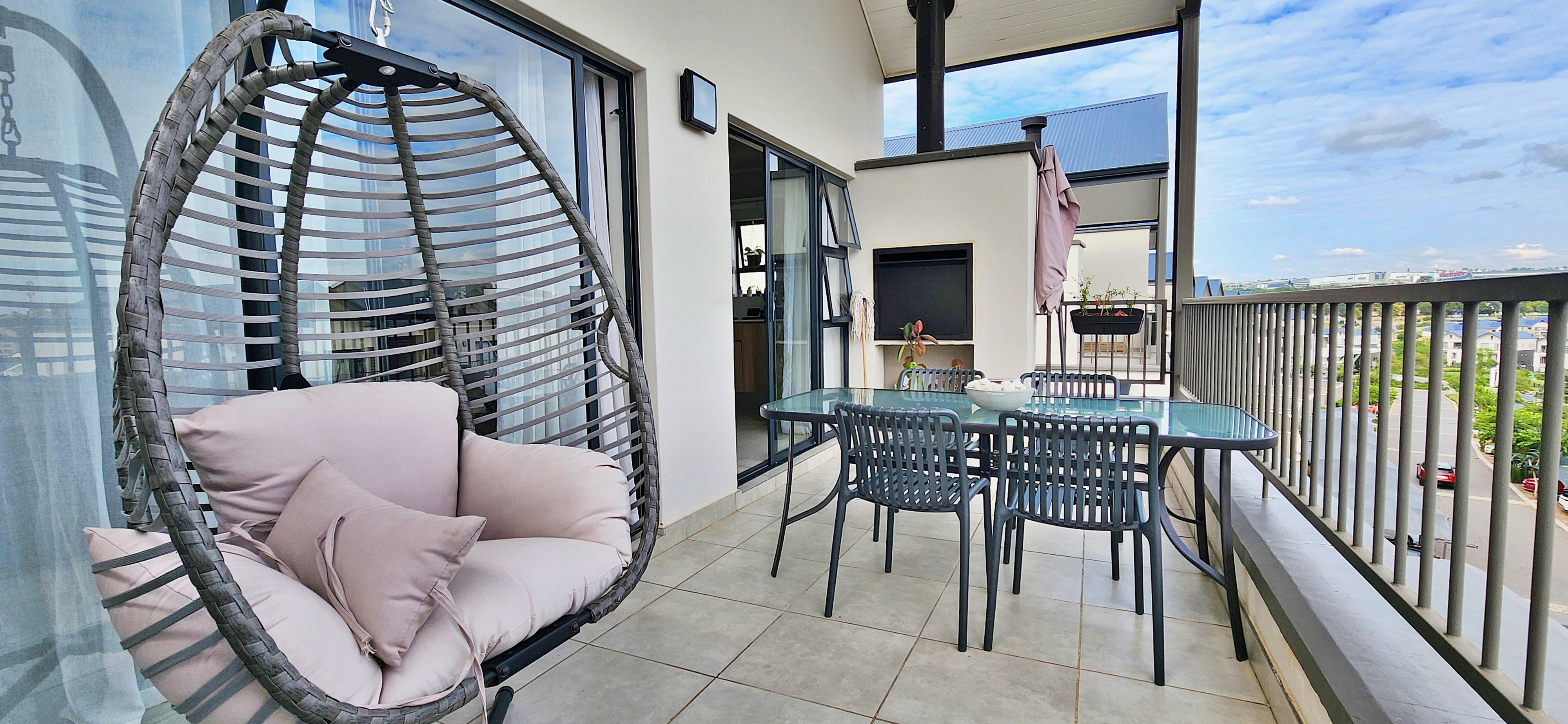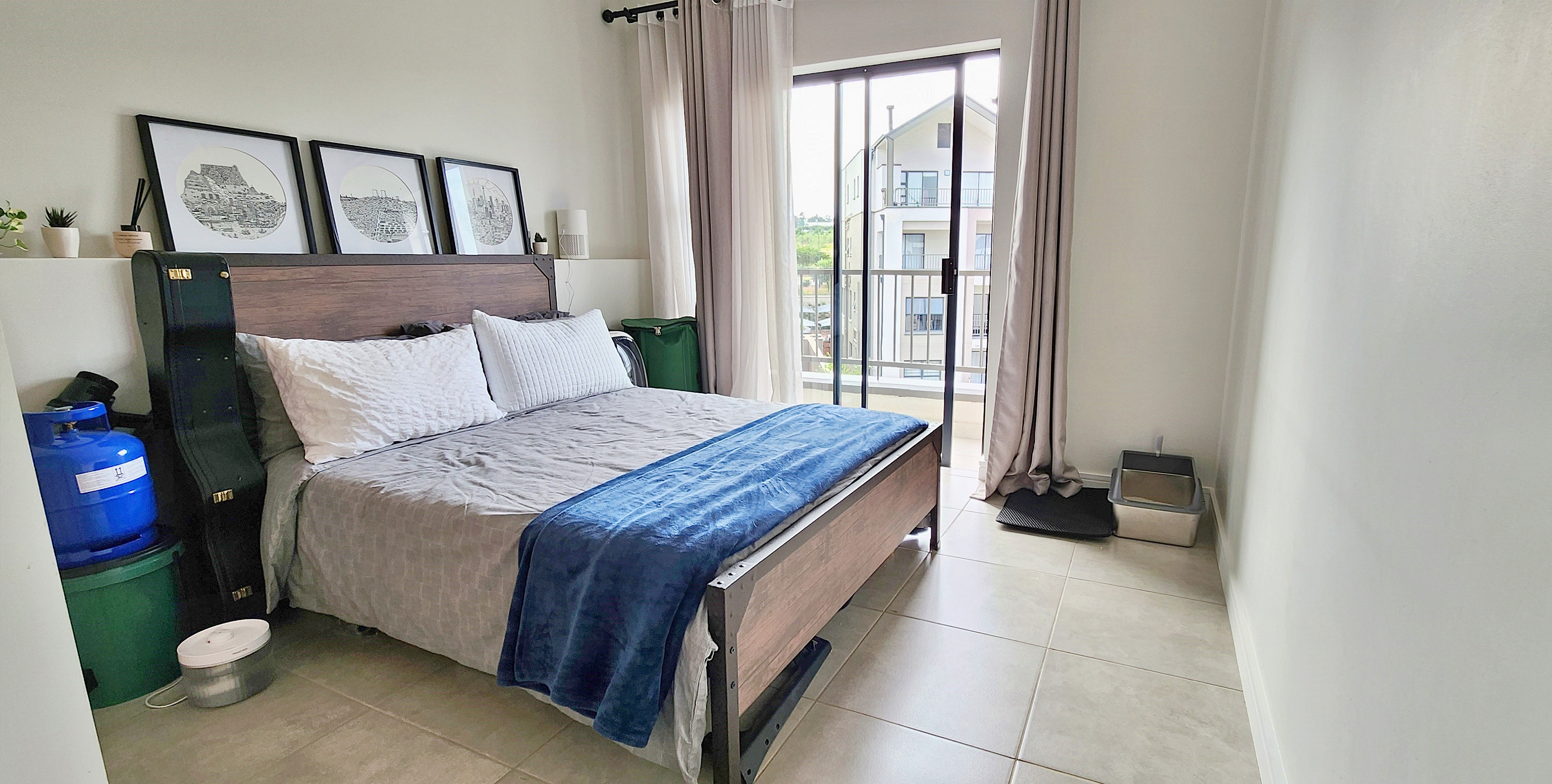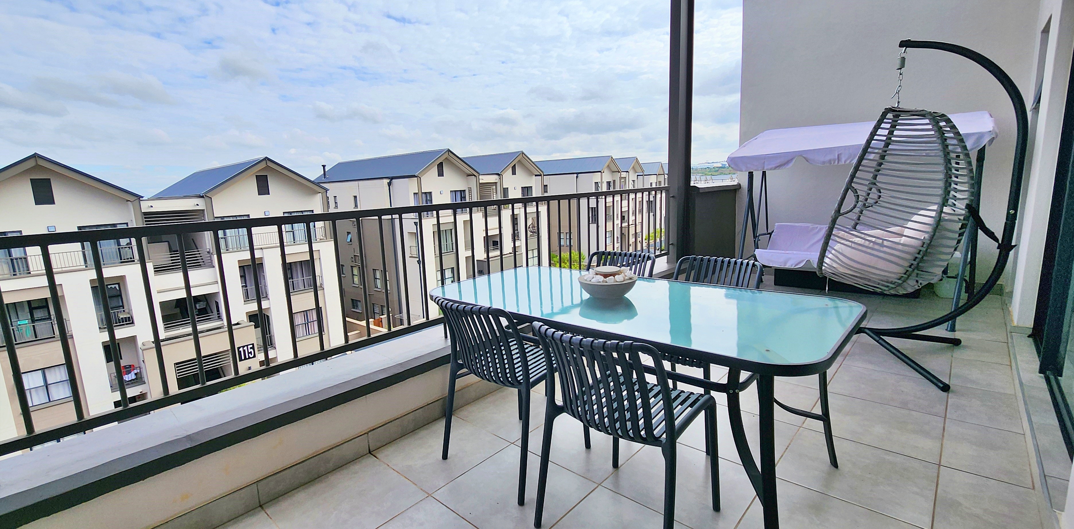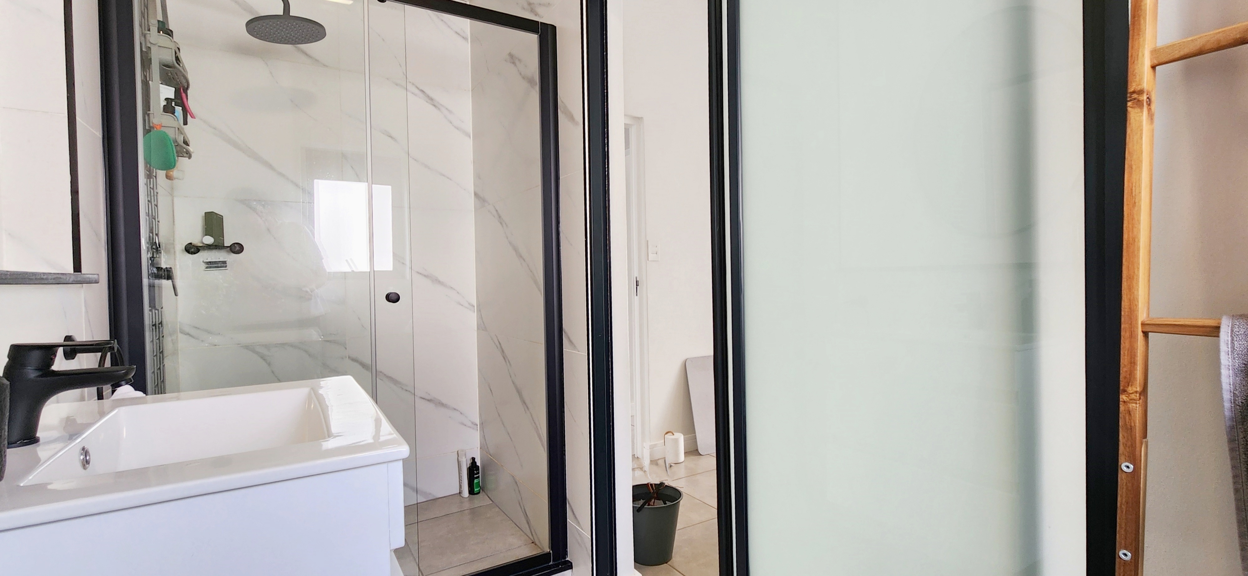 The open-plan living area is bright and airy, with sleek tiled floors and expansive aluminium-framed glass sliders that invite natural light. A contemporary kitchen, fully equipped with high-end DEFY appliances—including an electric oven, hob with extractor, refrigerator, washing machine, and dishwasher—ensures effortless meal preparation and seamless daily living.