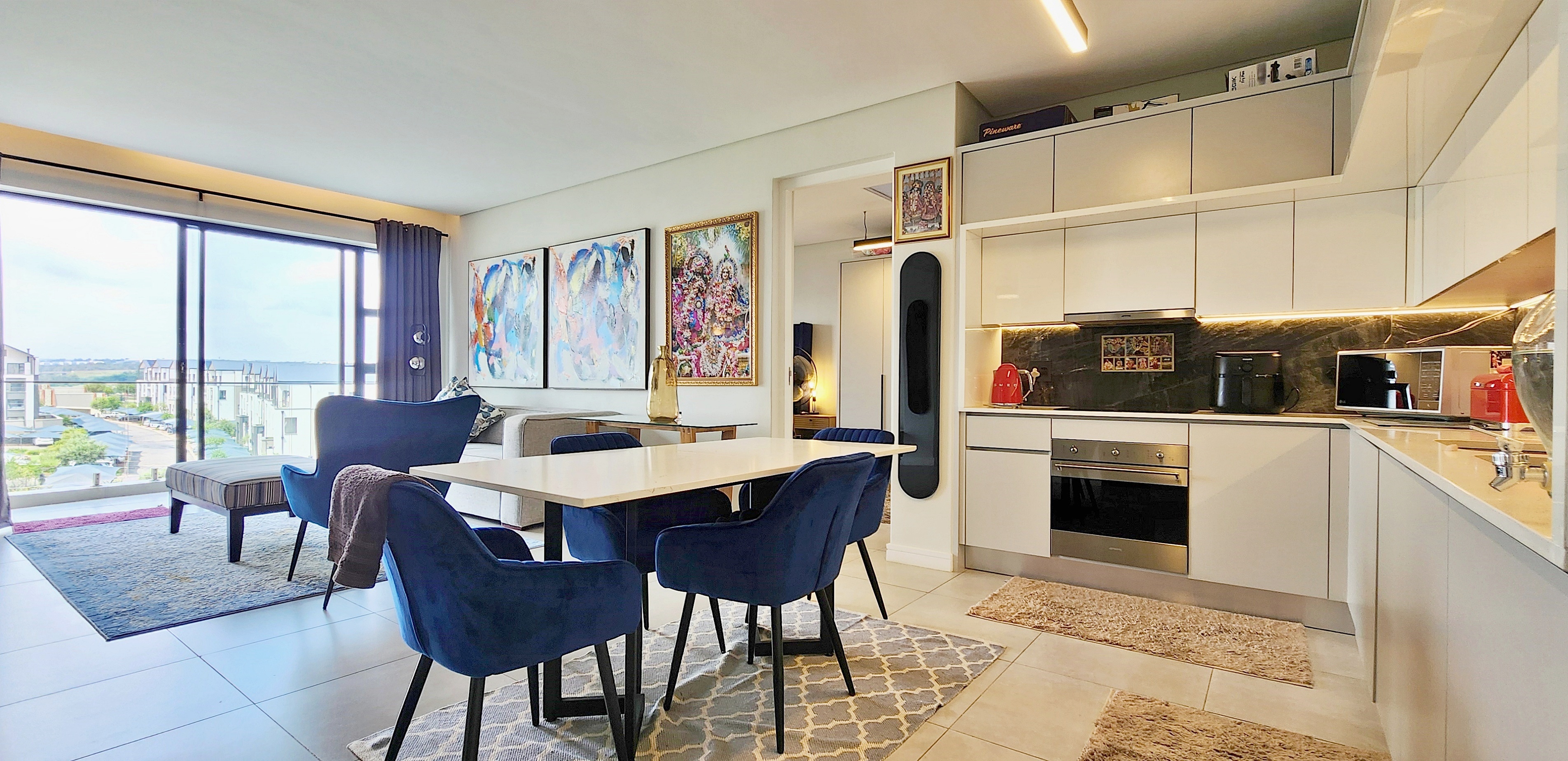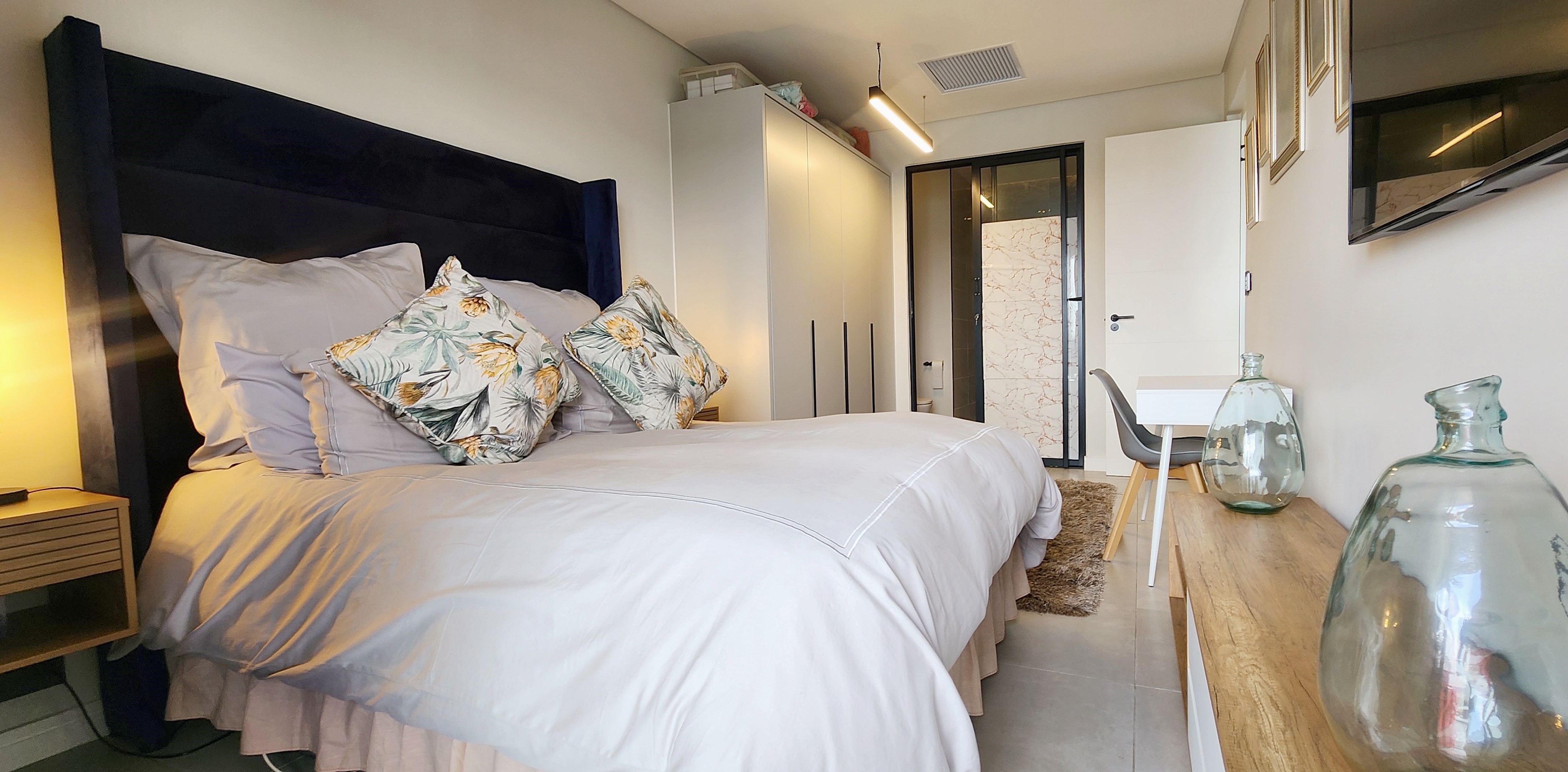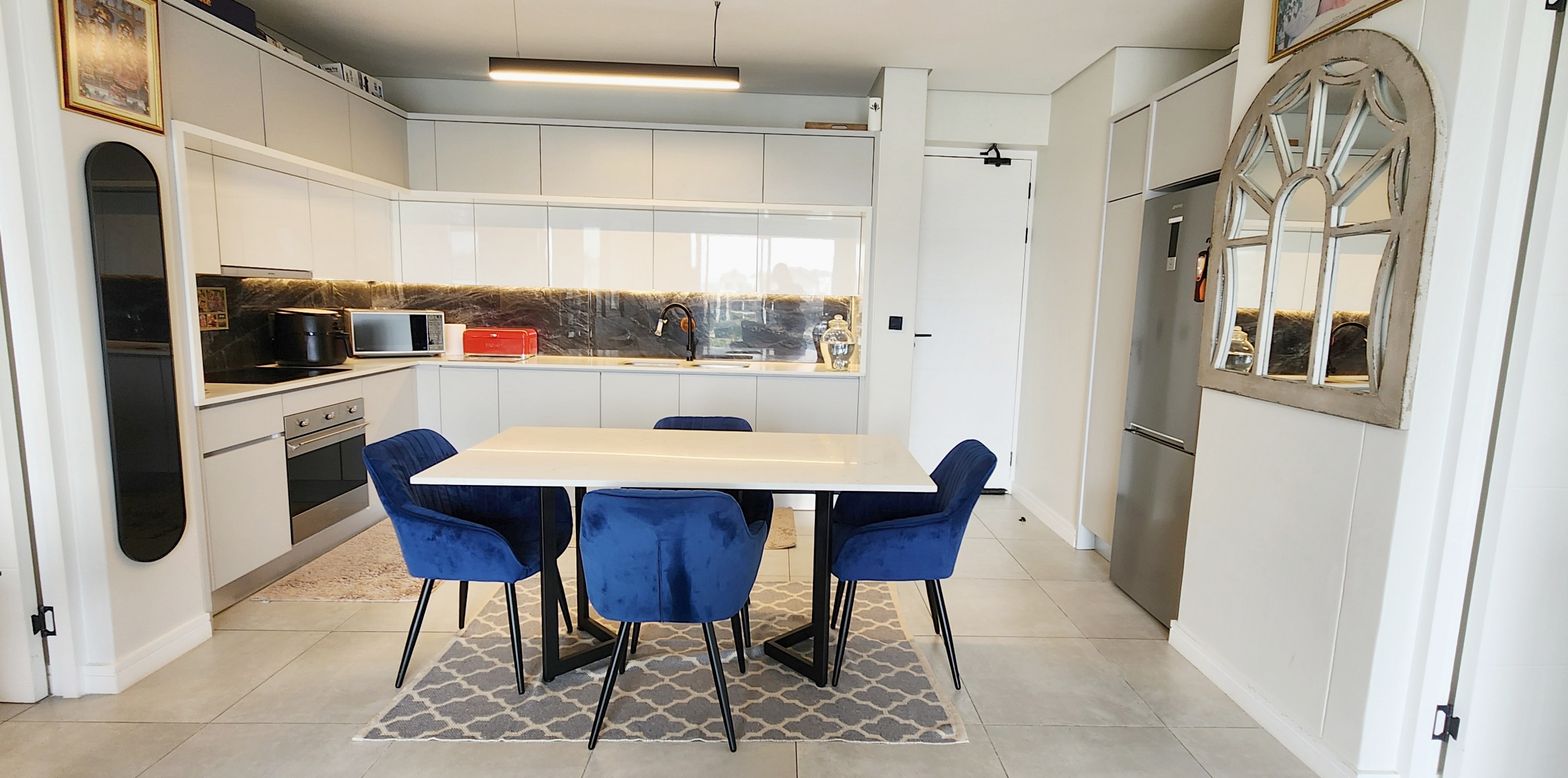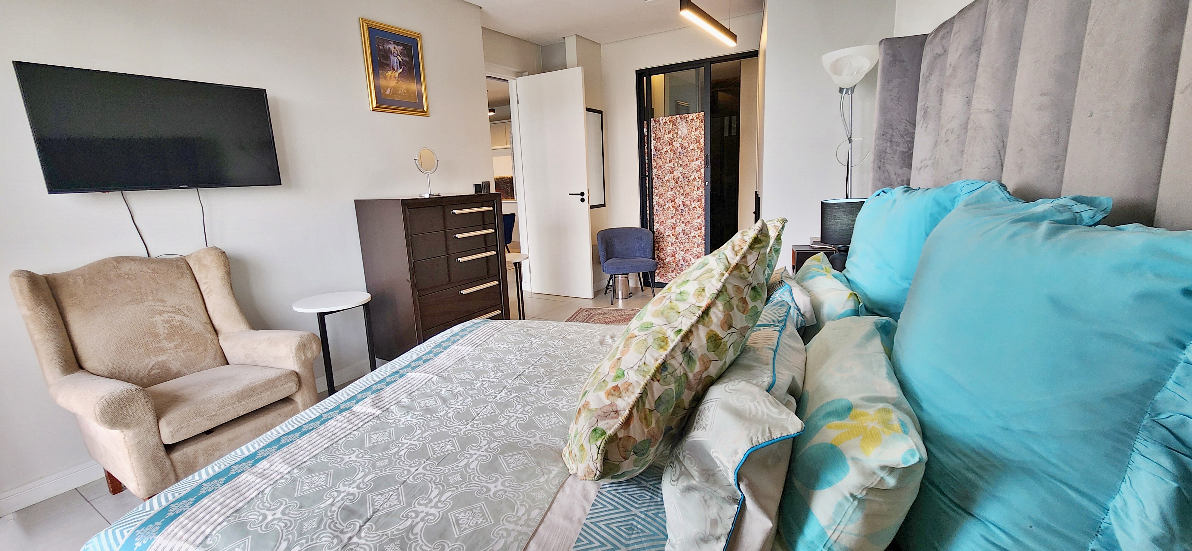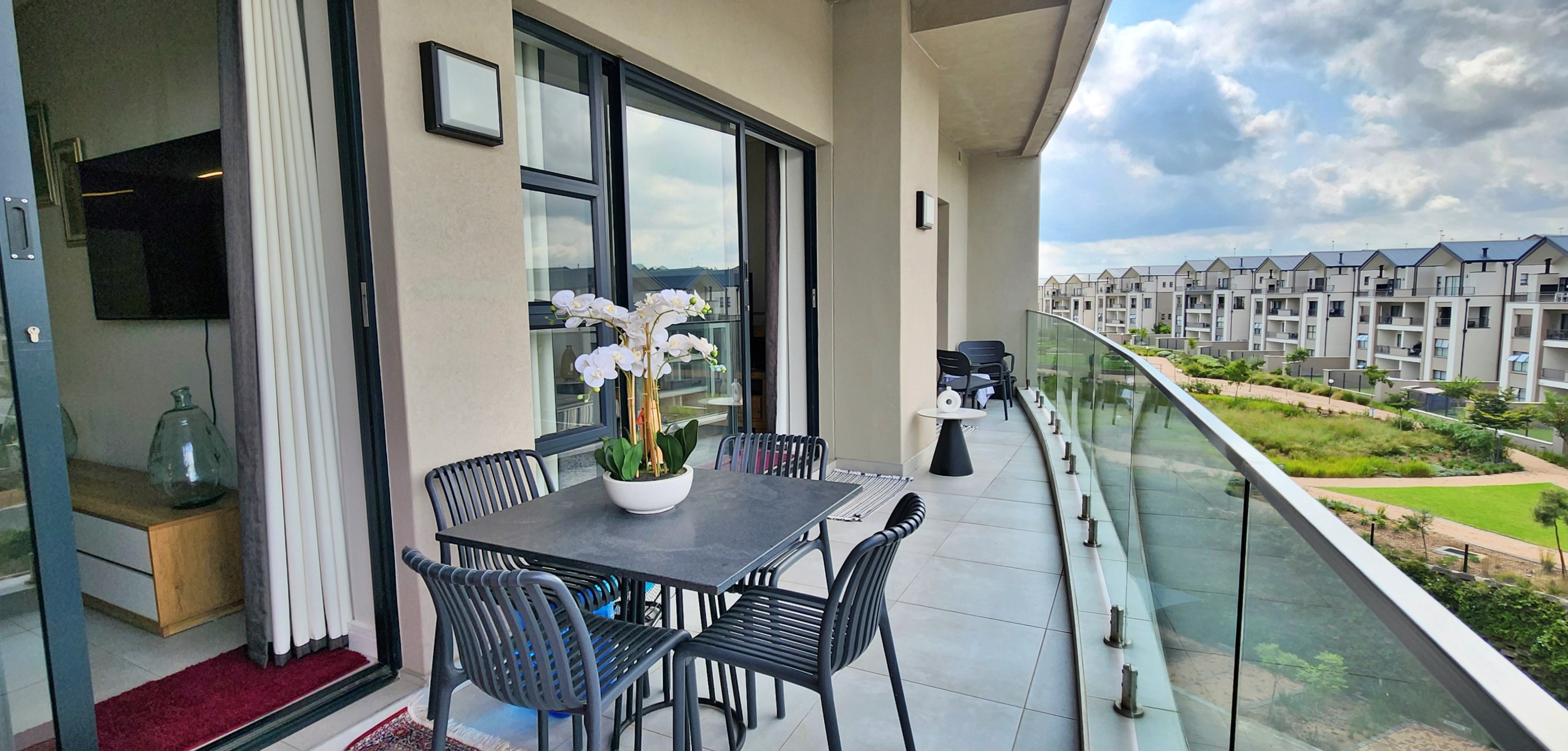 From the moment you step inside, you are welcomed by a stylish open-plan kitchen, thoughtfully designed with sleek finishes and high-quality Defy appliances. The seamless flow from the kitchen to the dining and living area creates a warm and inviting atmosphere, perfect for both relaxed living and entertaining. Large sliding doors open onto a full-length balcony, where breathtaking views of the Waterfall skyline provide the perfect backdrop to your morning coffee or evening unwind.