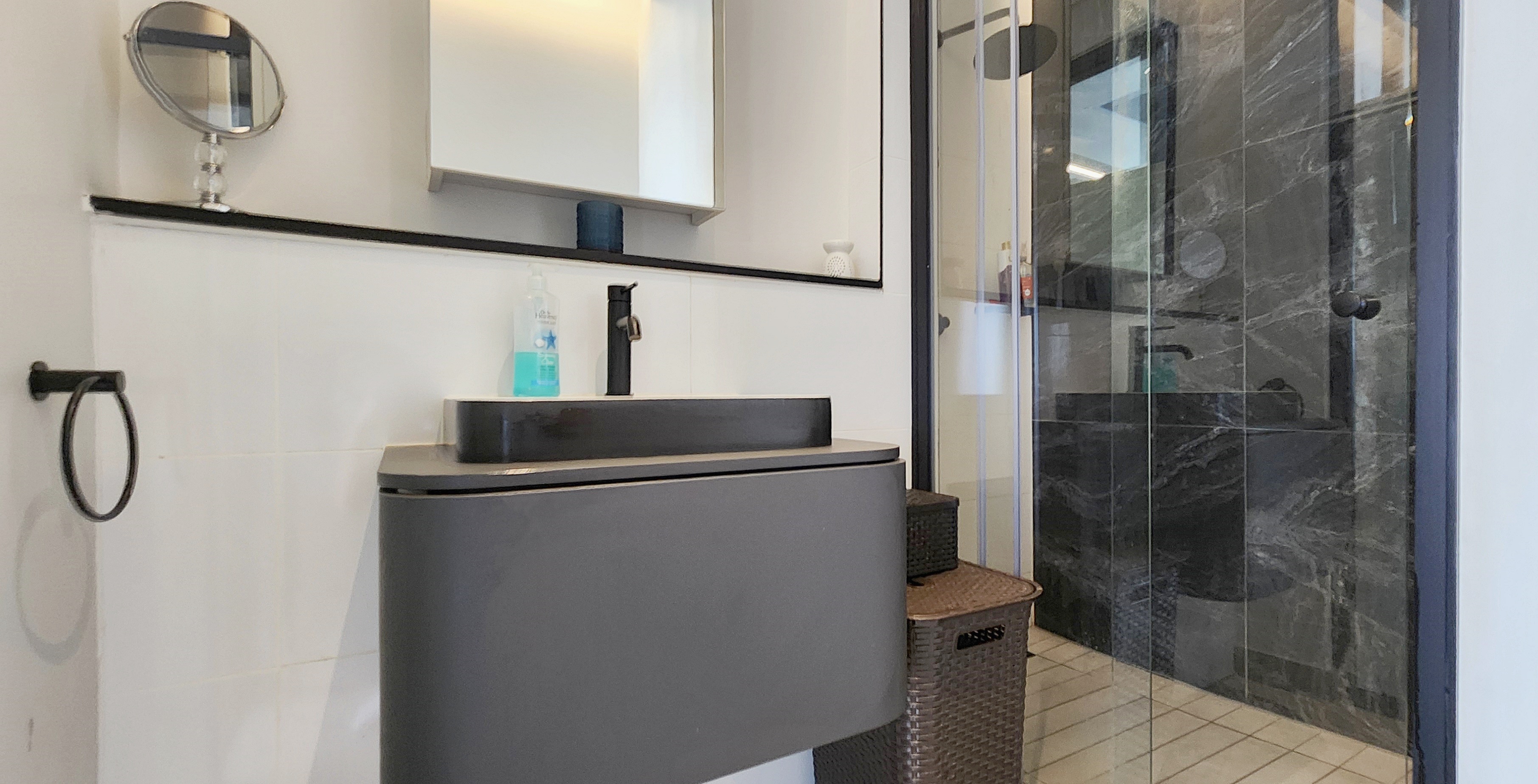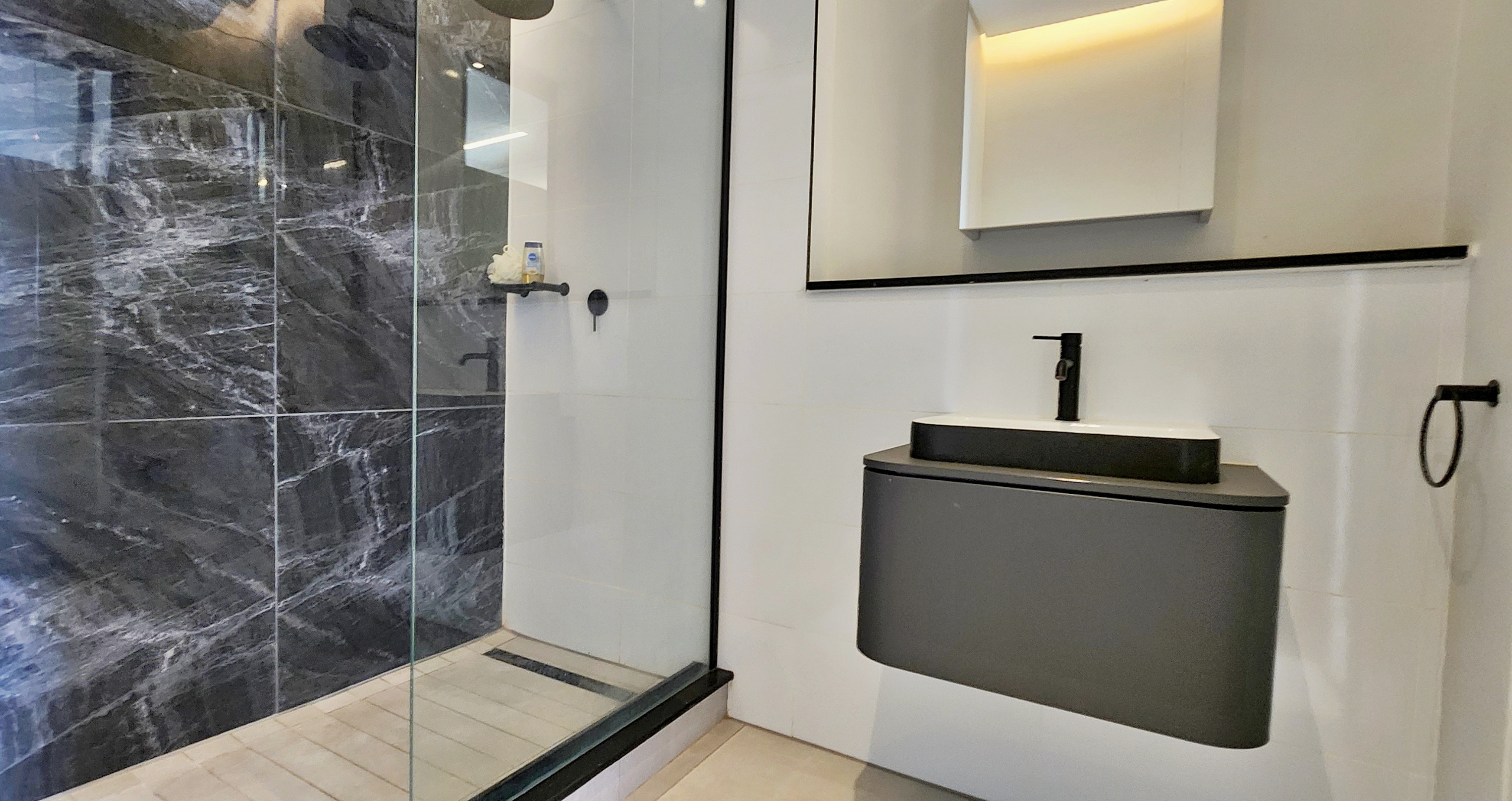 Both bedrooms are generously sized, each boasting its own built in cupboards and ensuite bathroom. The contemporary bathrooms feature spacious showers with sophisticated grey-black accent tiling, a modern vanity, and toilet all finished with elegant fittings, offering a luxurious retreat at the end of the day.