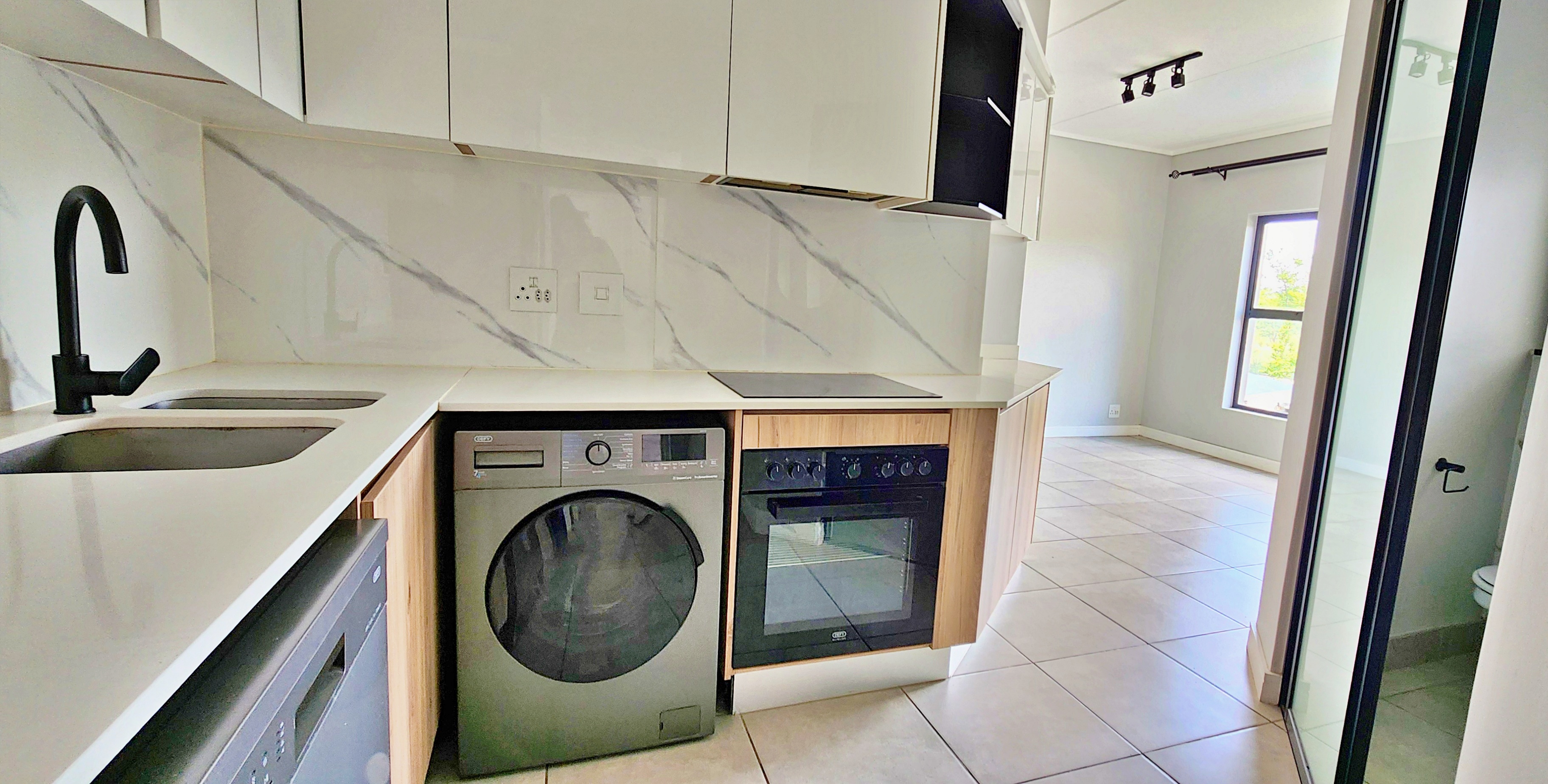 The stylish kitchen is thoughtfully designed and fully equipped with integrated appliances, including a washer/dryer combo, dishwasher, fridge-freezer, and an electric stove with hob, complemented by ample cabinetry for practical storage and clean lines.