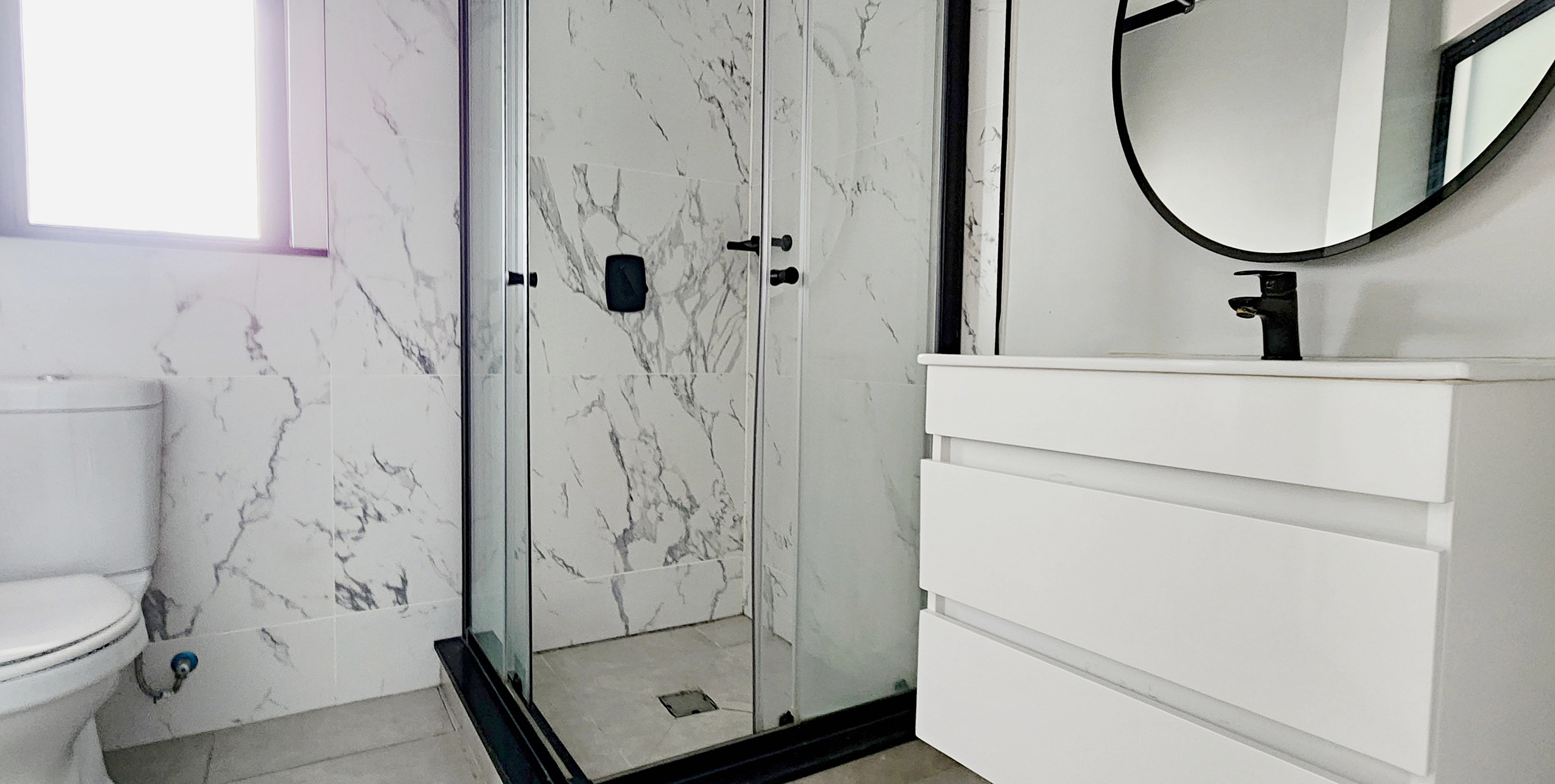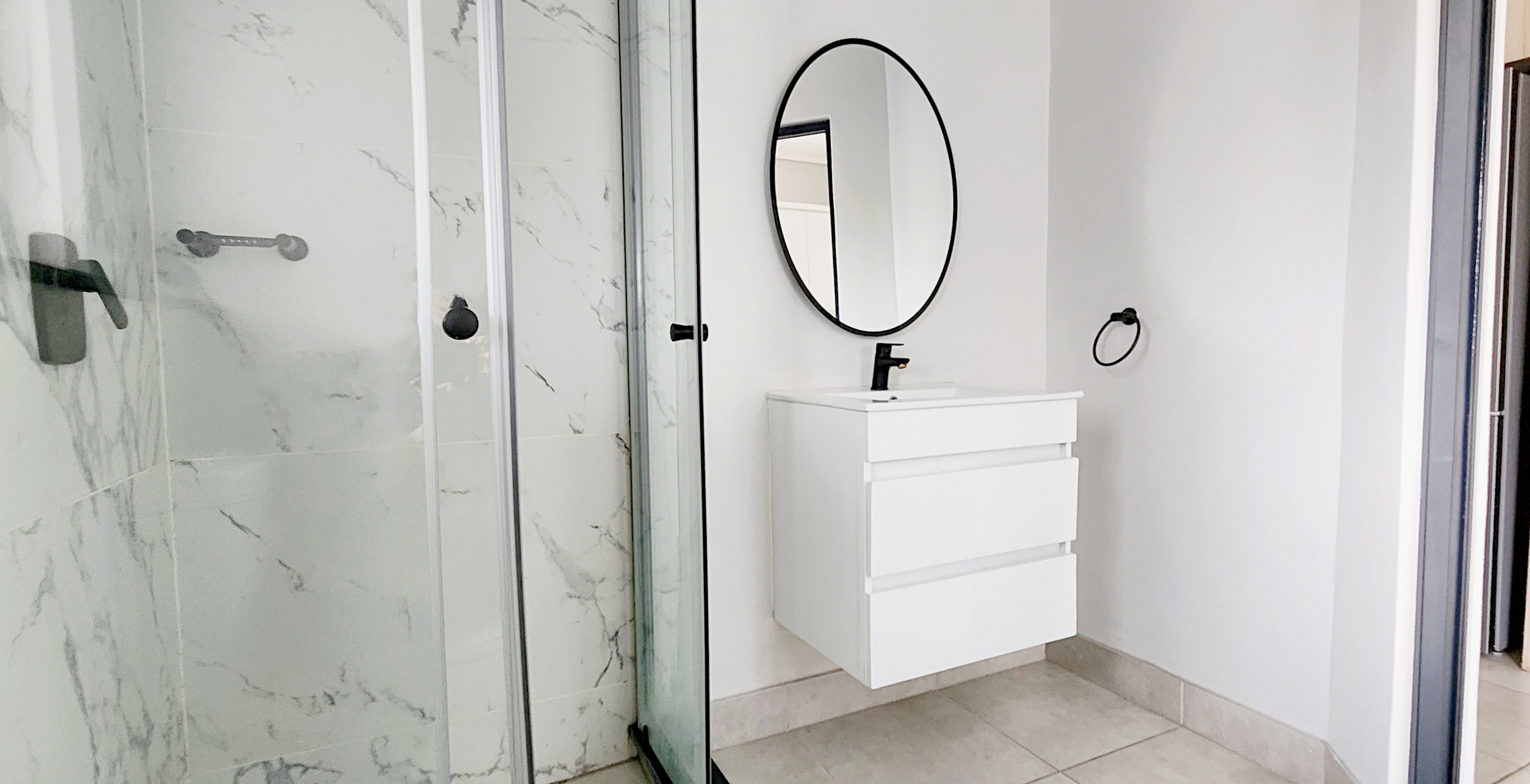 The bathroom is sleek and contemporary, featuring a spacious walk-in shower with elegant accent tiling, a single vanity, and a toilet—finished to a high standard.