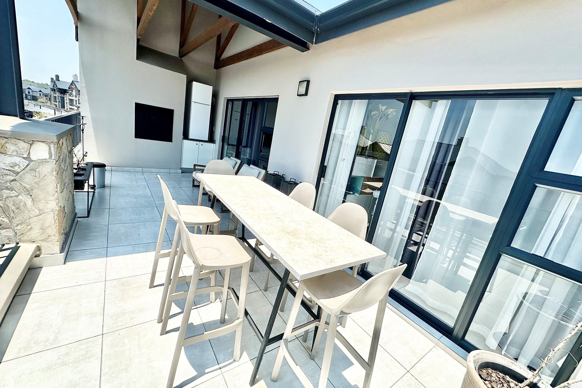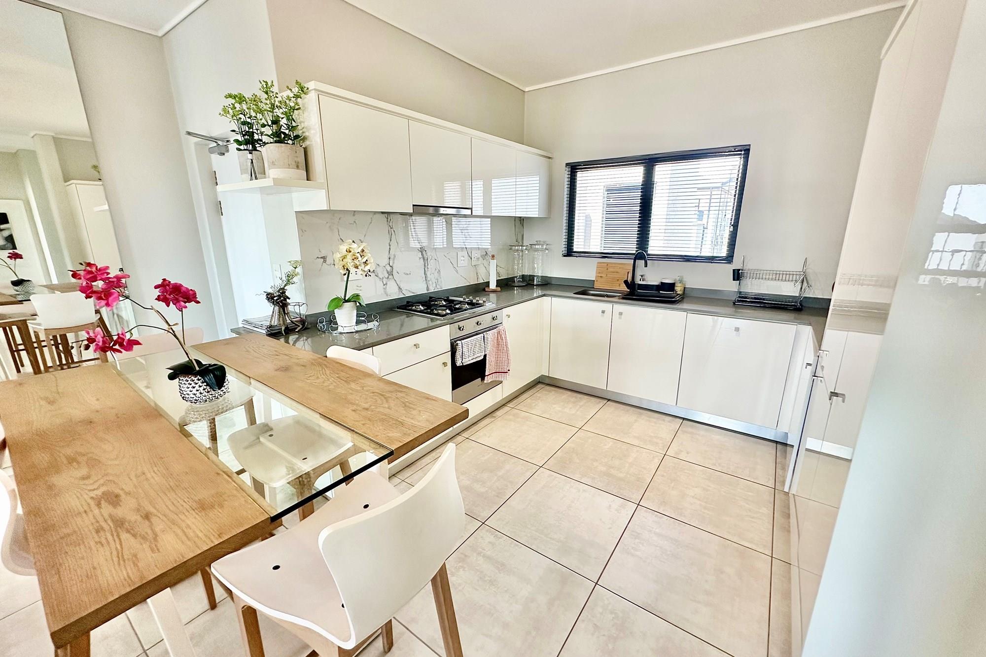 The spacious open-plan living area flows into a high-gloss SMEG kitchen, leading to a partially covered patio with a built-in gas braai.