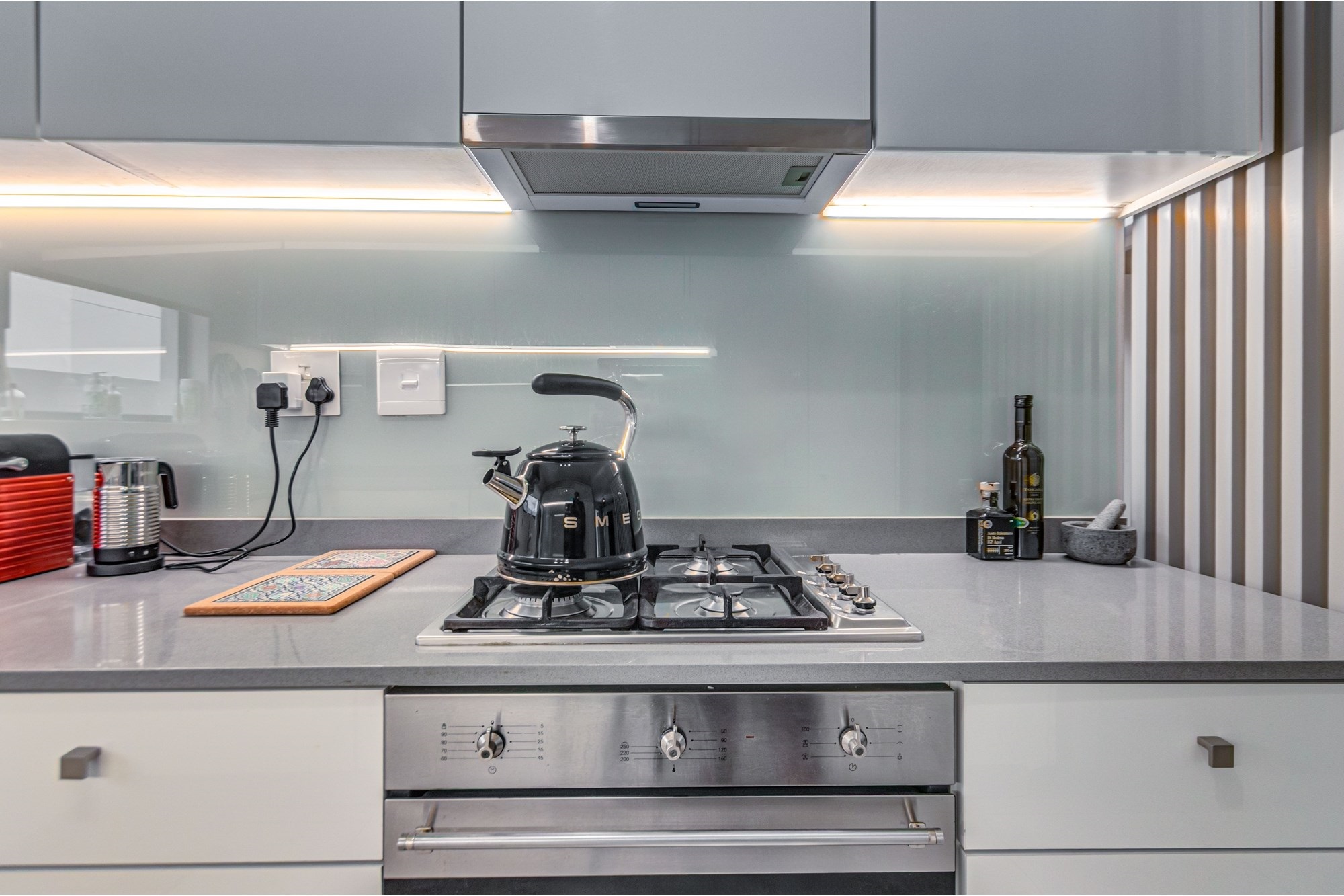 An open plan Kitchen sports integrated SMEG appliances such as a fridge/freezer combo, dishwasher, washing machine/tumble dryer, and a gas hob.
