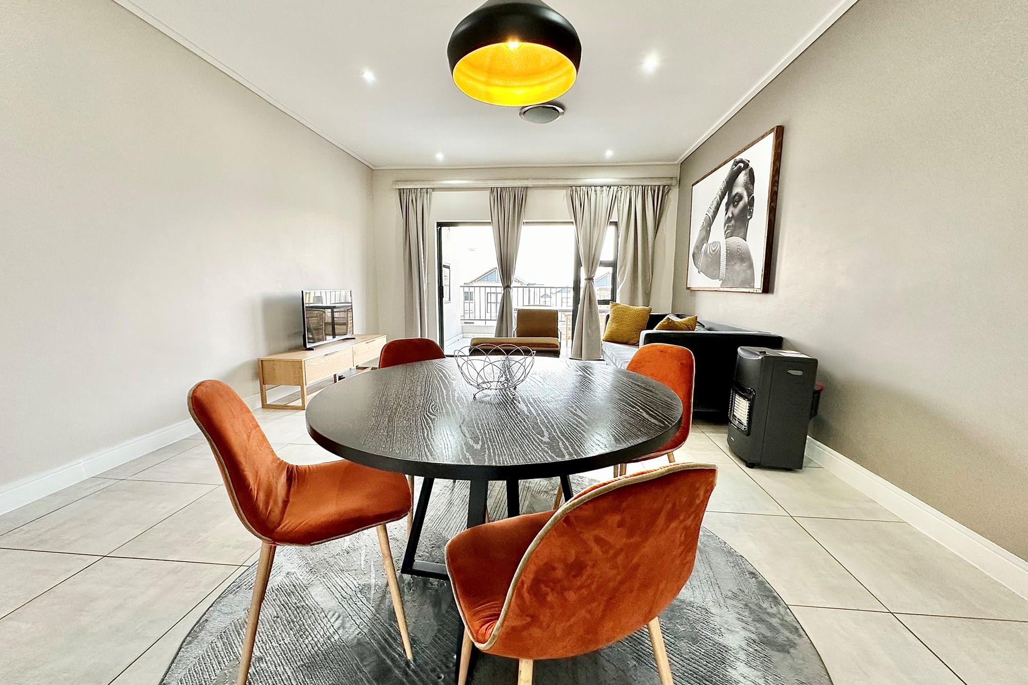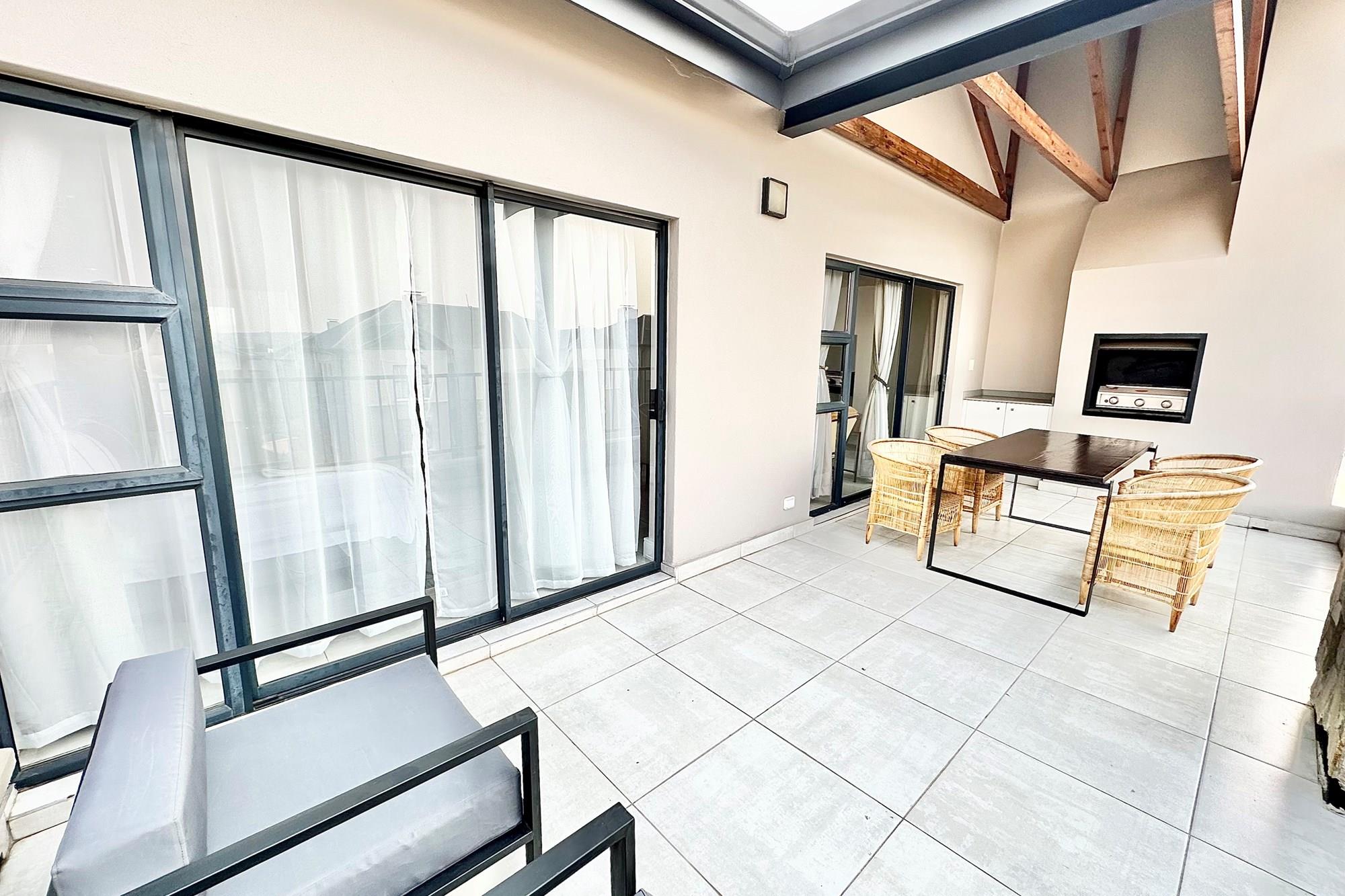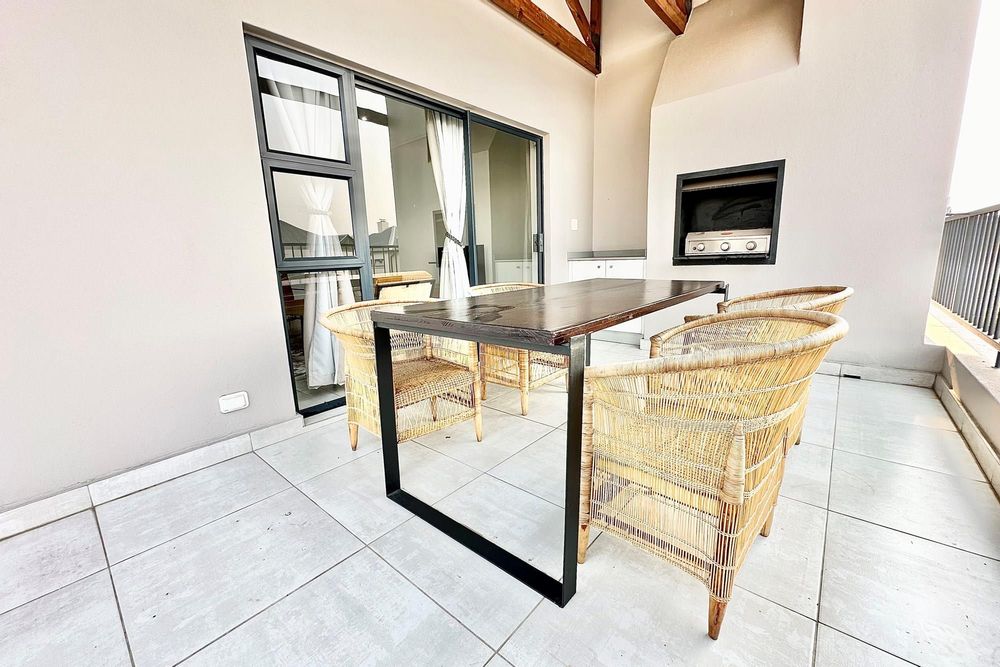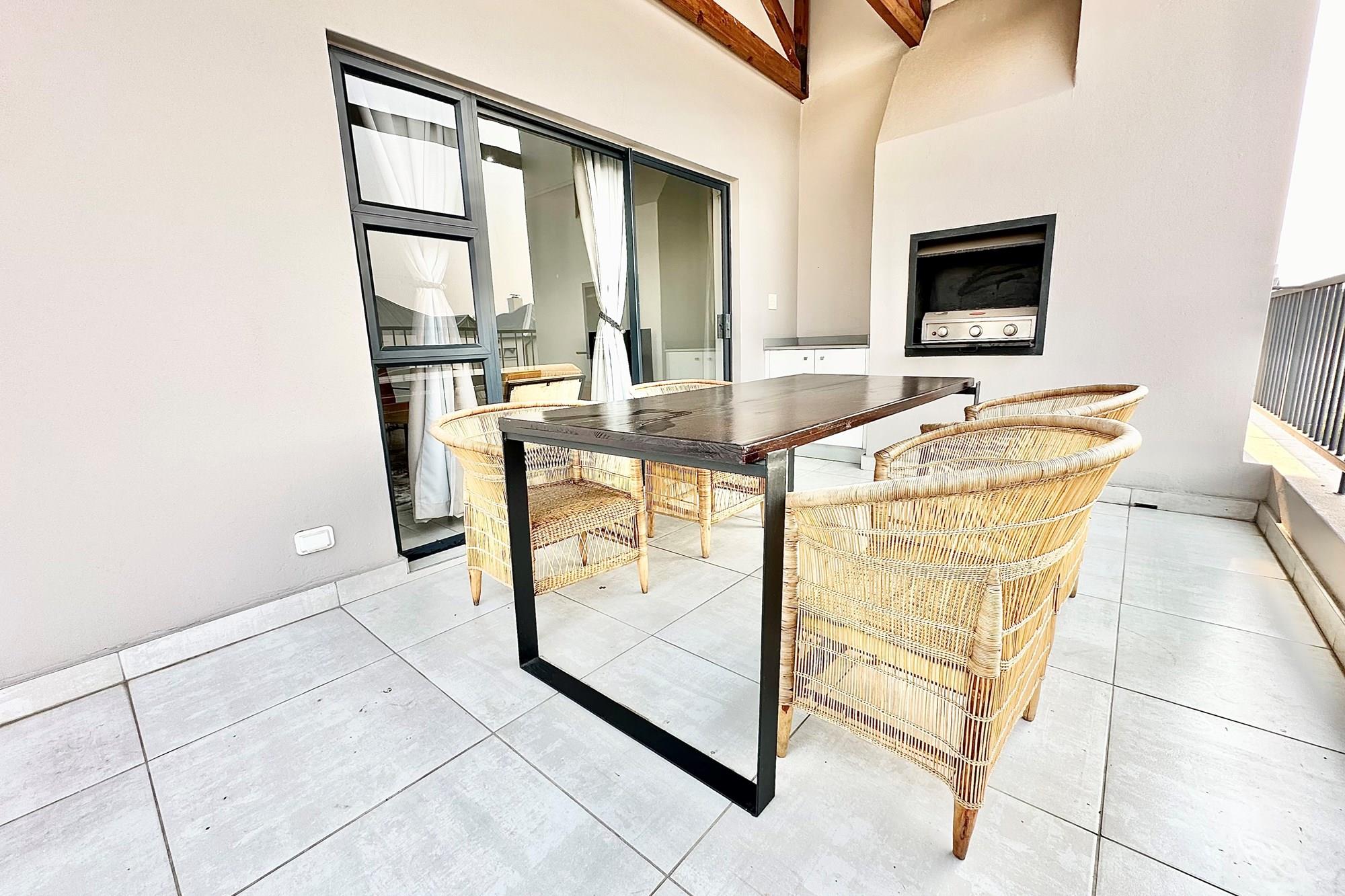 Stylish open-plan living & dining area leading to a spacious balcony with a built-in gas braai
