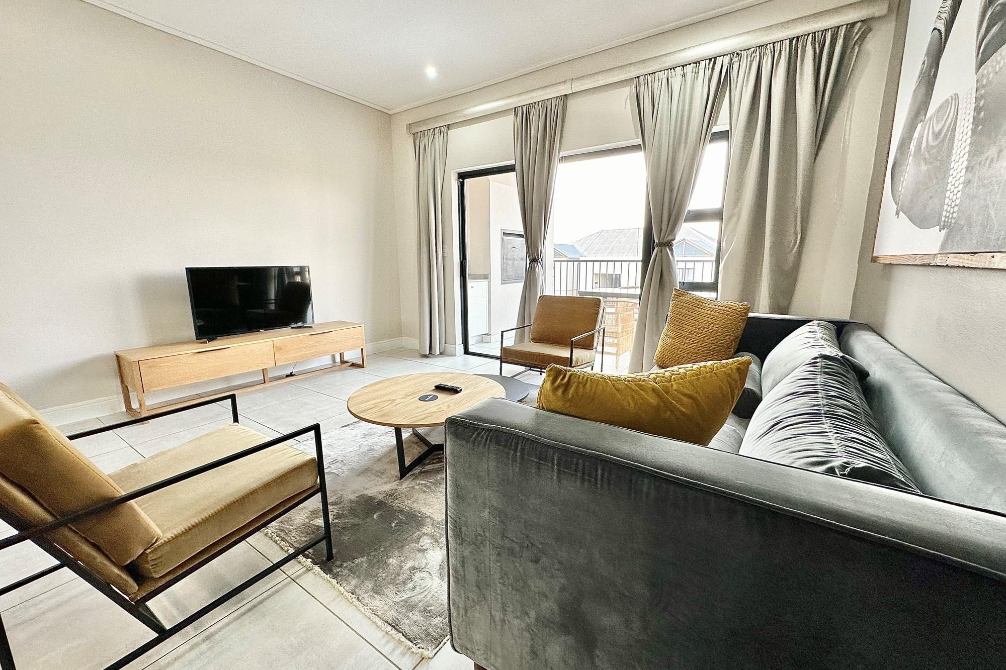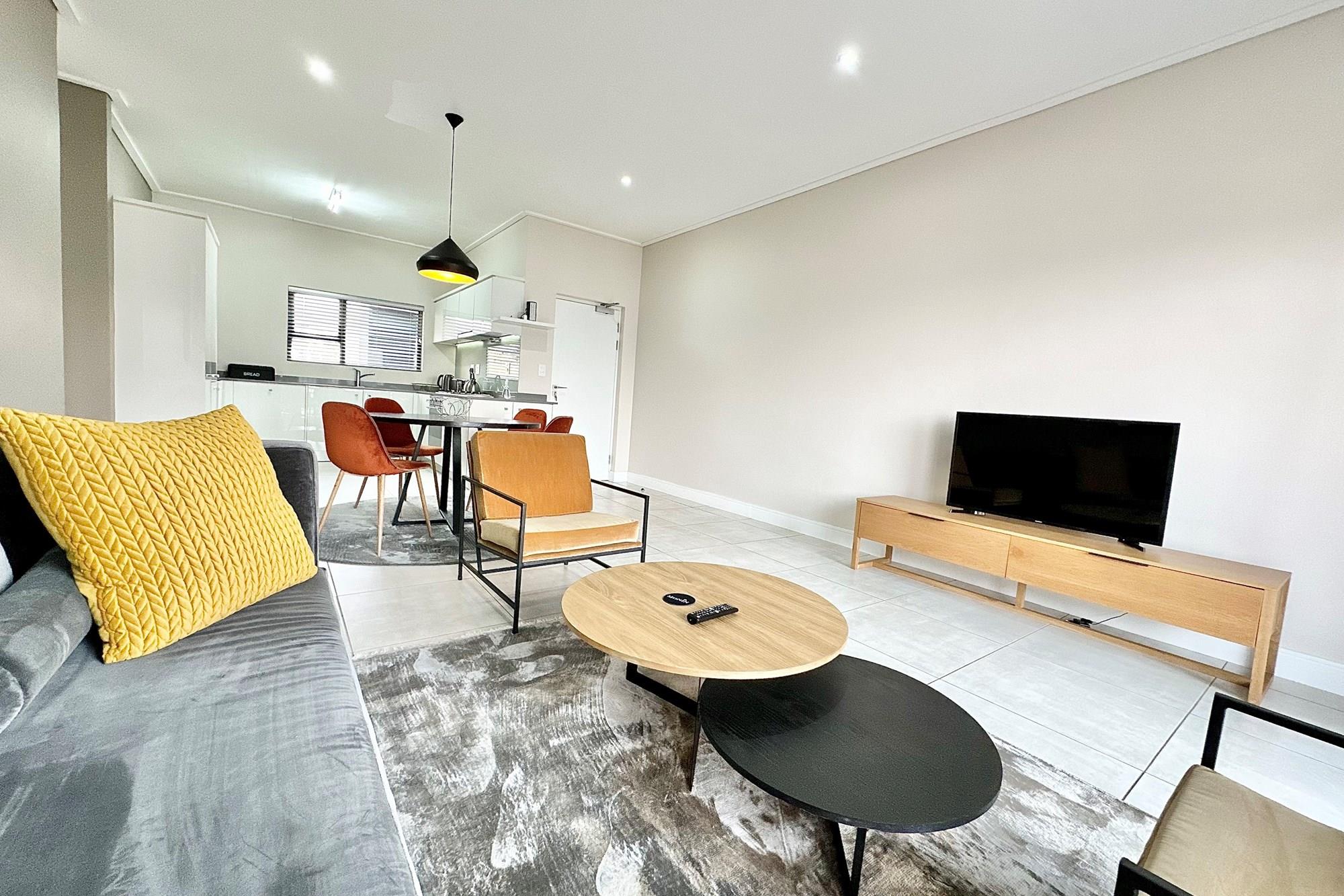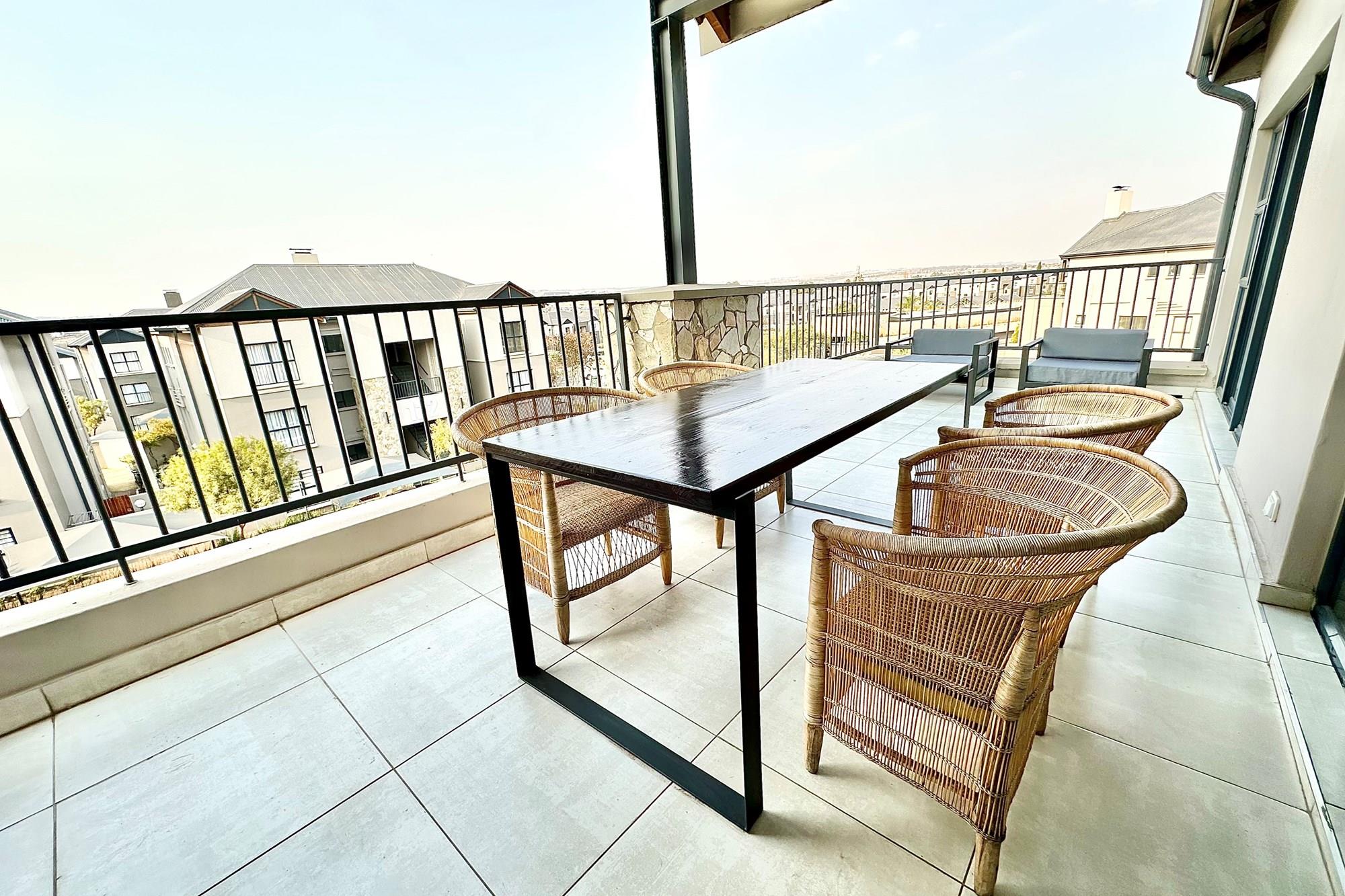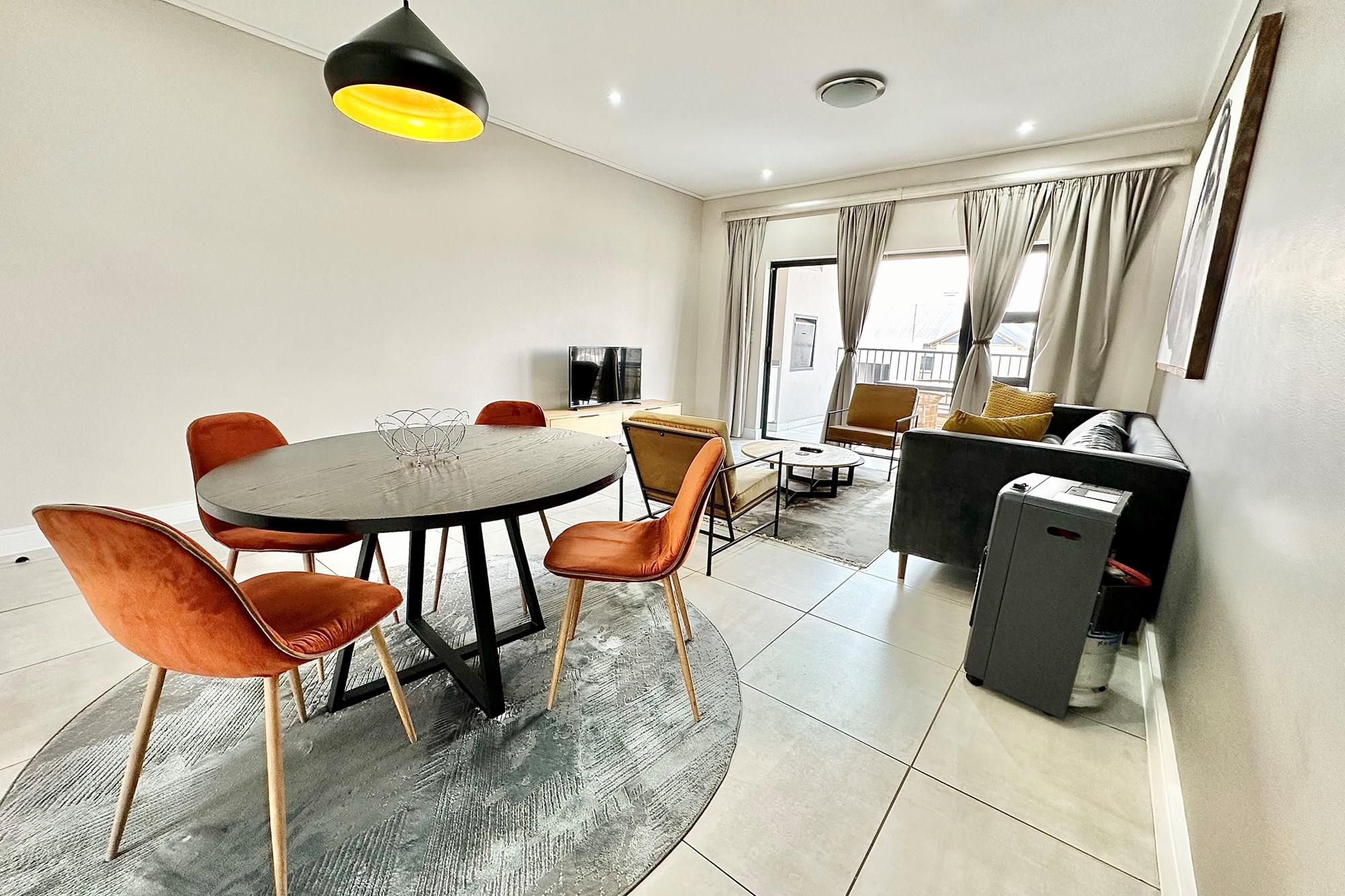 Stylish open-plan living & dining area leading to a spacious balcony with a built-in gas braai