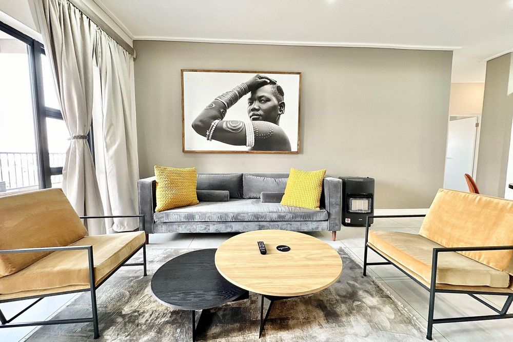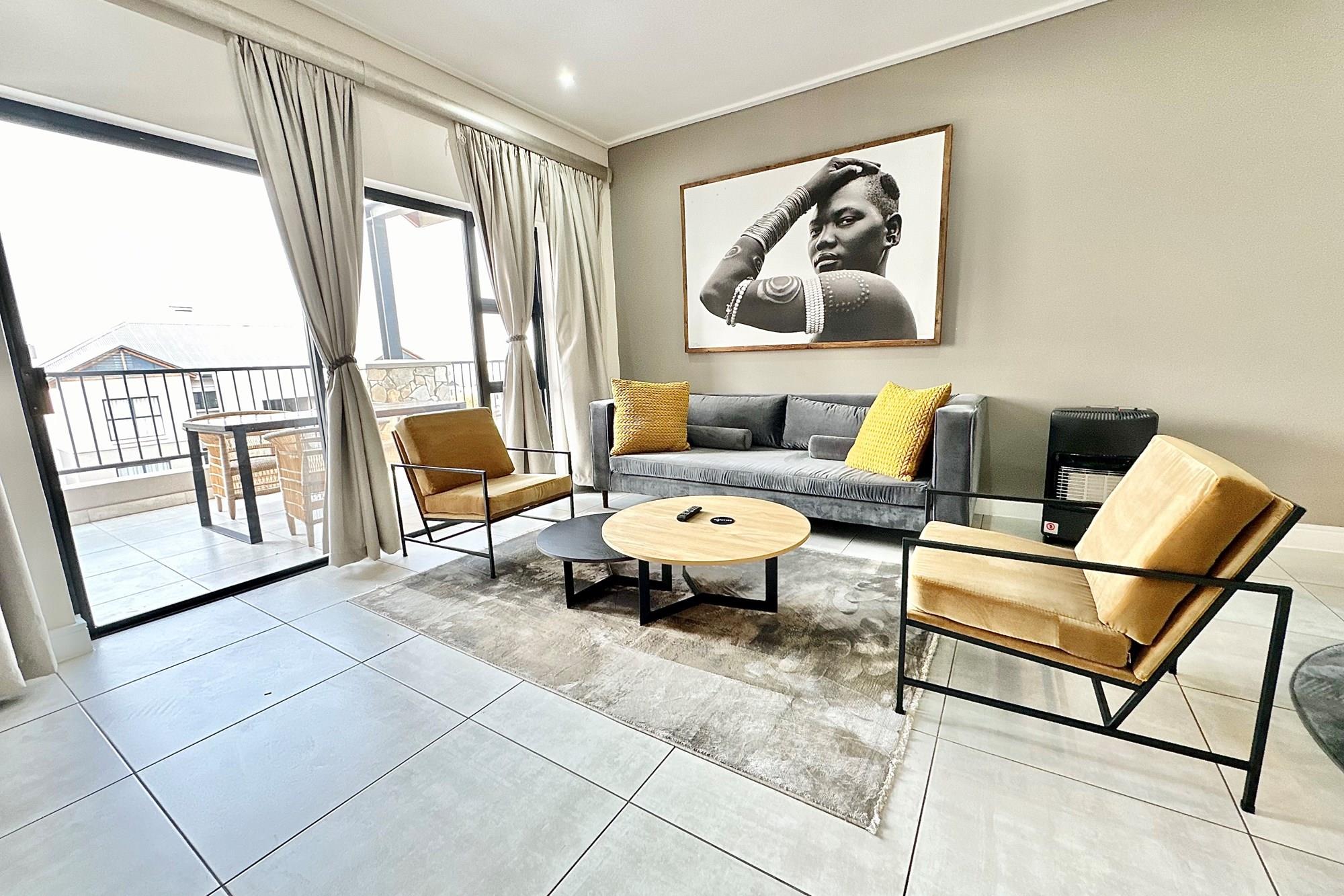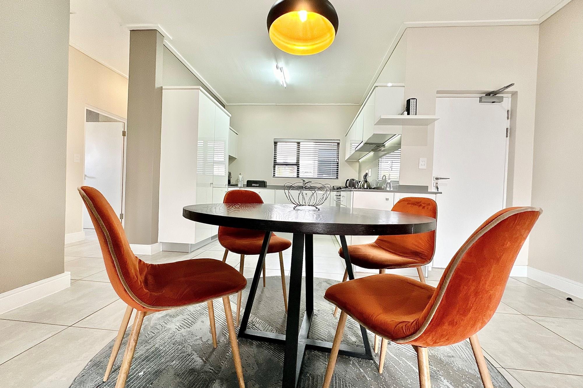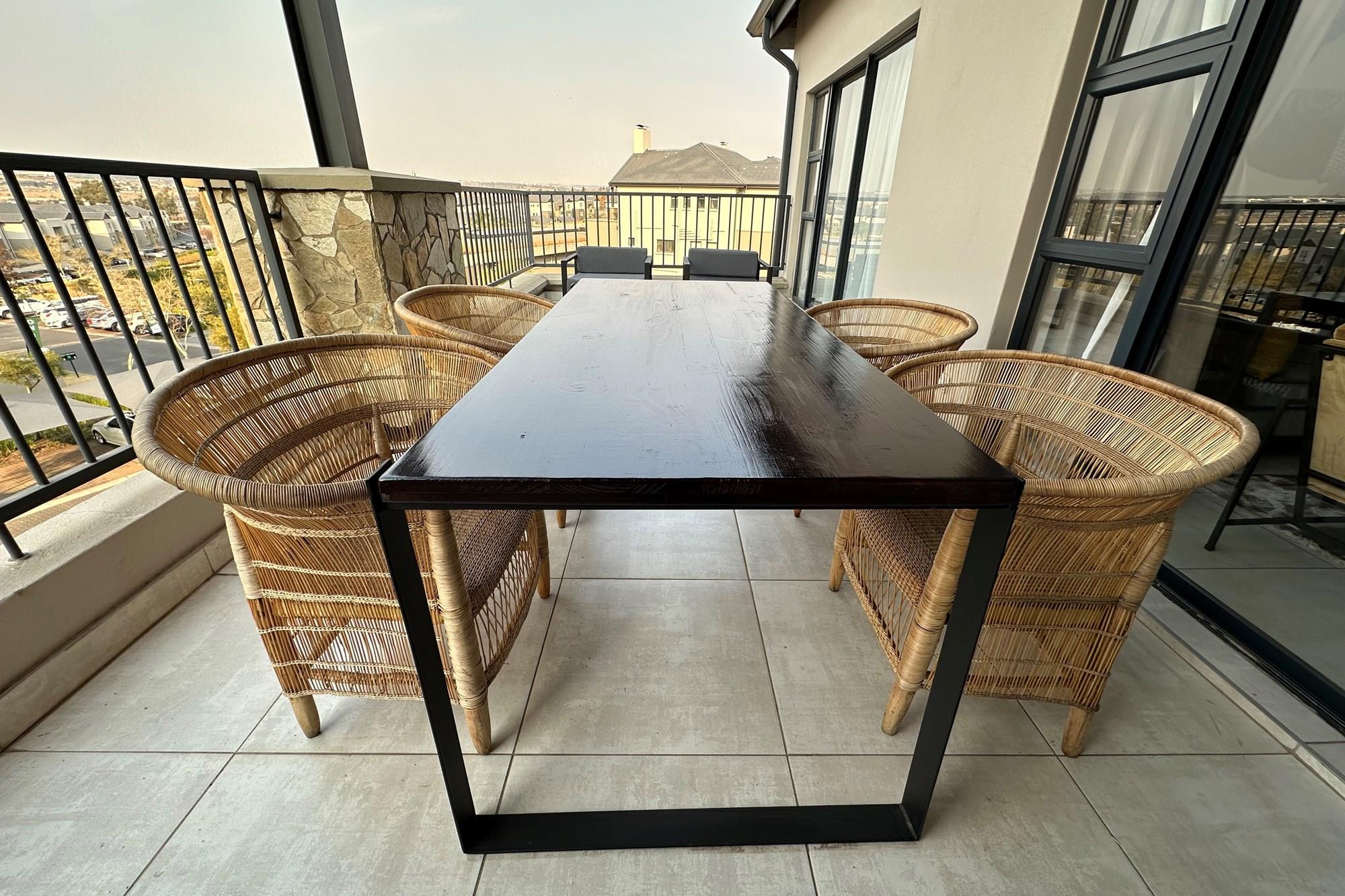 Stylish open-plan living & dining area leading to a spacious balcony with a built-in gas braai