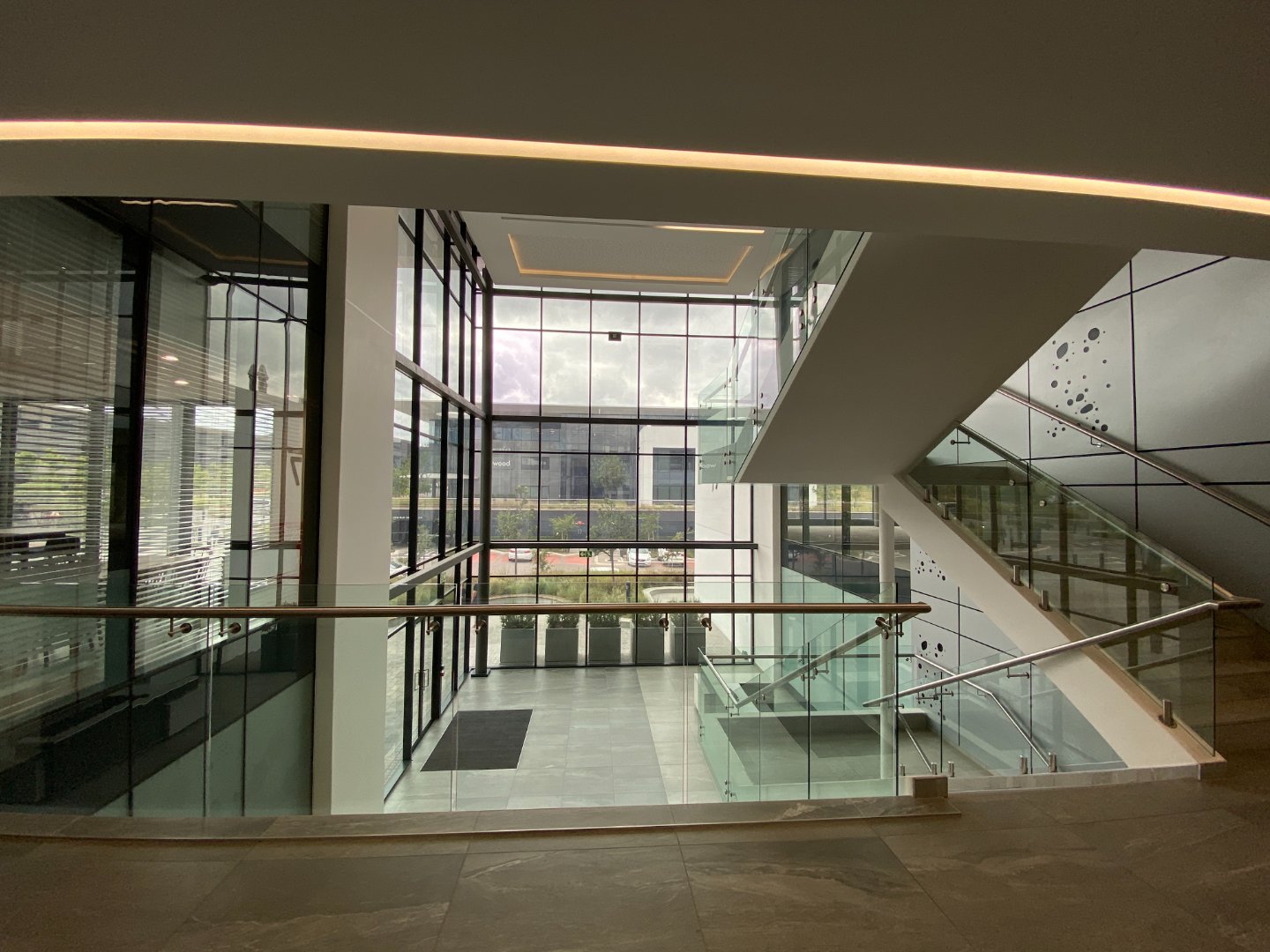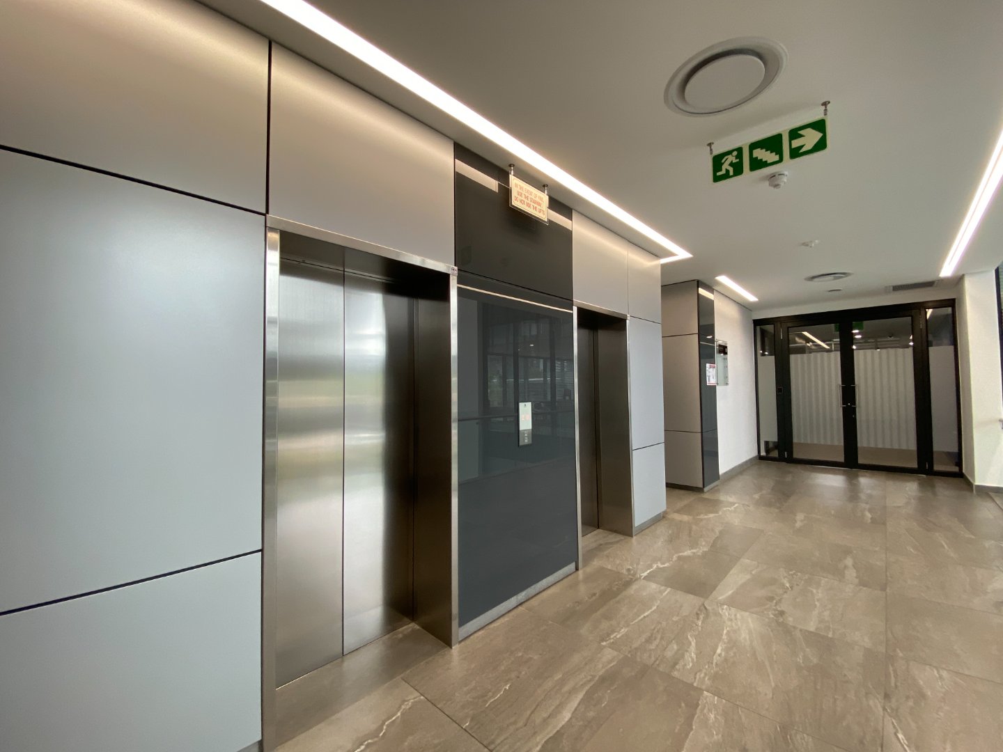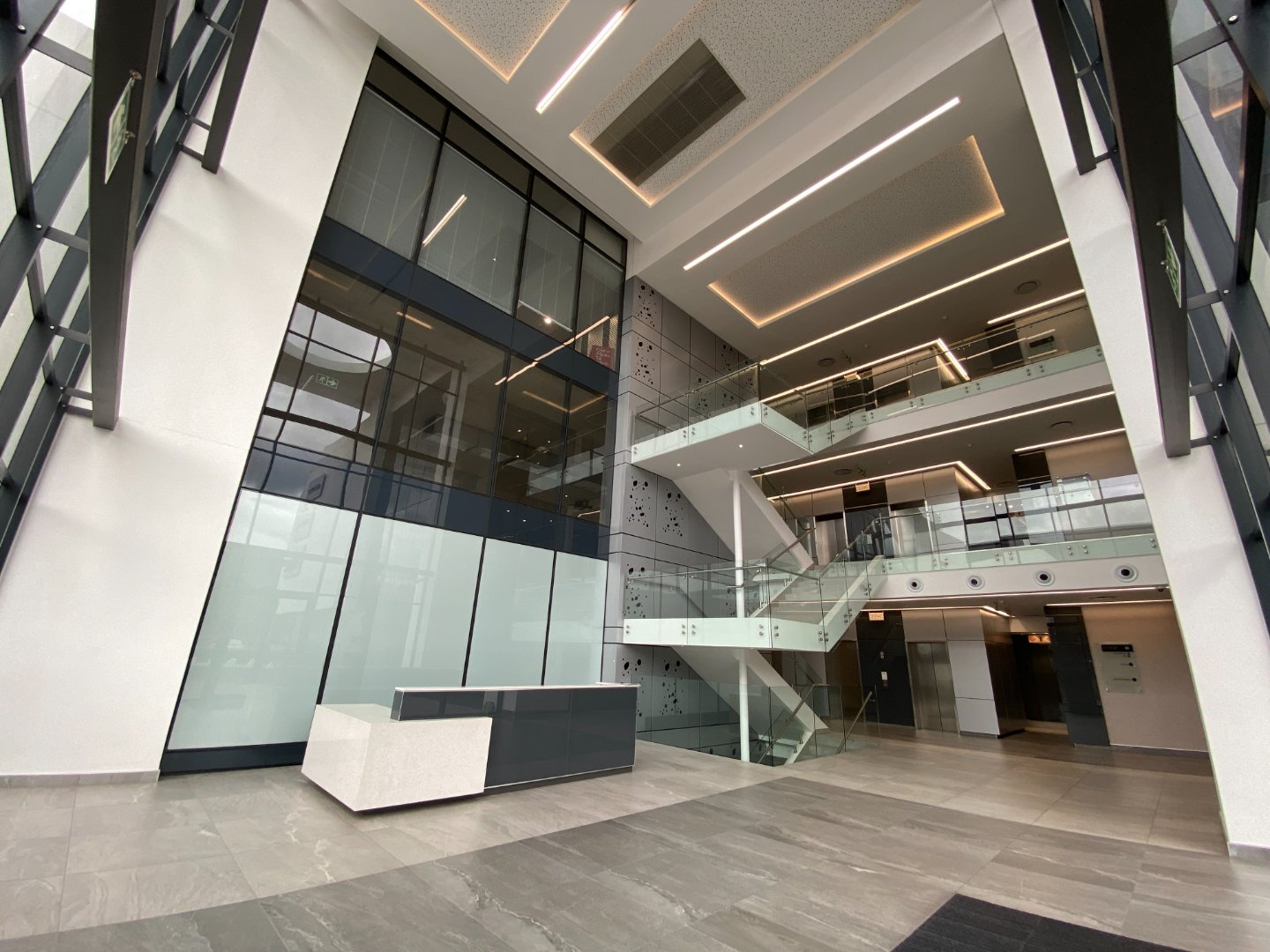 The light and airy building reception is inviting and provides access control as well as elevators to floor.