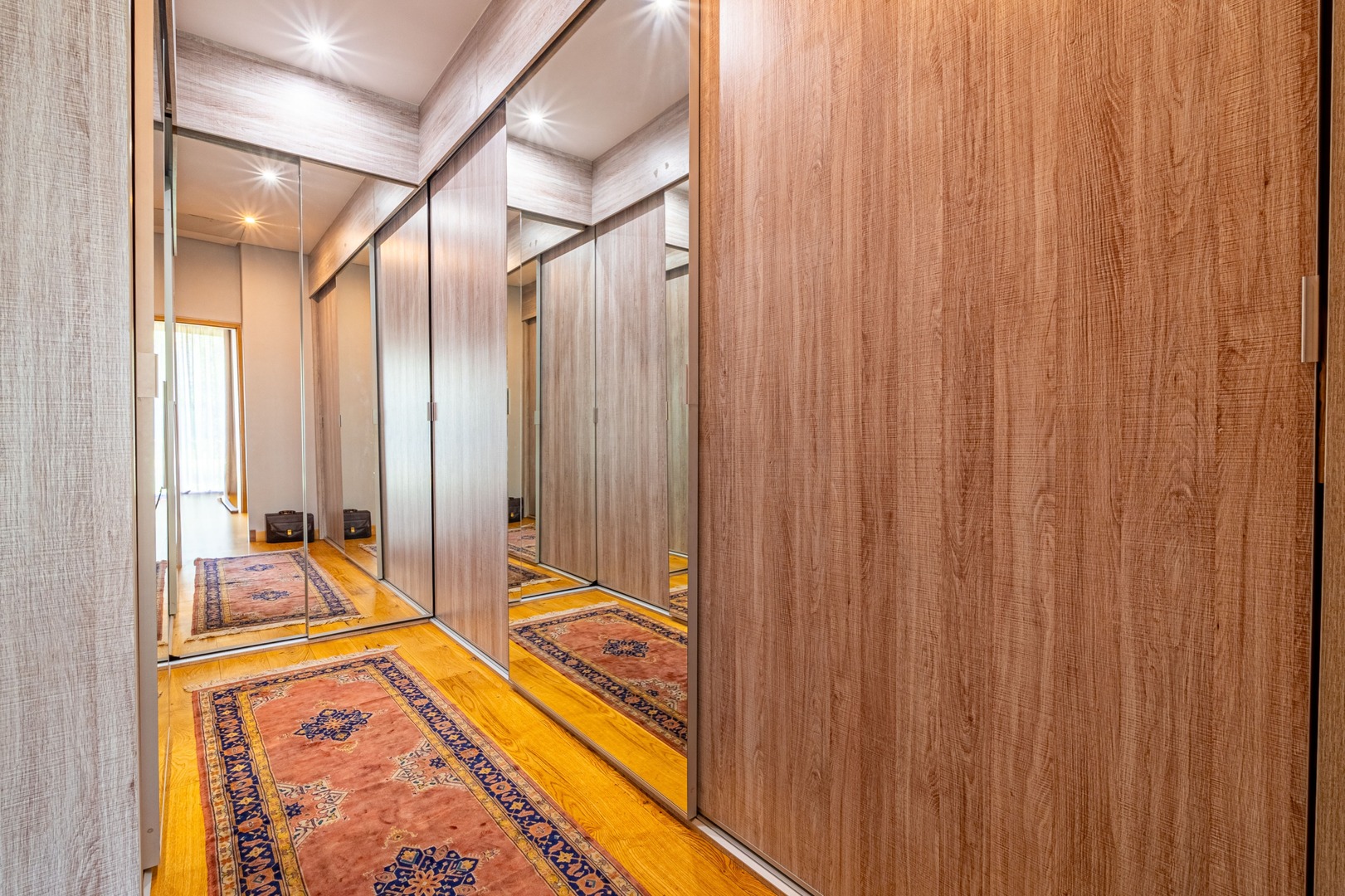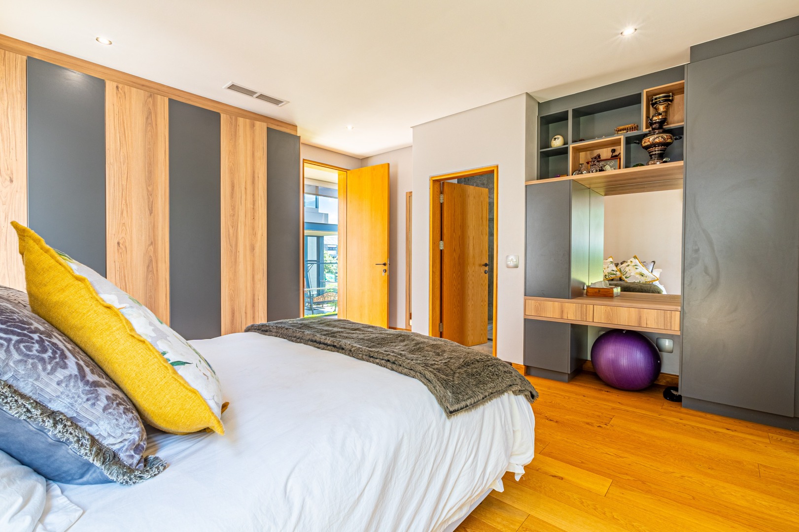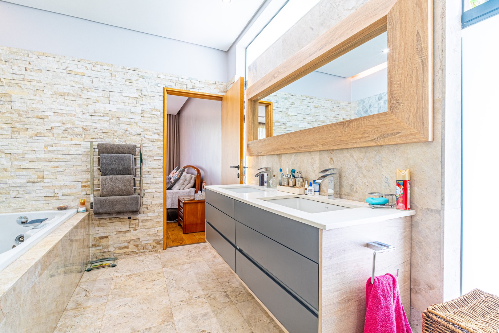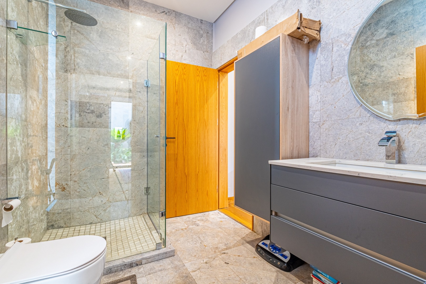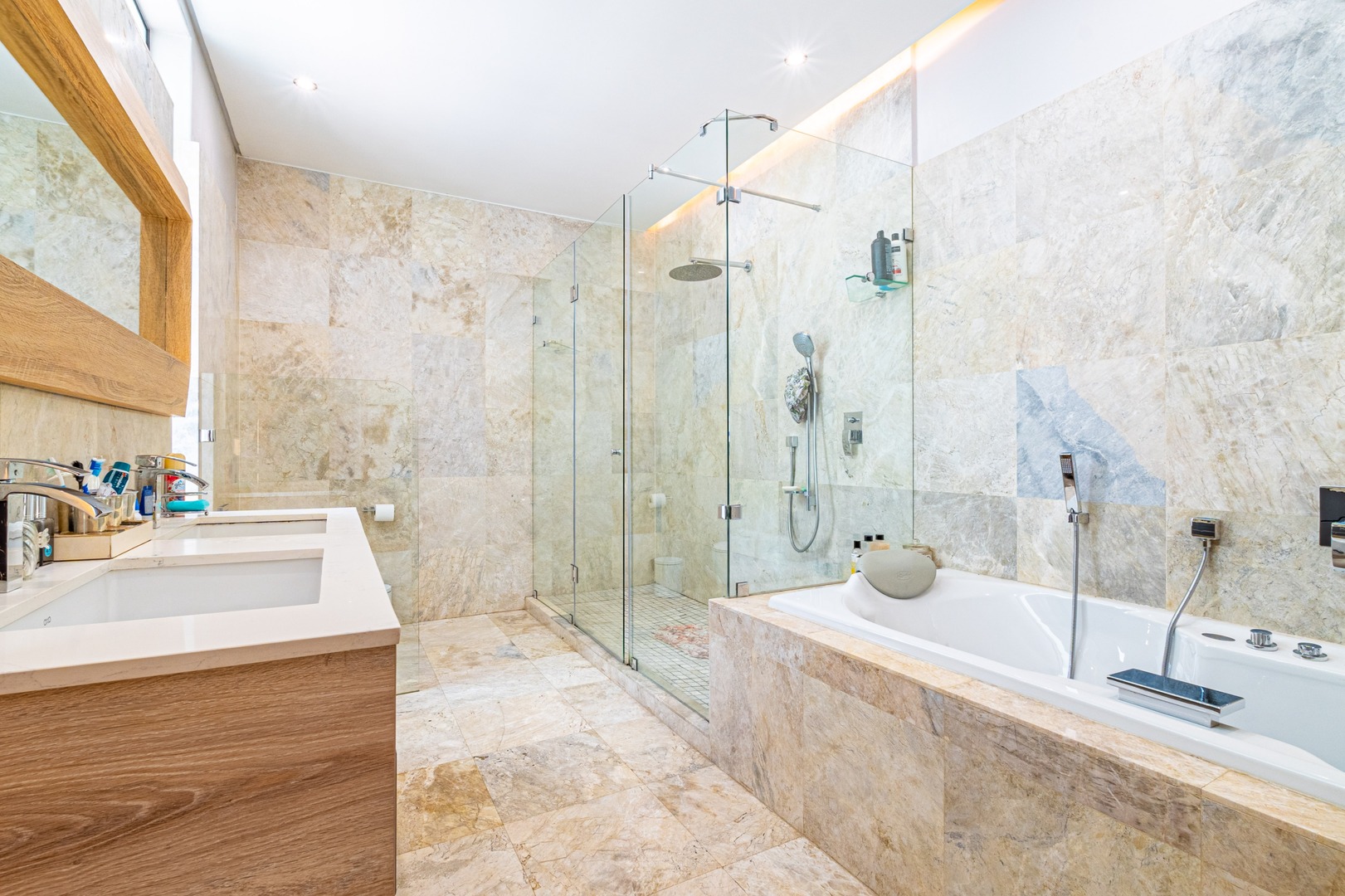 - The main bedroom is a private oasis, with direct garden access, a walk-in closet, and a spa-like en-suite bathroom adorned with marble finishes, a jacuzzi bath, and a bespoke shower.