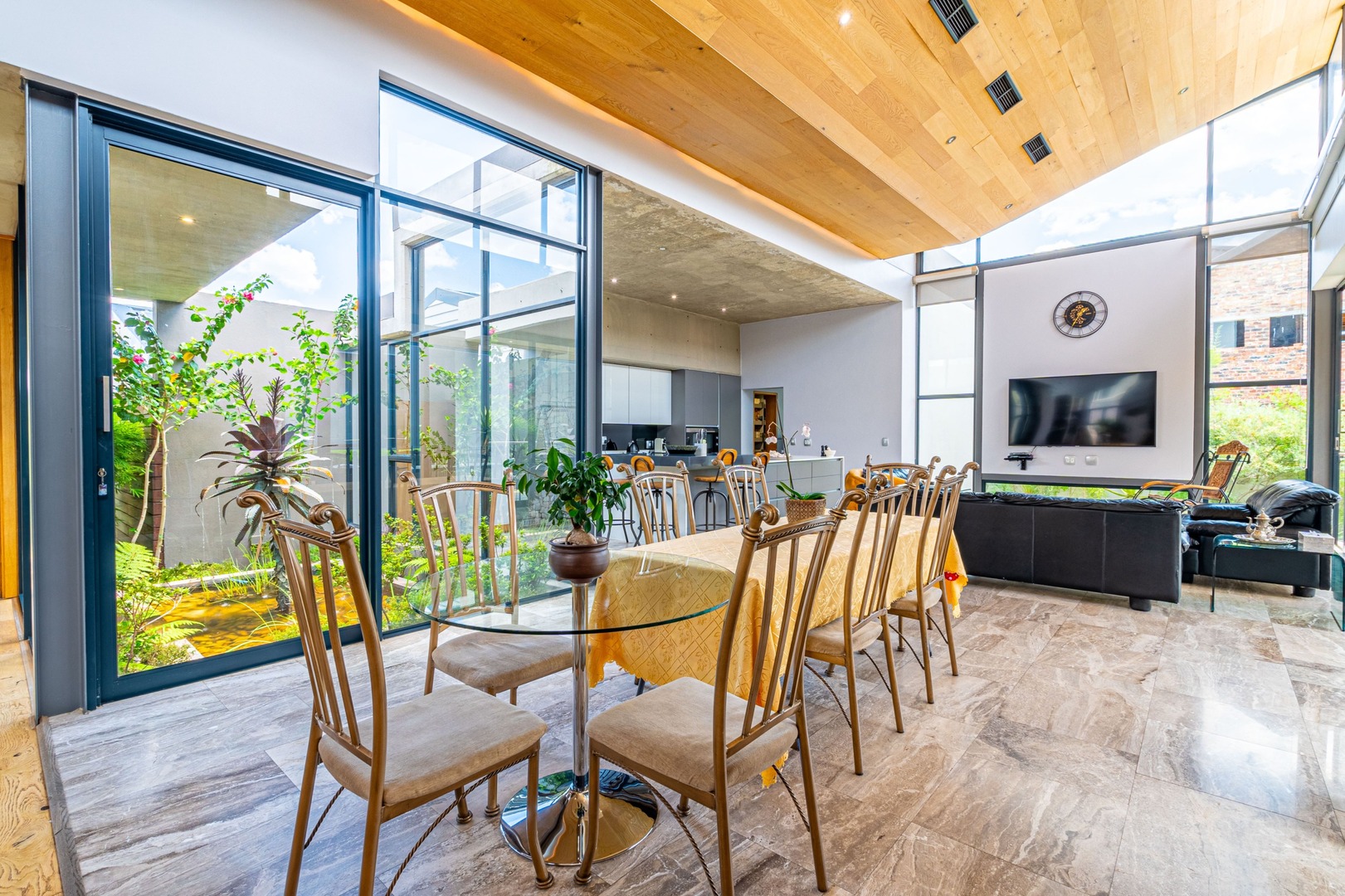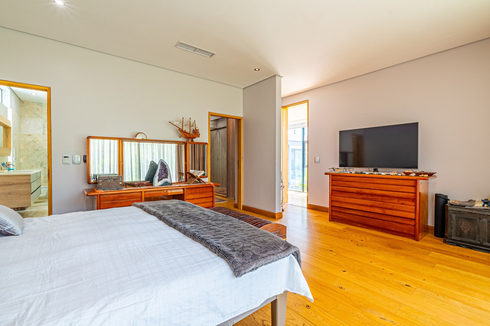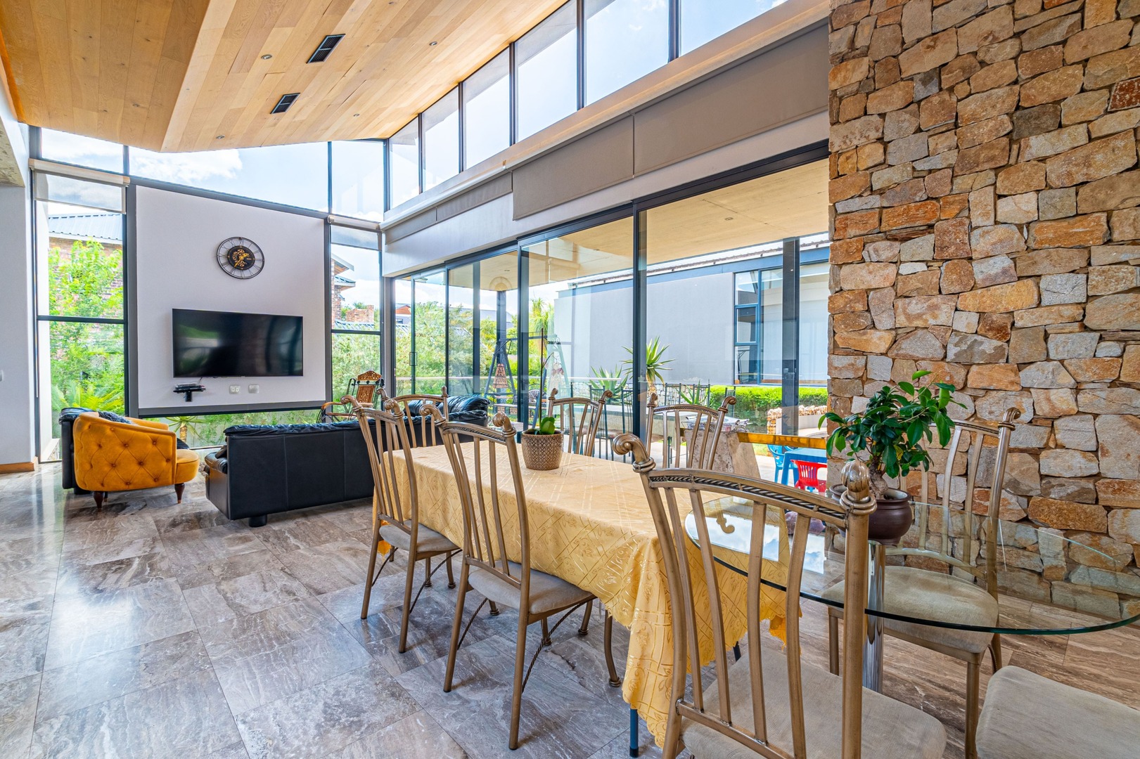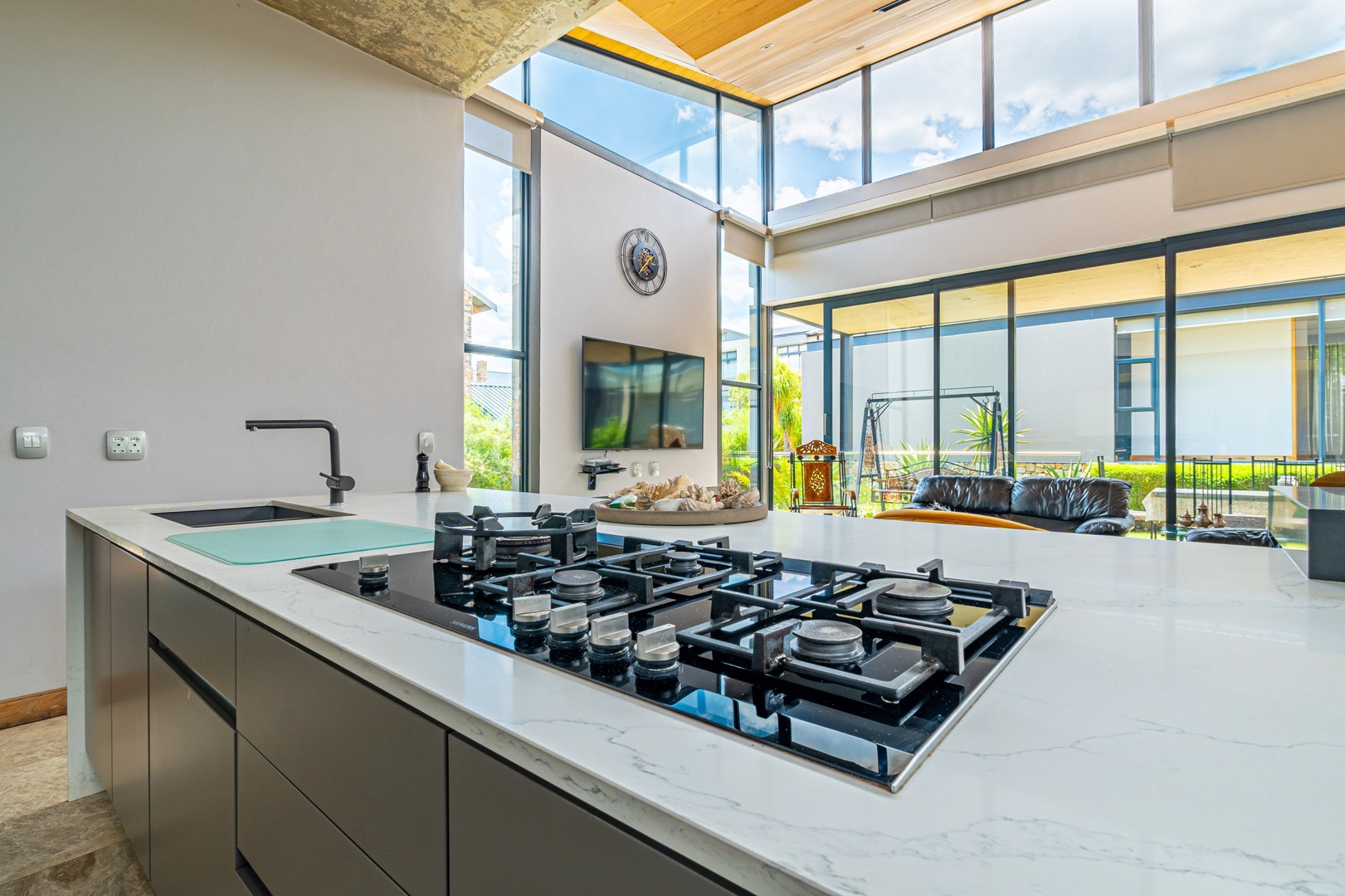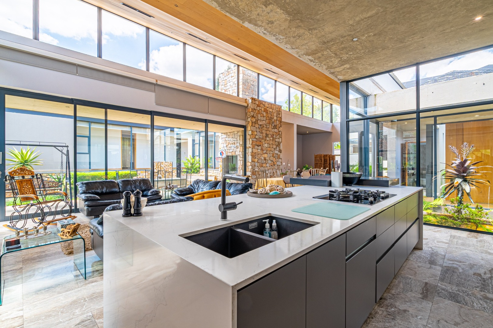 The left wing of the home boasts expansive open-plan living areas, seamlessly uniting the formal dining room, TV lounge, and a state-of-the-art kitchen. Featuring Siemens integrated appliances, a gas stove, and a spacious pantry, the kitchen is crowned with an imported oak ceiling, adding warmth and sophistication. A separate scullery ensures practicality, while the adjacent formal lounge provides an intimate retreat for quiet evenings or hosting guests. A stylish guest toilet is conveniently located near the main living areas.