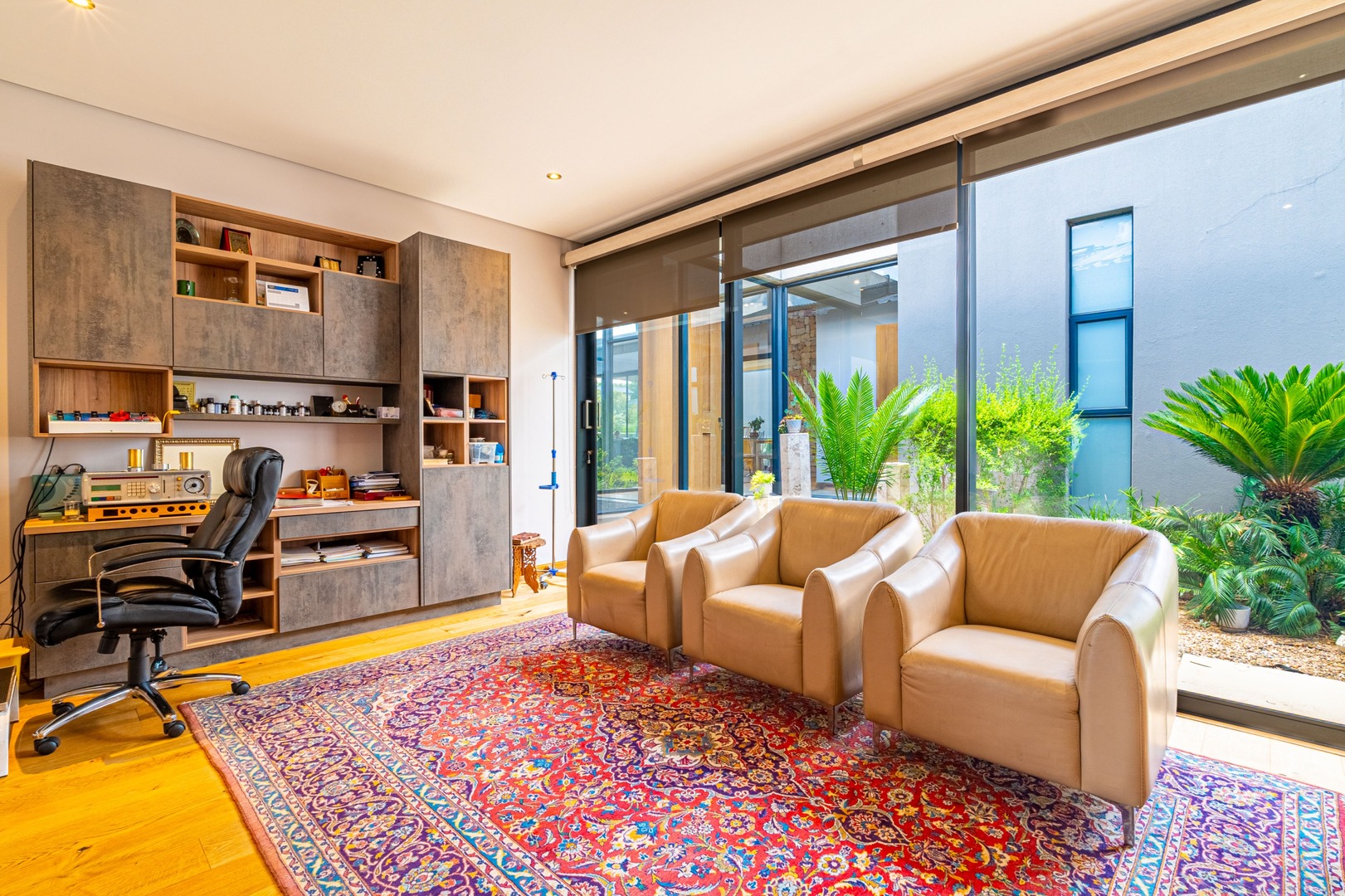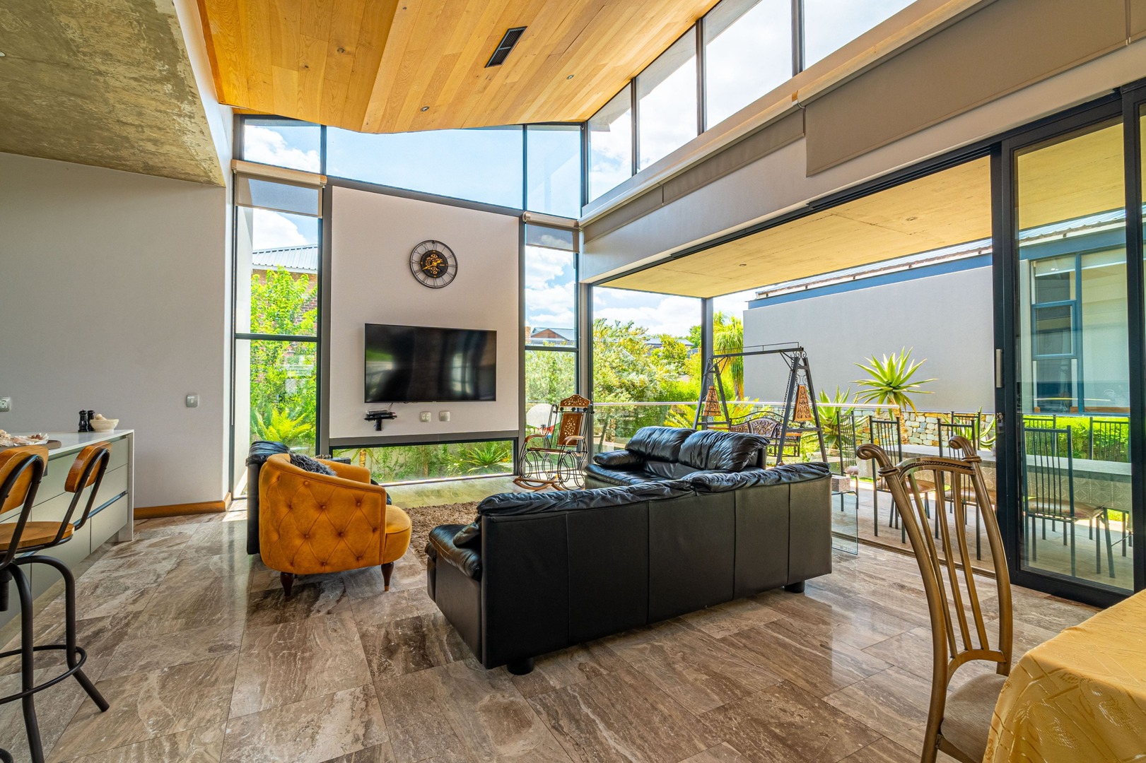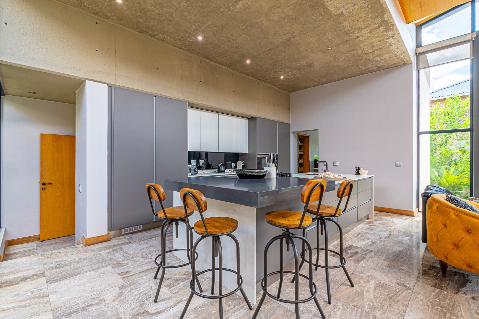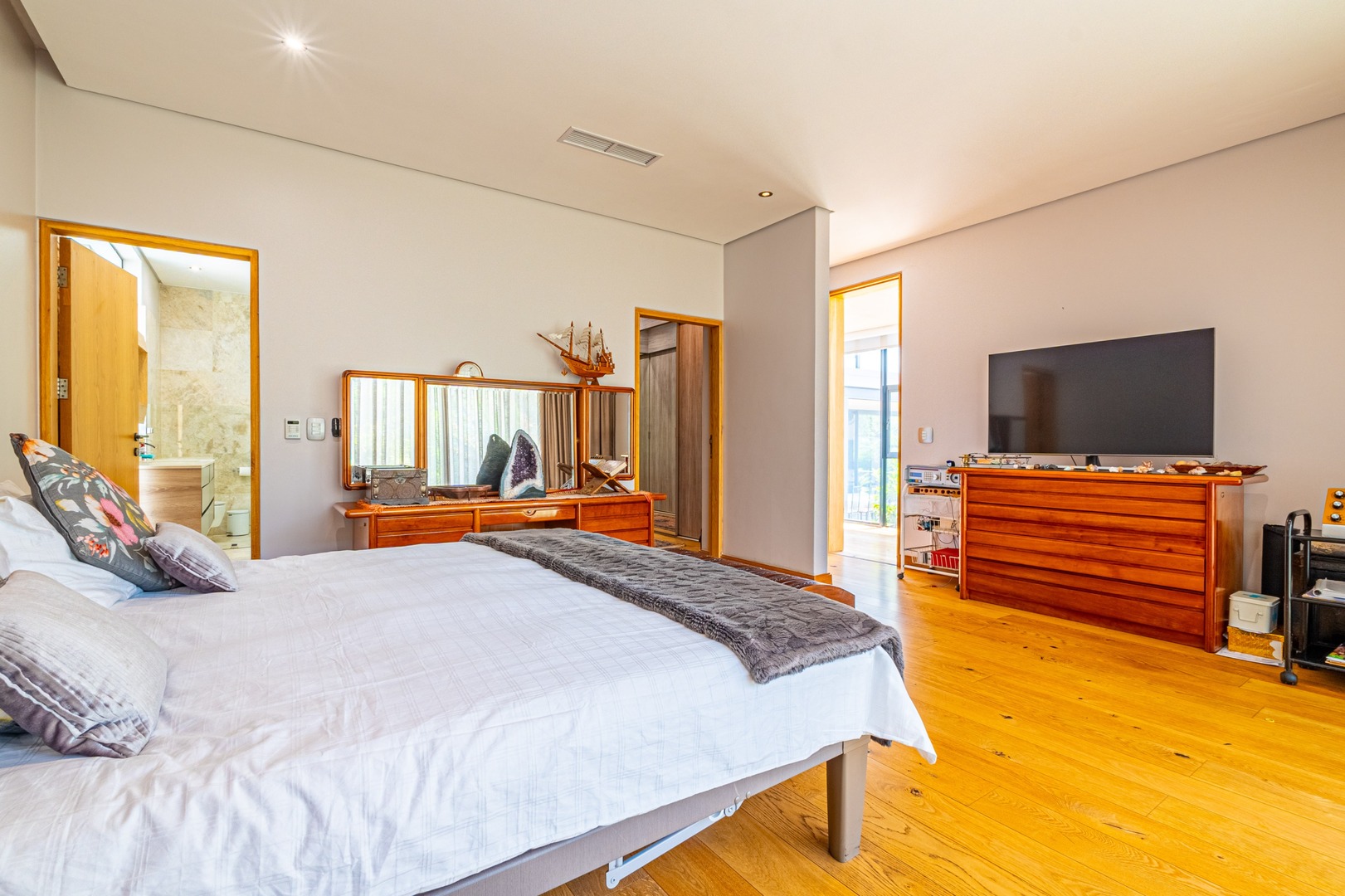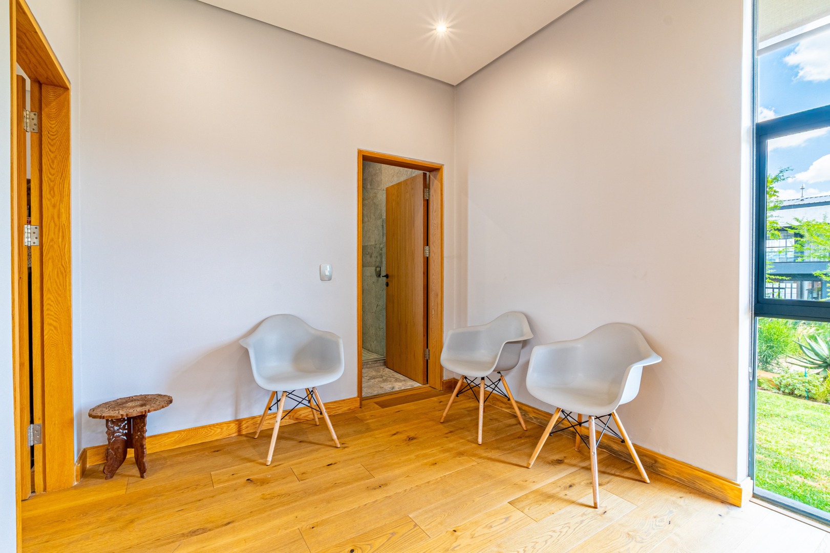 The left wing of the home boasts expansive open-plan living areas, seamlessly uniting the formal dining room, TV lounge, and a state-of-the-art kitchen. Featuring Siemens integrated appliances, a gas stove, and a spacious pantry, the kitchen is crowned with an imported oak ceiling, adding warmth and sophistication. A separate scullery ensures practicality, while the adjacent formal lounge provides an intimate retreat for quiet evenings or hosting guests. A stylish guest toilet is conveniently located near the main living areas.