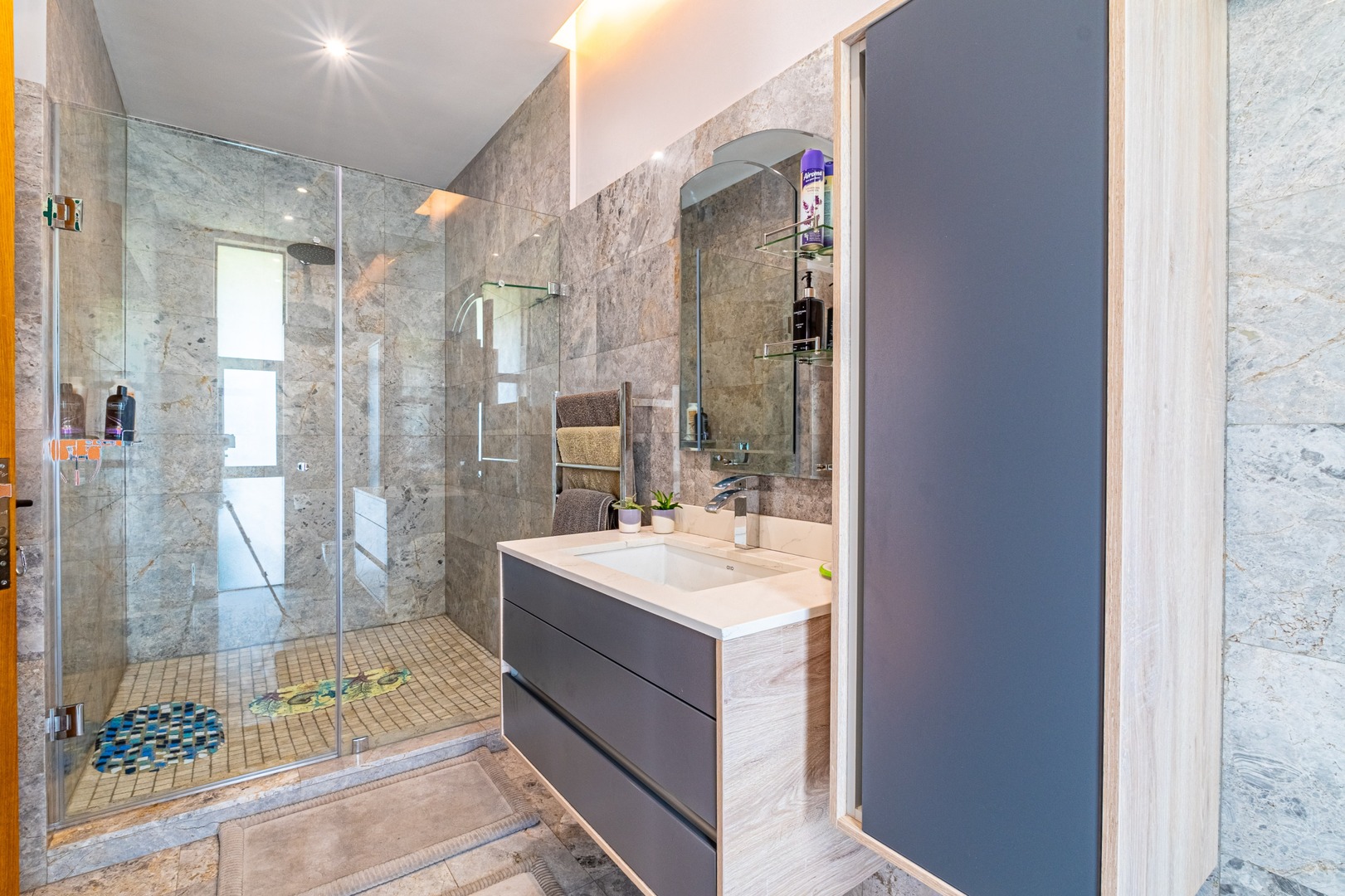 - The third bedroom, located a few steps down for added privacy, is equally inviting, with its own garden access and en-suite shower. A convenient linen closet completes this wing.