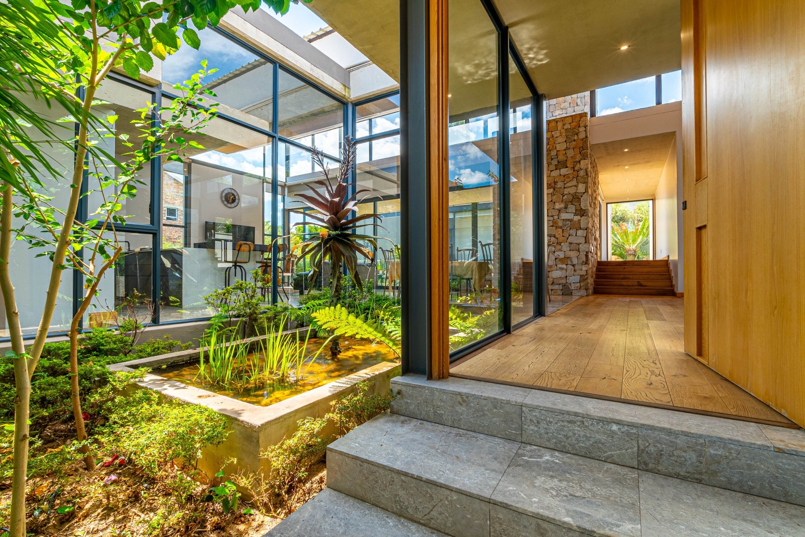 A serene water feature and meticulously landscaped greenery welcome you into this exquisite residence, setting the tone for the exceptional living experience that lies within.