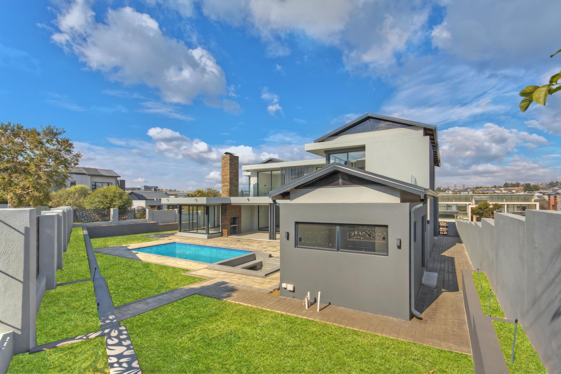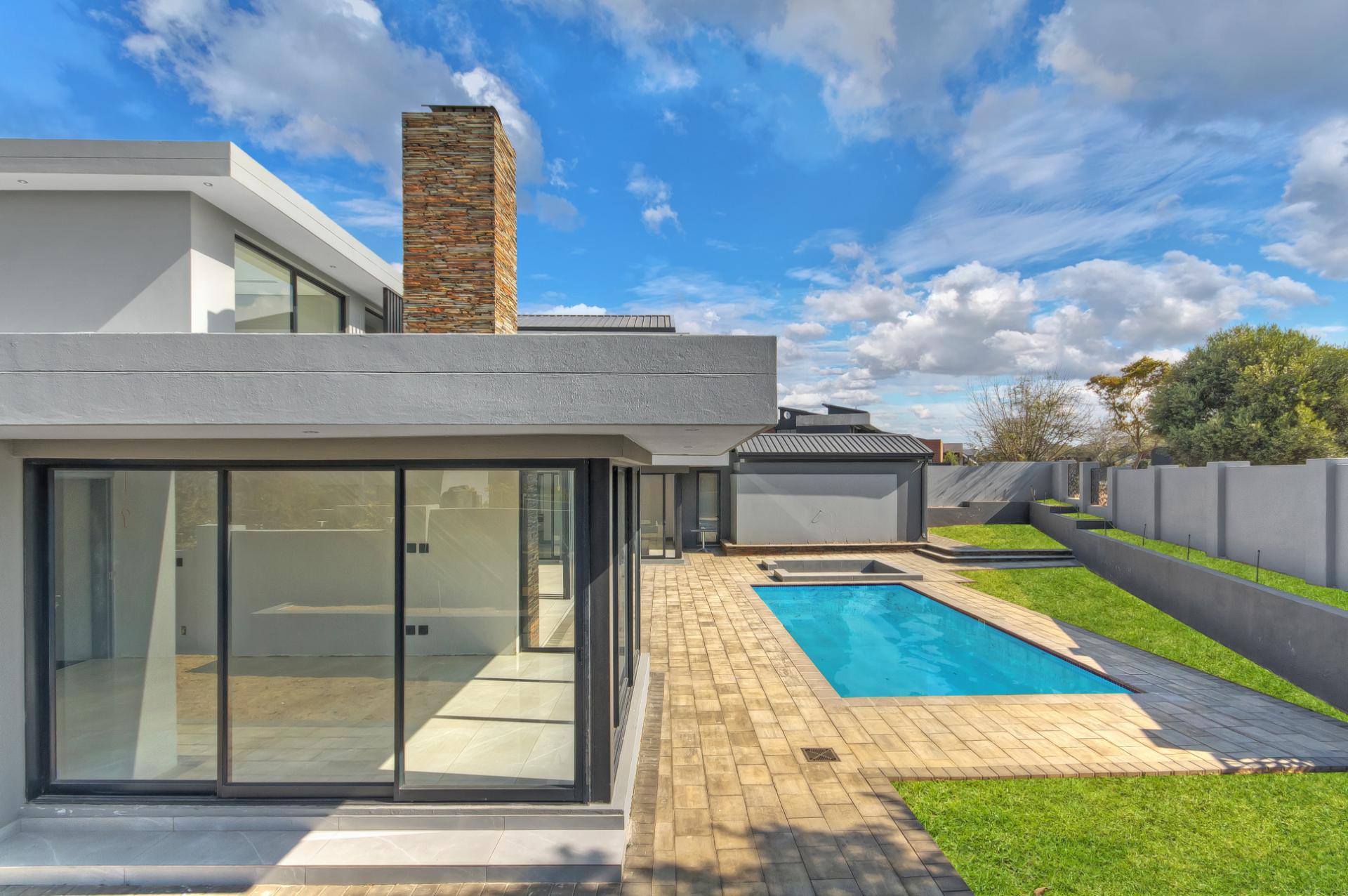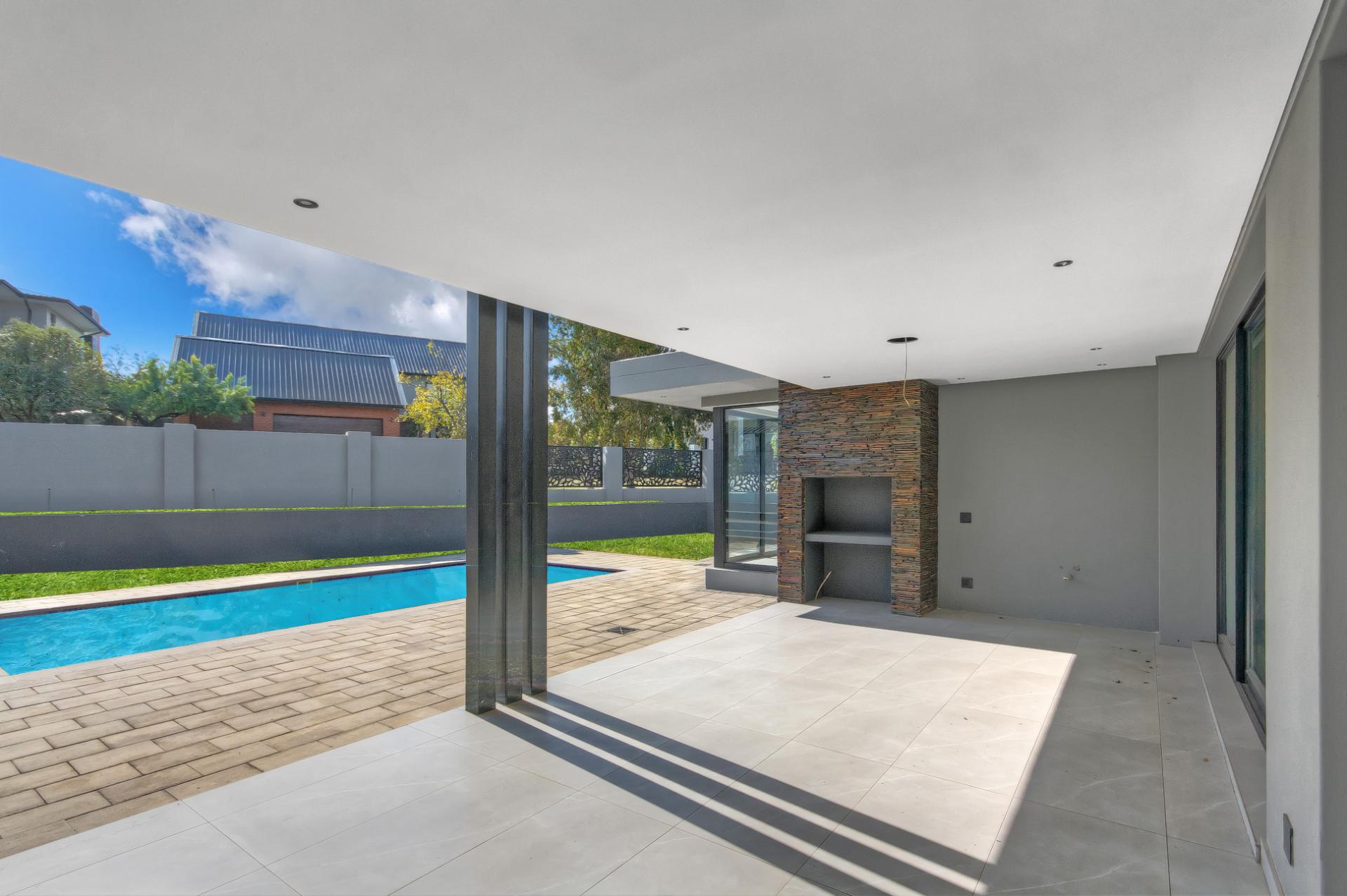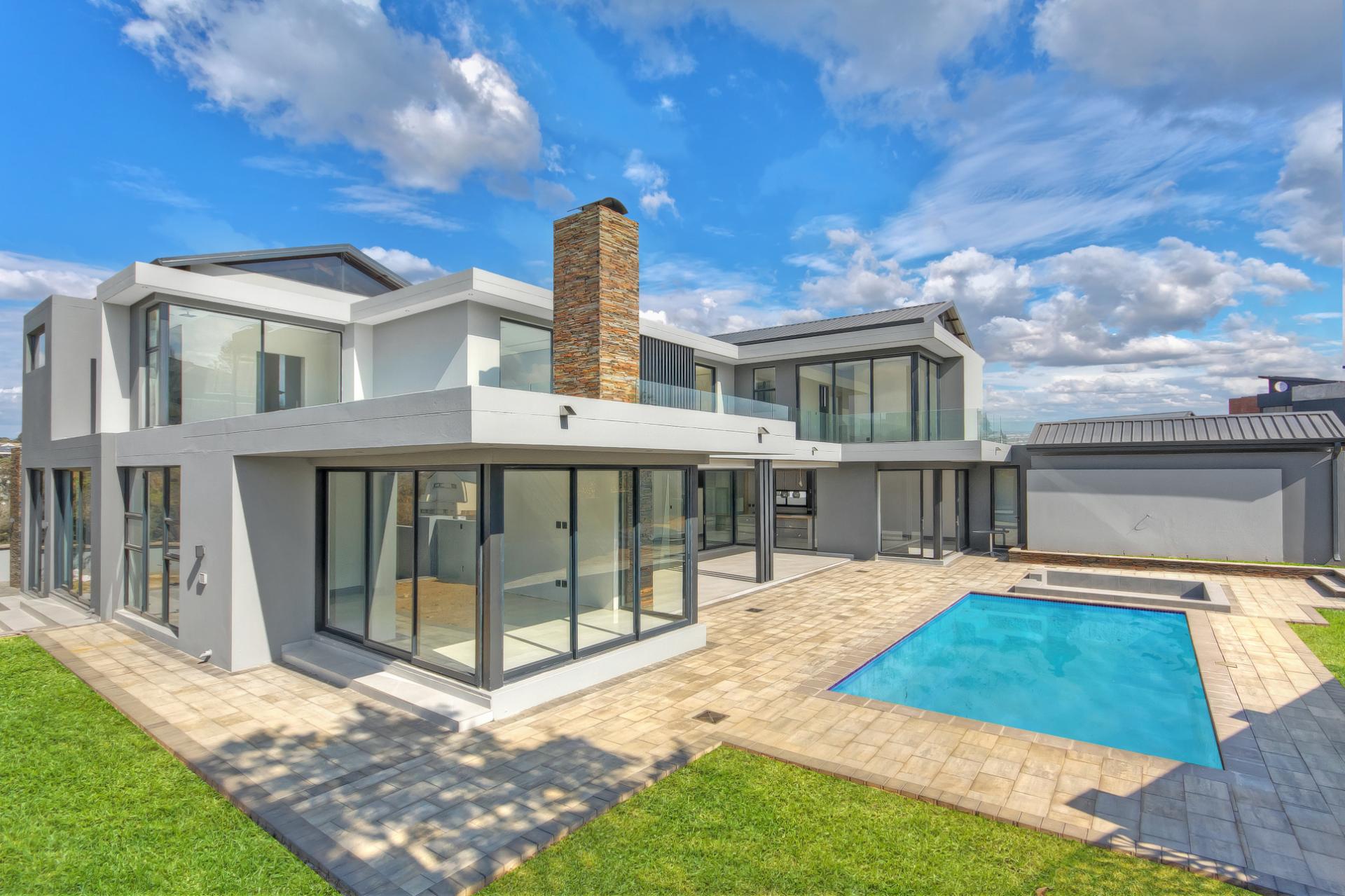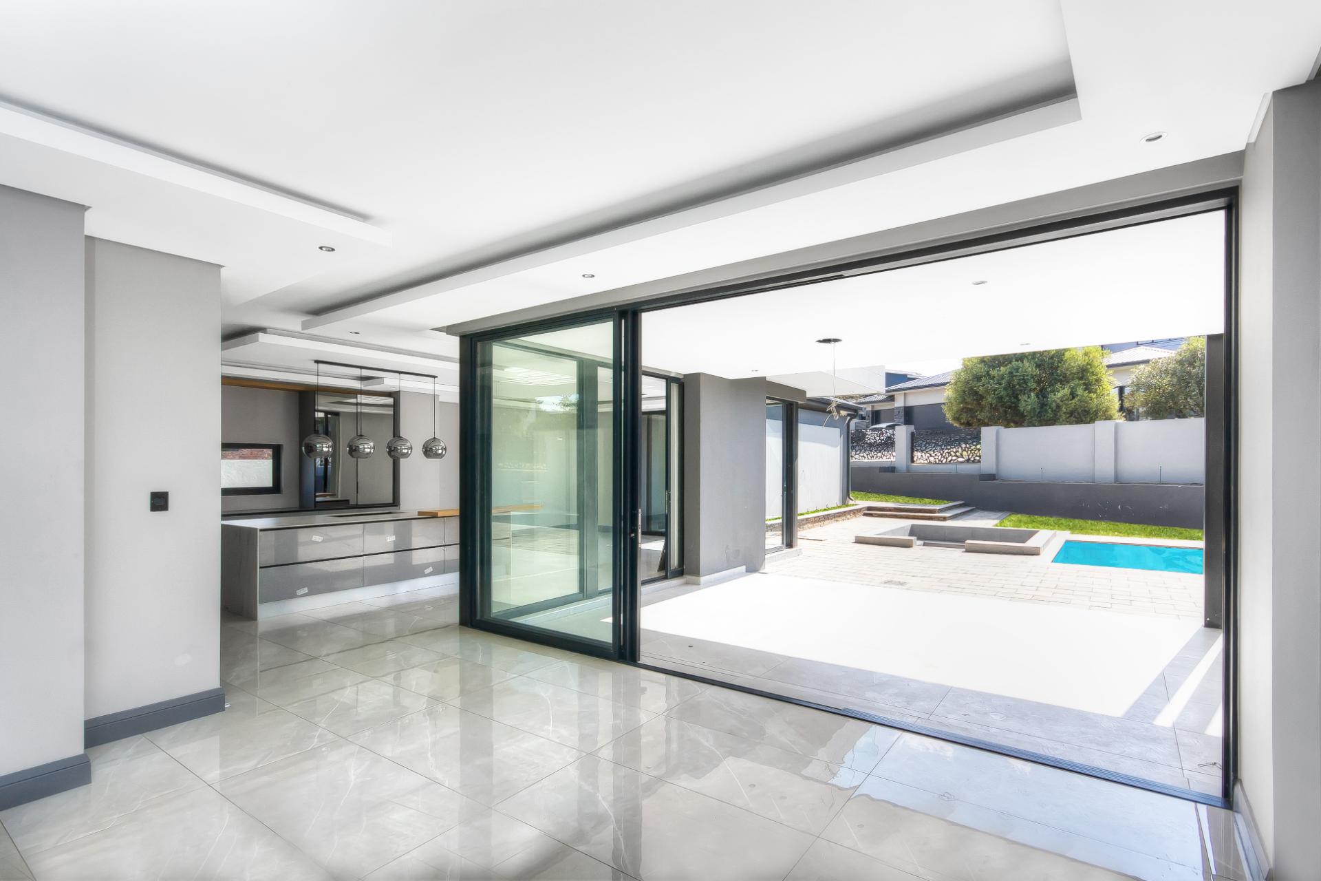 Full-length glass sliders span the width of the home, inviting natural light to flood the interiors while opening out to a large, covered patio with a built-in braai and paved entertainment area—perfectly positioned to overlook the sparkling pool and manicured, walled garden. A private guest suite is thoughtfully located on the ground floor, offering comfort and privacy for visitors.