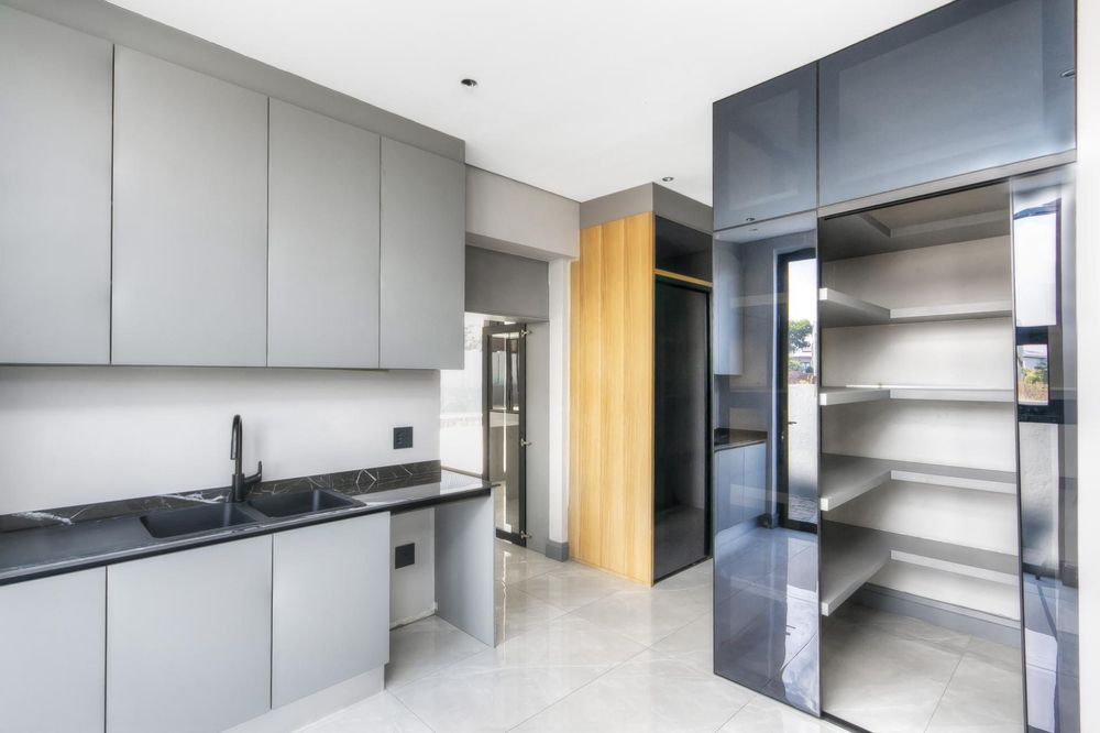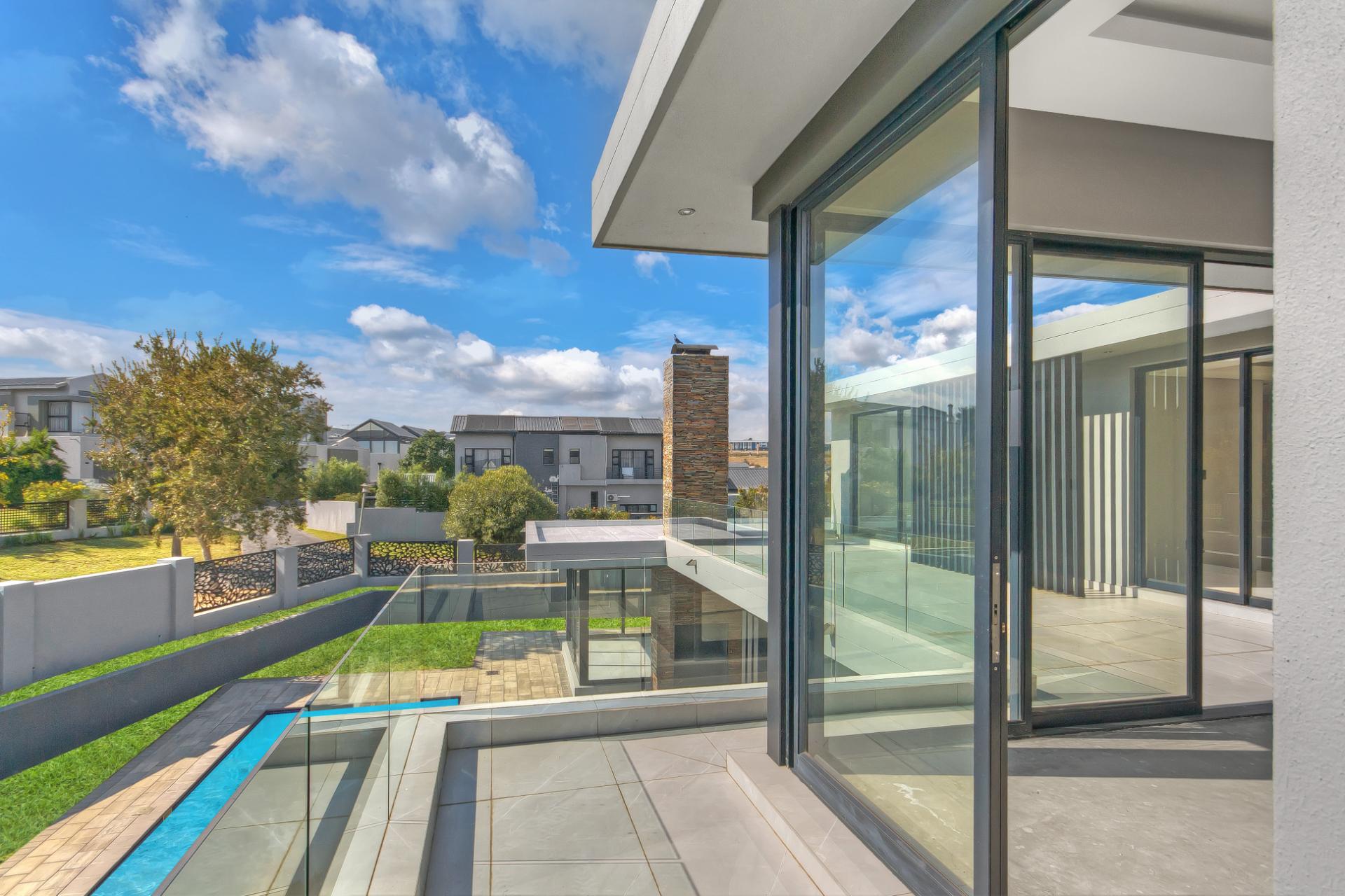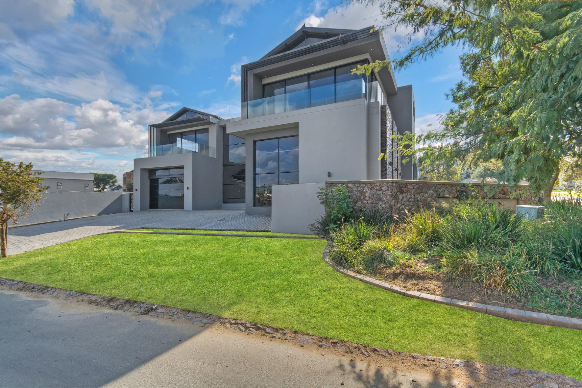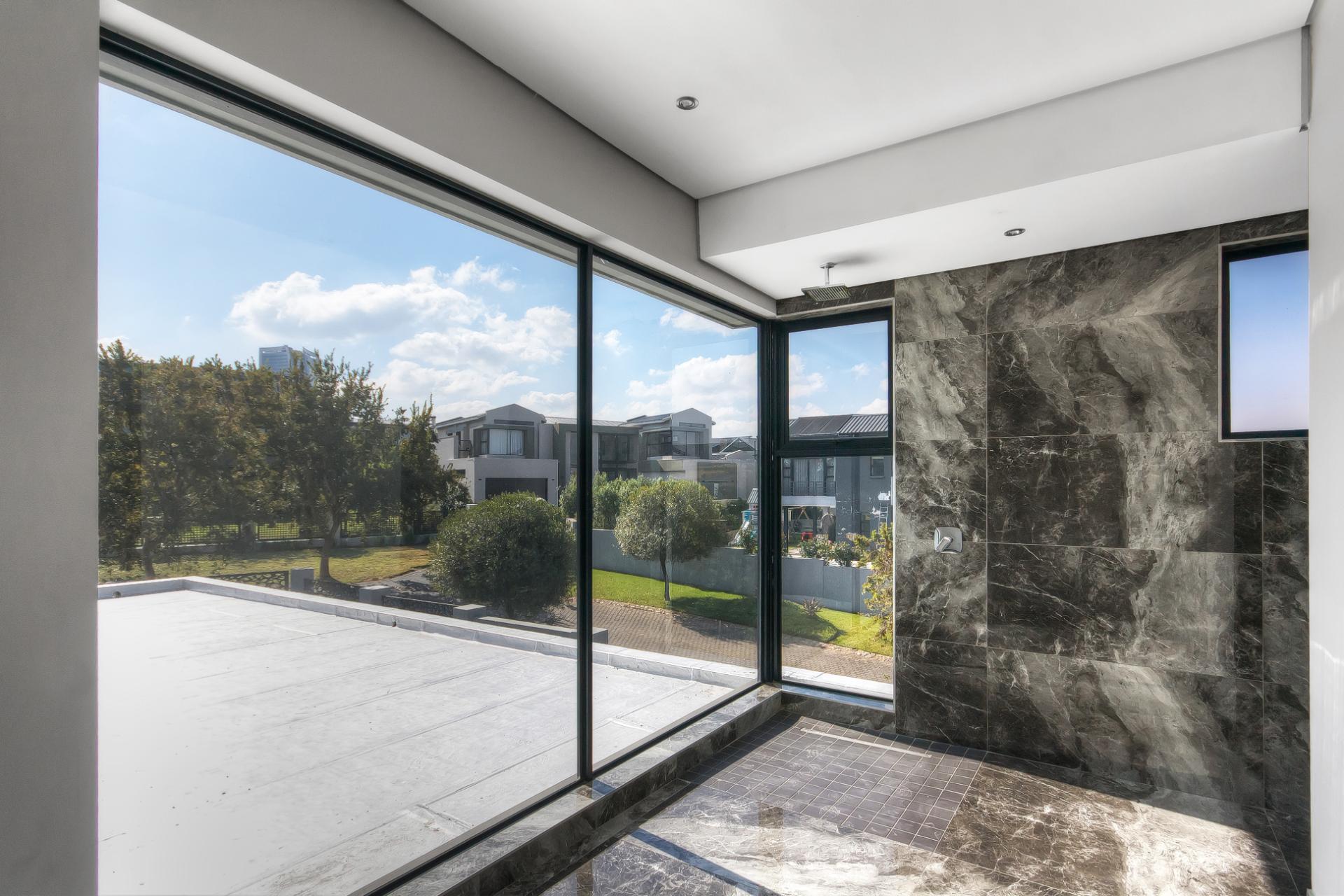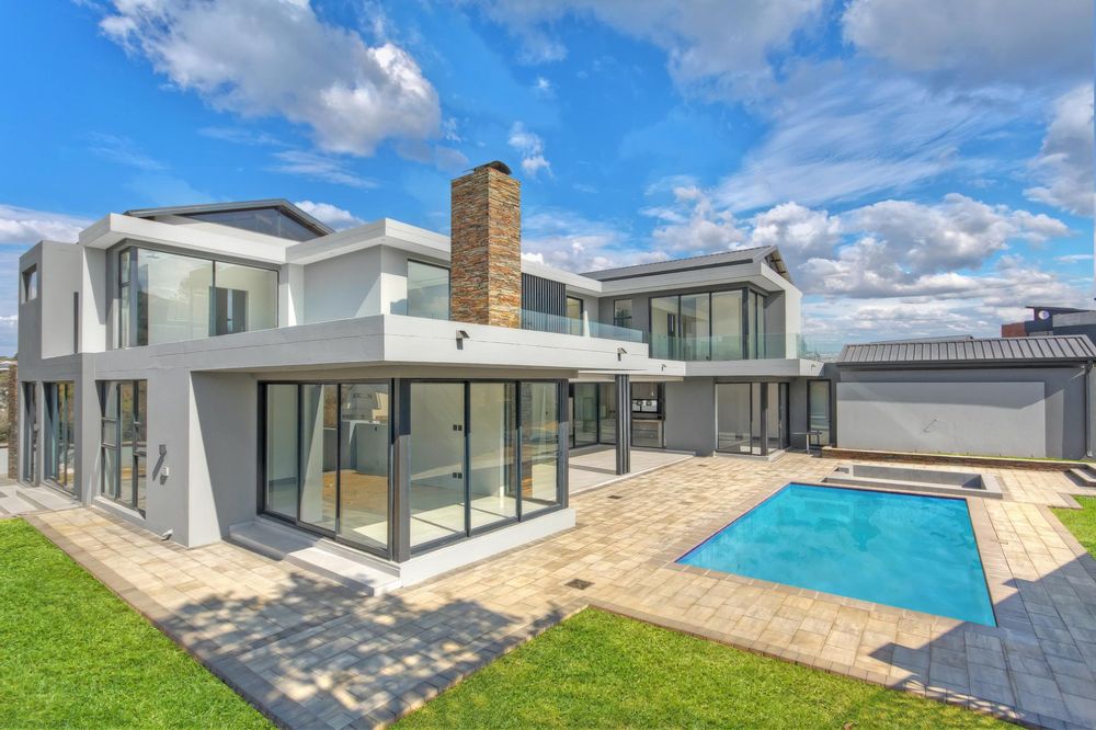 Full-length glass sliders span the width of the home, inviting natural light to flood the interiors while opening out to a large, covered patio with a built-in braai and paved entertainment area—perfectly positioned to overlook the sparkling pool and manicured, walled garden. A private guest suite is thoughtfully located on the ground floor, offering comfort and privacy for visitors.