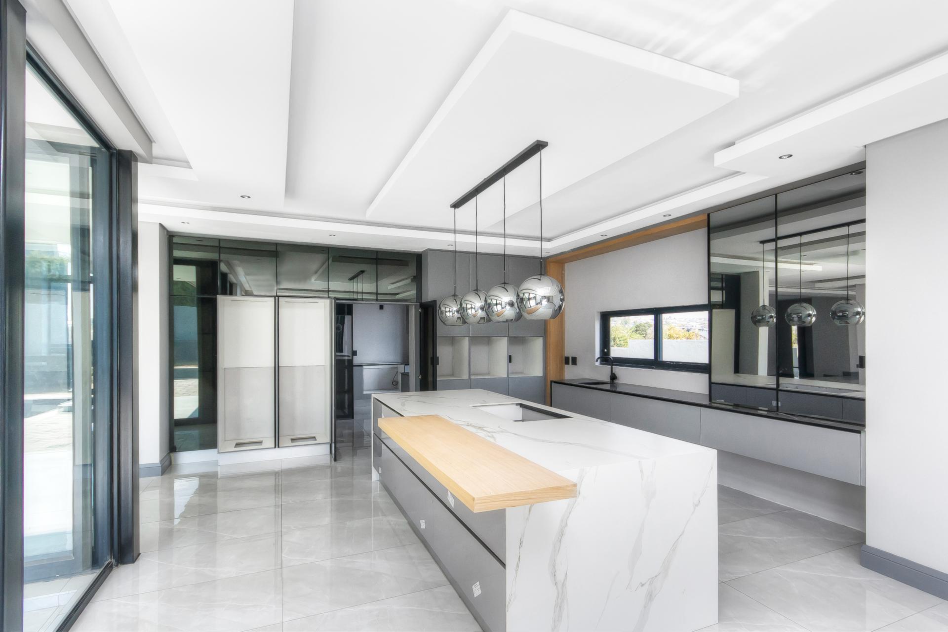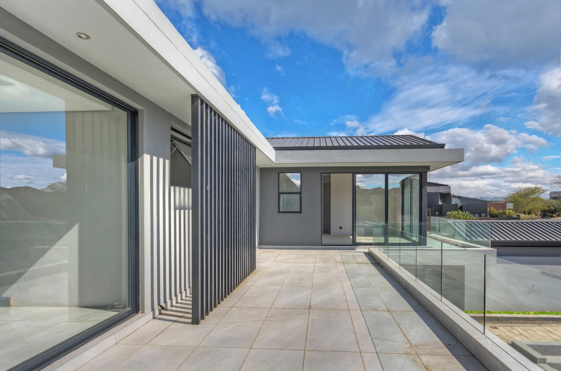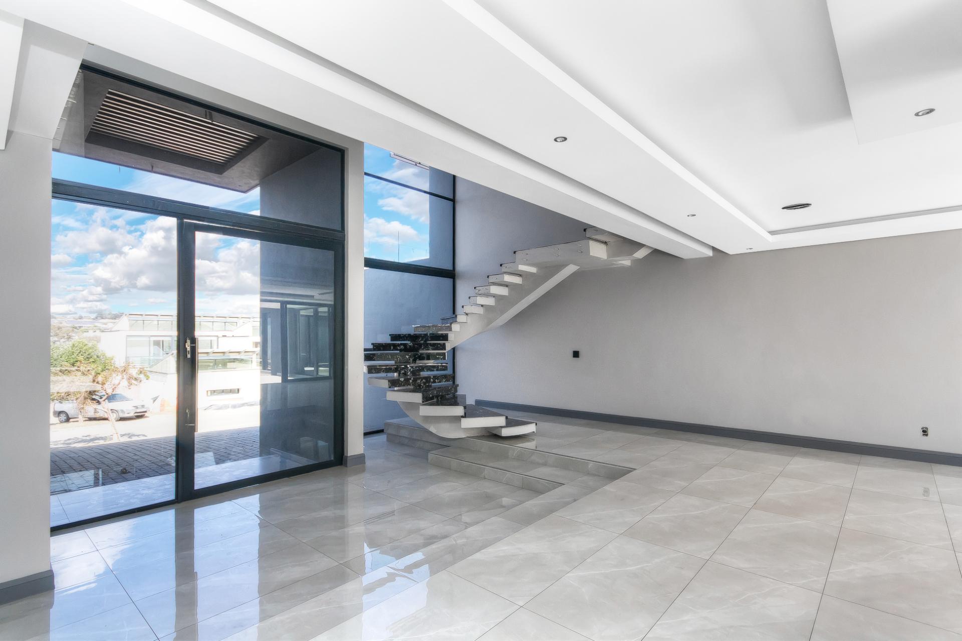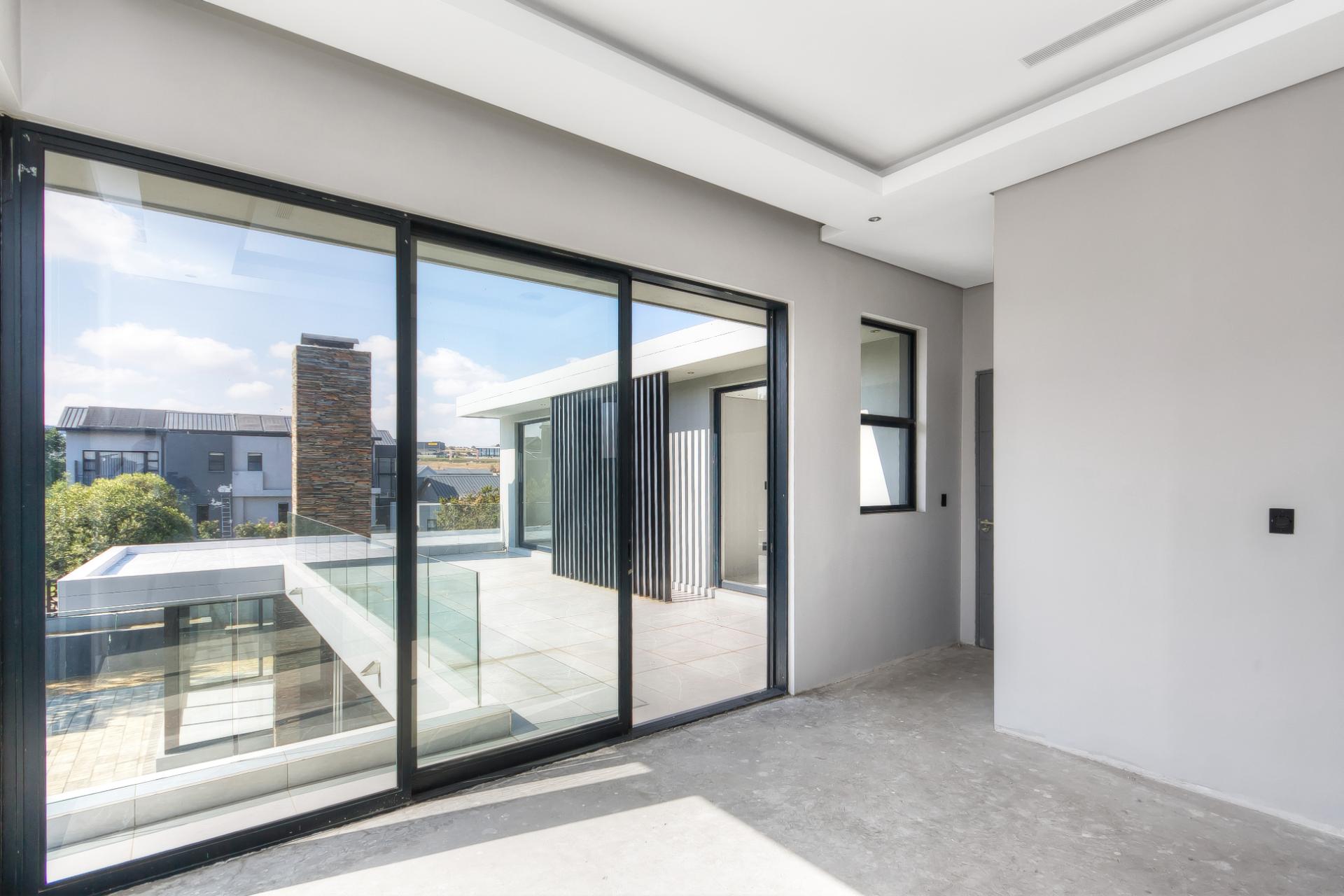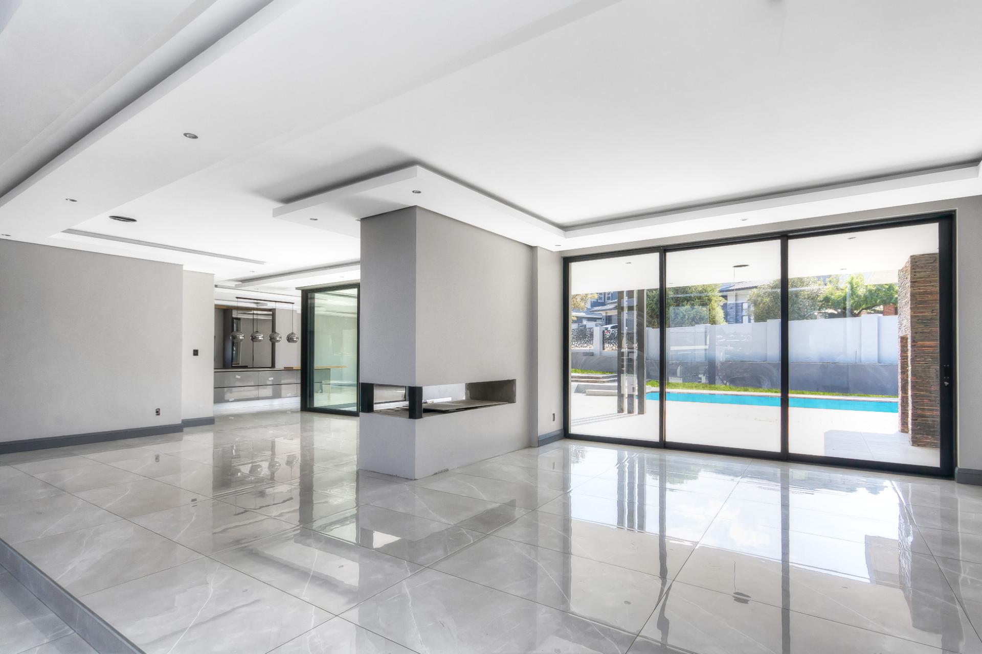 Full-length glass sliders span the width of the home, inviting natural light to flood the interiors while opening out to a large, covered patio with a built-in braai and paved entertainment area—perfectly positioned to overlook the sparkling pool and manicured, walled garden. A private guest suite is thoughtfully located on the ground floor, offering comfort and privacy for visitors.