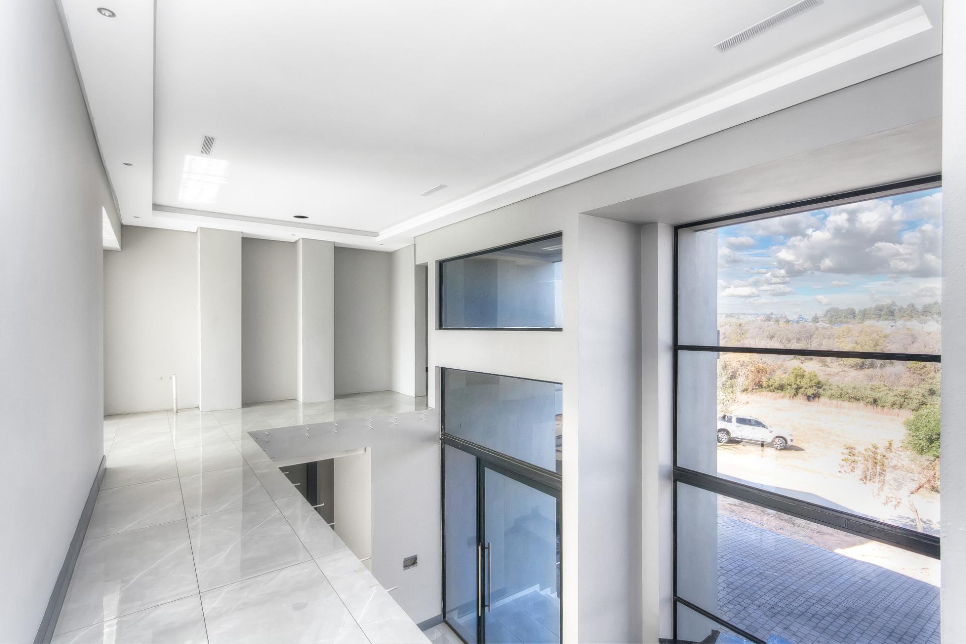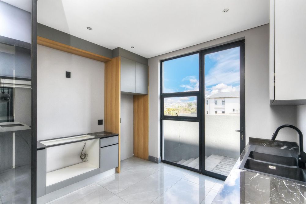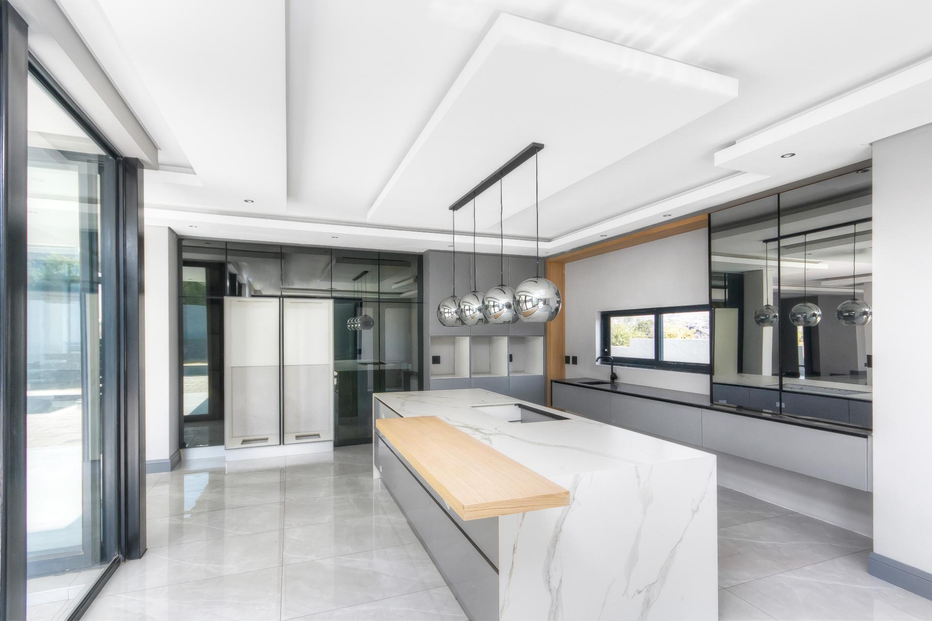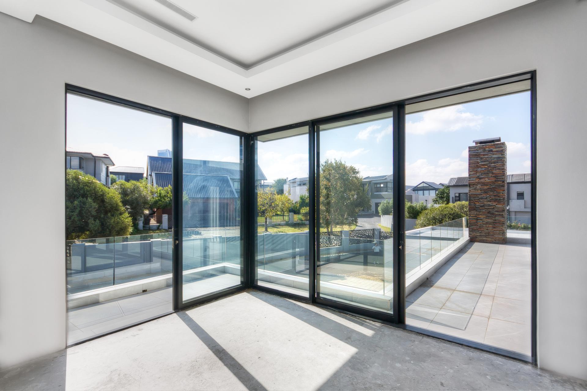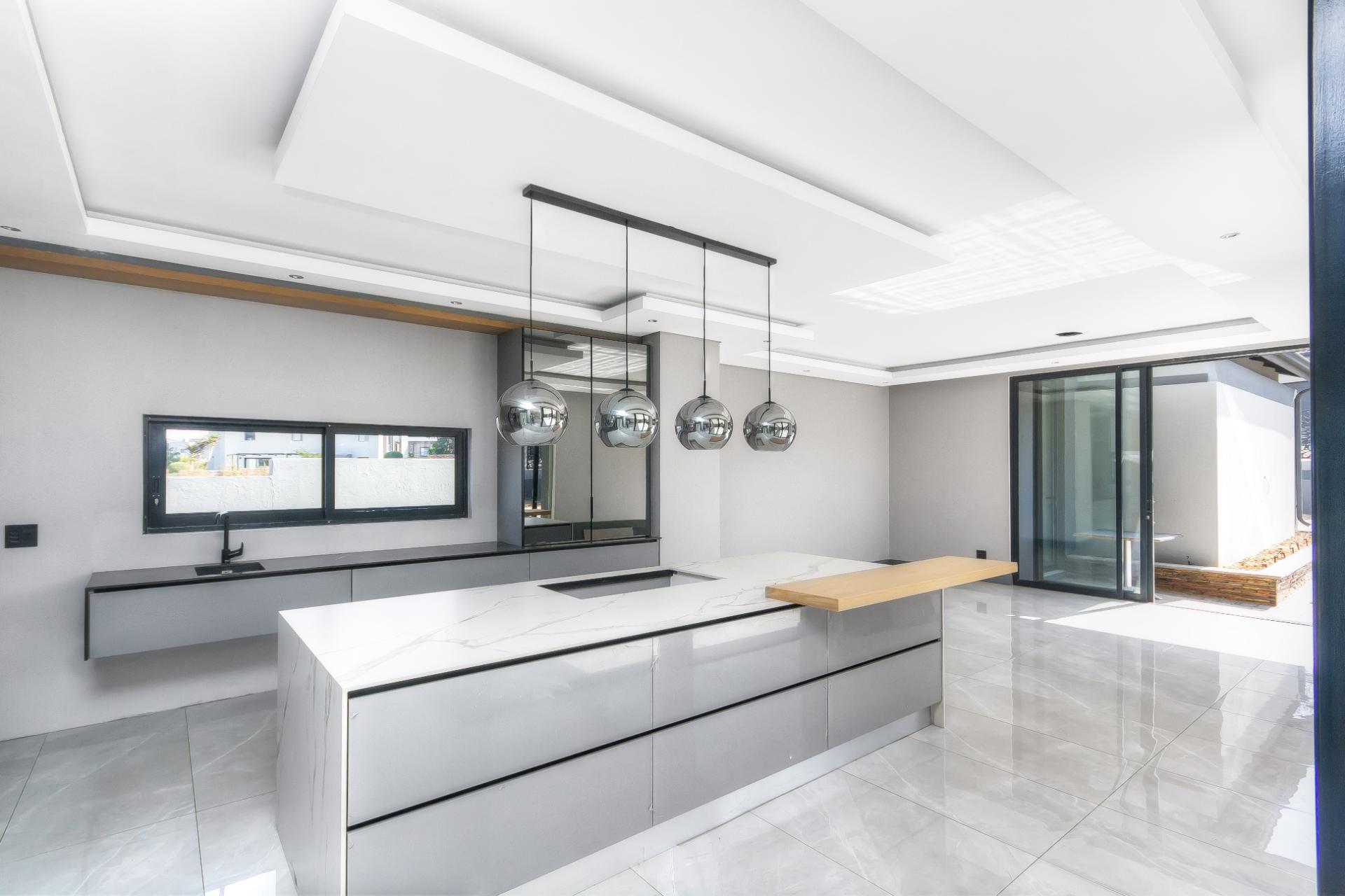 Full-length glass sliders span the width of the home, inviting natural light to flood the interiors while opening out to a large, covered patio with a built-in braai and paved entertainment area—perfectly positioned to overlook the sparkling pool and manicured, walled garden. A private guest suite is thoughtfully located on the ground floor, offering comfort and privacy for visitors.