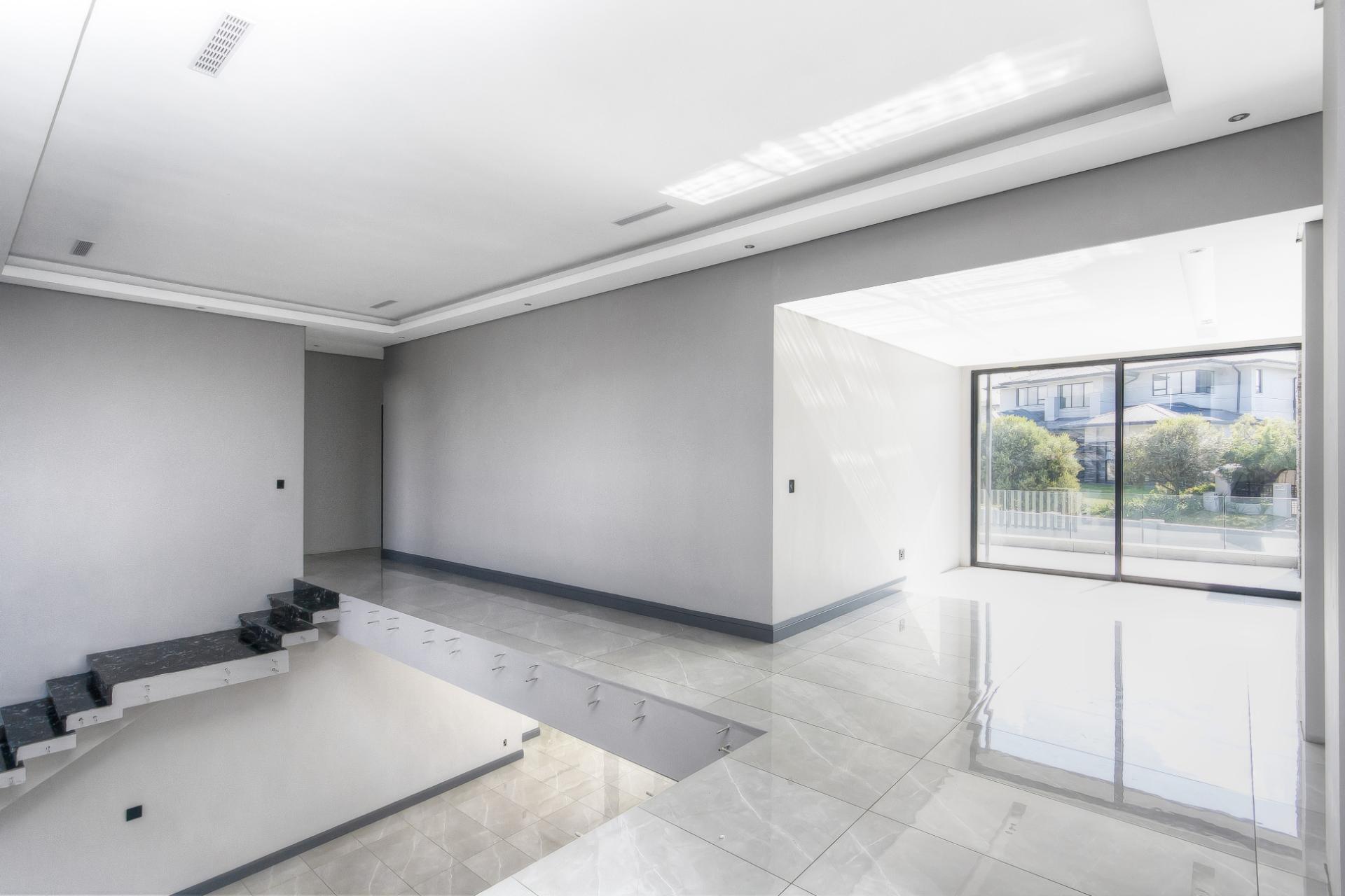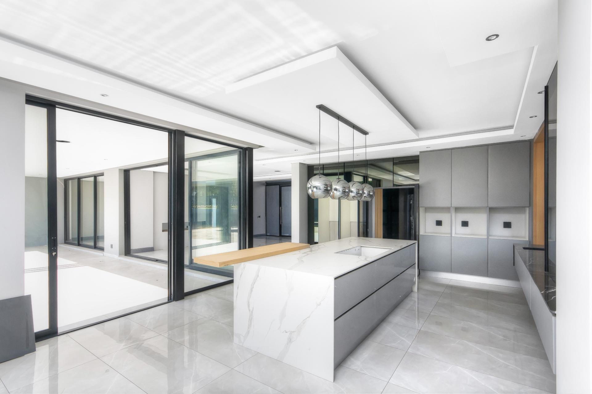 Upstairs, a sun-drenched pajama lounge serves as a relaxed family retreat, accompanied by three generous en-suite bedrooms. The architectural design emphasizes natural light and uninterrupted views, with large-format windows and glass paneling in every room.