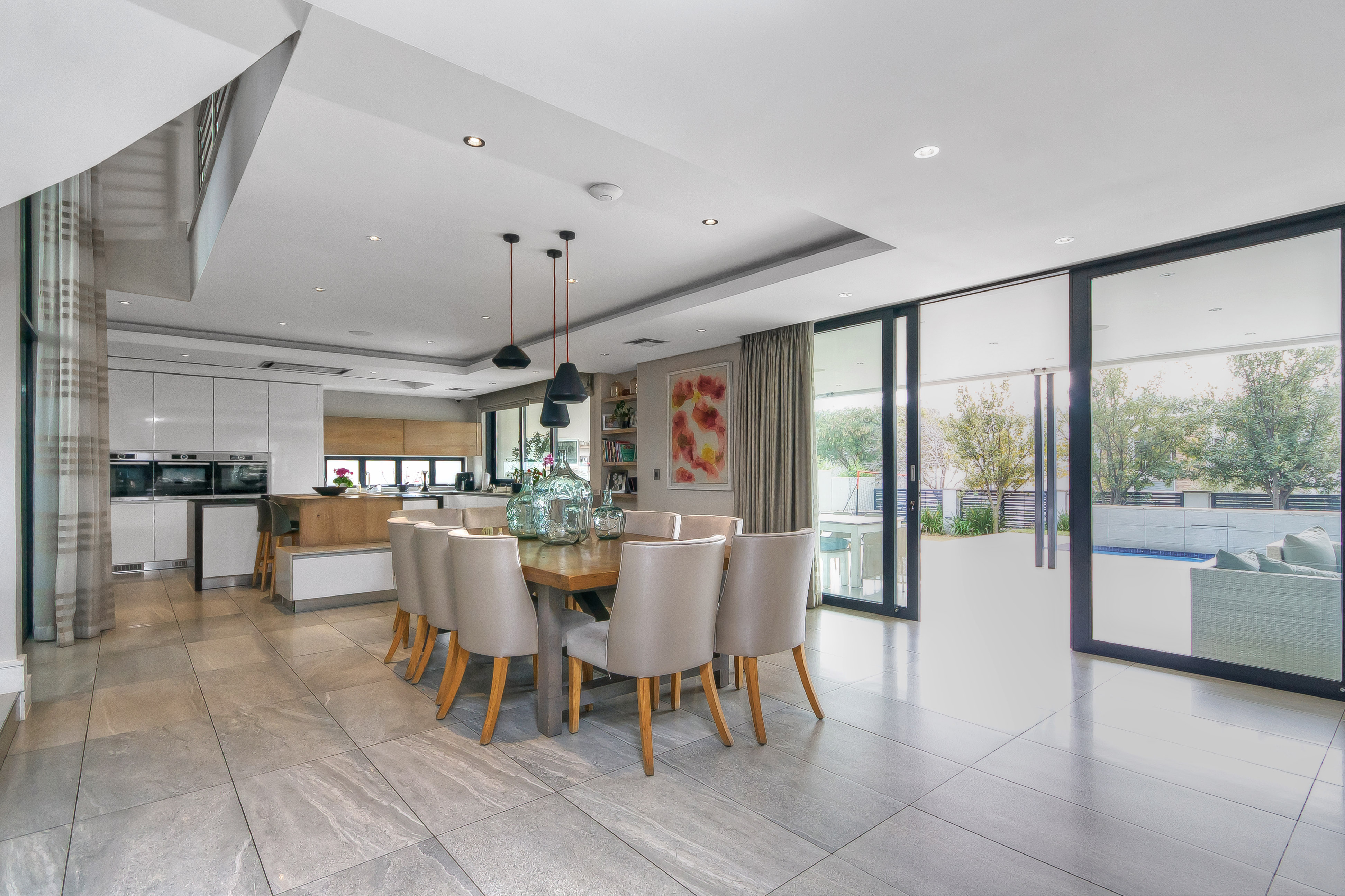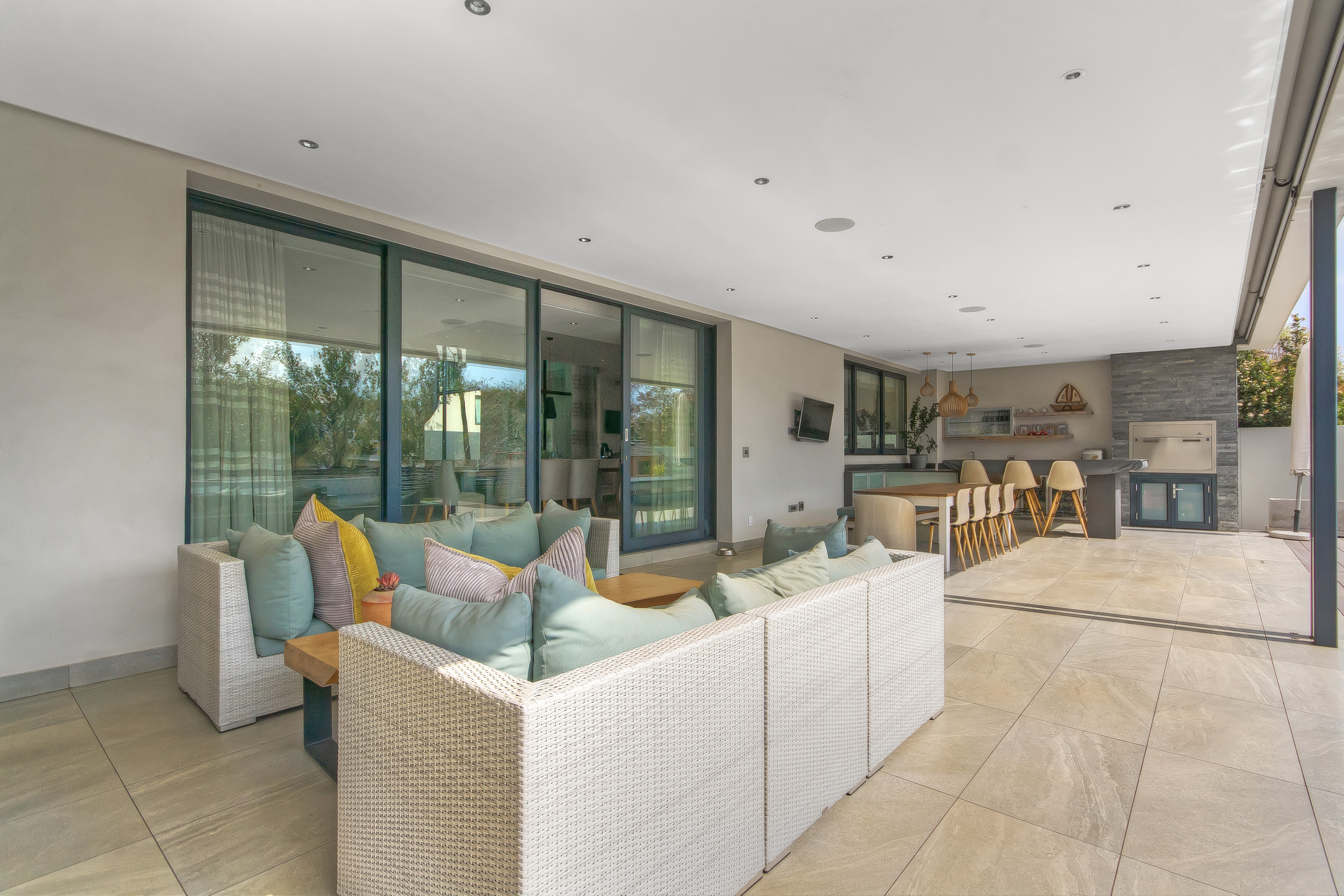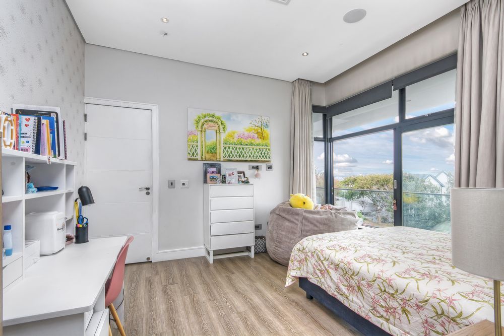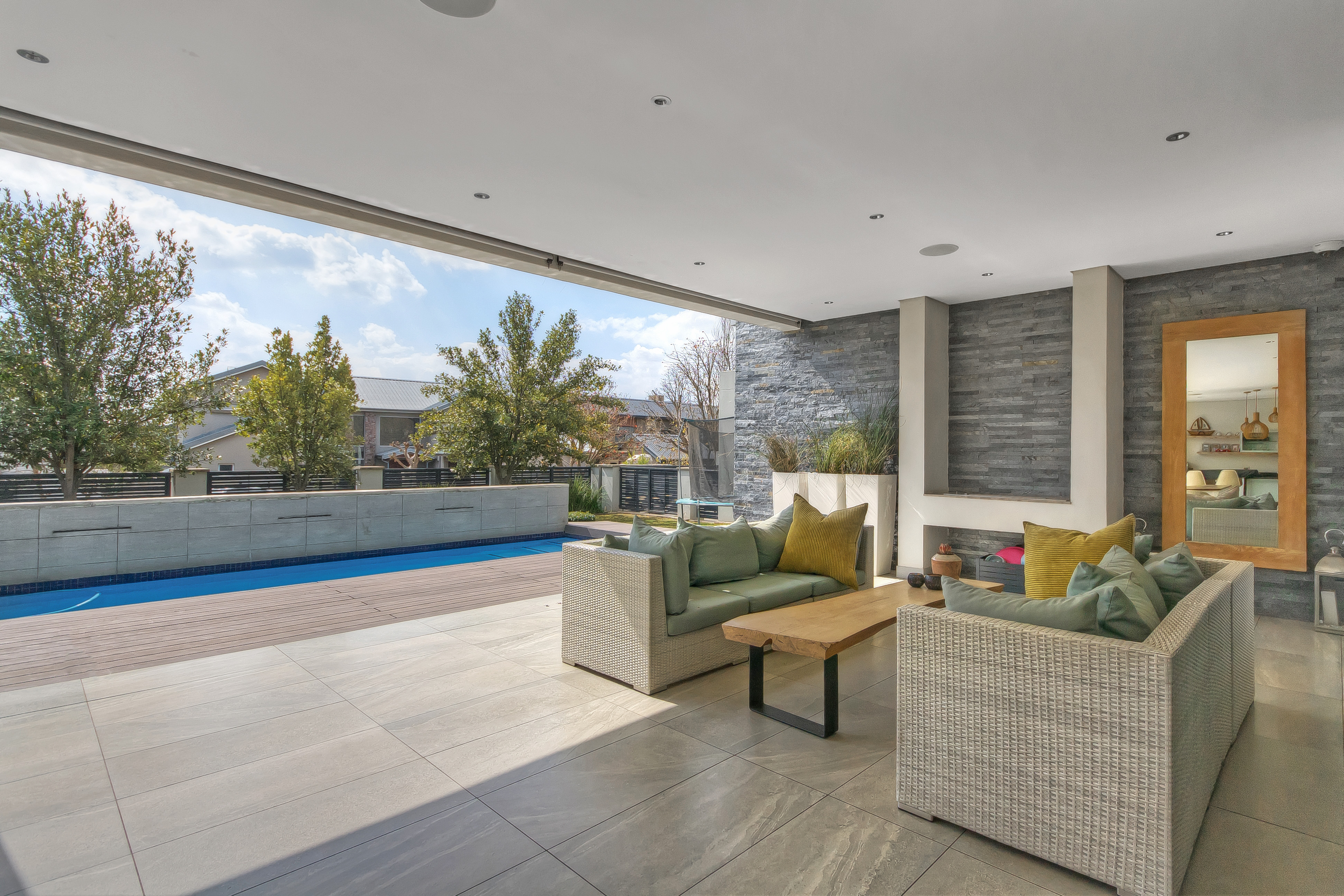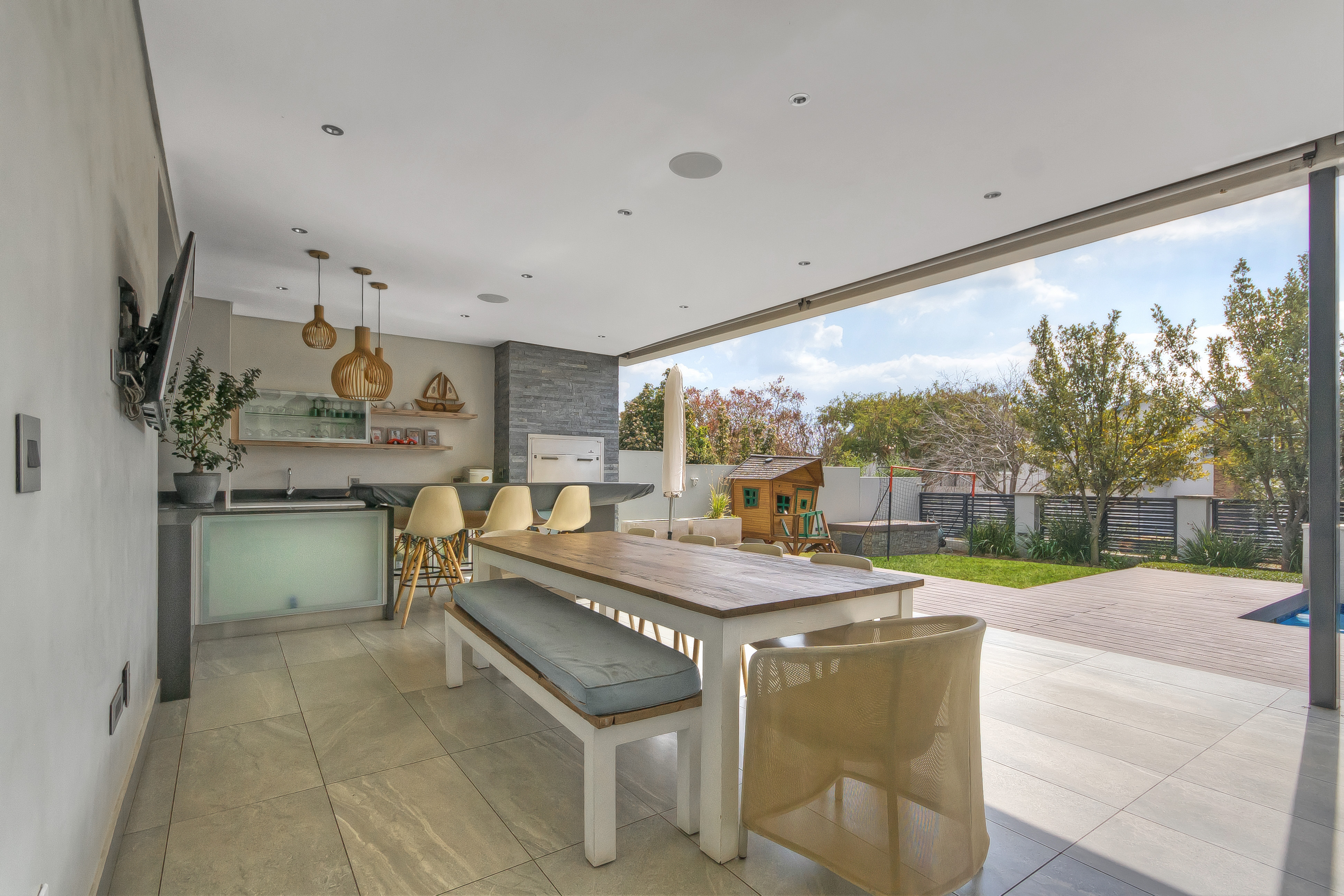 Descending into the fully tiled, open-plan entertainment spaces — encompassing the kitchen, dining area, and family lounge — your gaze is immediately drawn to expansive glass sliders that open seamlessly to an impressive, year-round entertainment haven. The covered patio, complete with remote-controlled drop-down sun blinds, offers a built-in gas fireplace, generous seating, and views of the sleek, elongated pool with composite decking. An adjoining fully equipped bar area boasts premium fridges, large prep bays, and a built-in gas braai — the ultimate setting for hosting unforgettable gatherings. Beyond lies a lush, established garden with expansive lawn and mature trees for the whole family to enjoy.