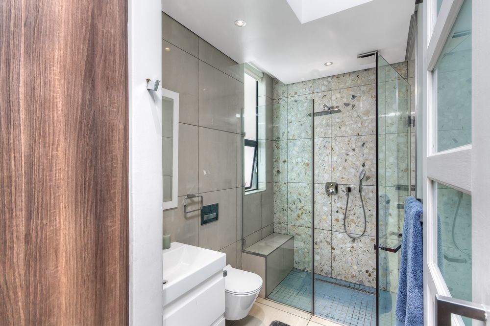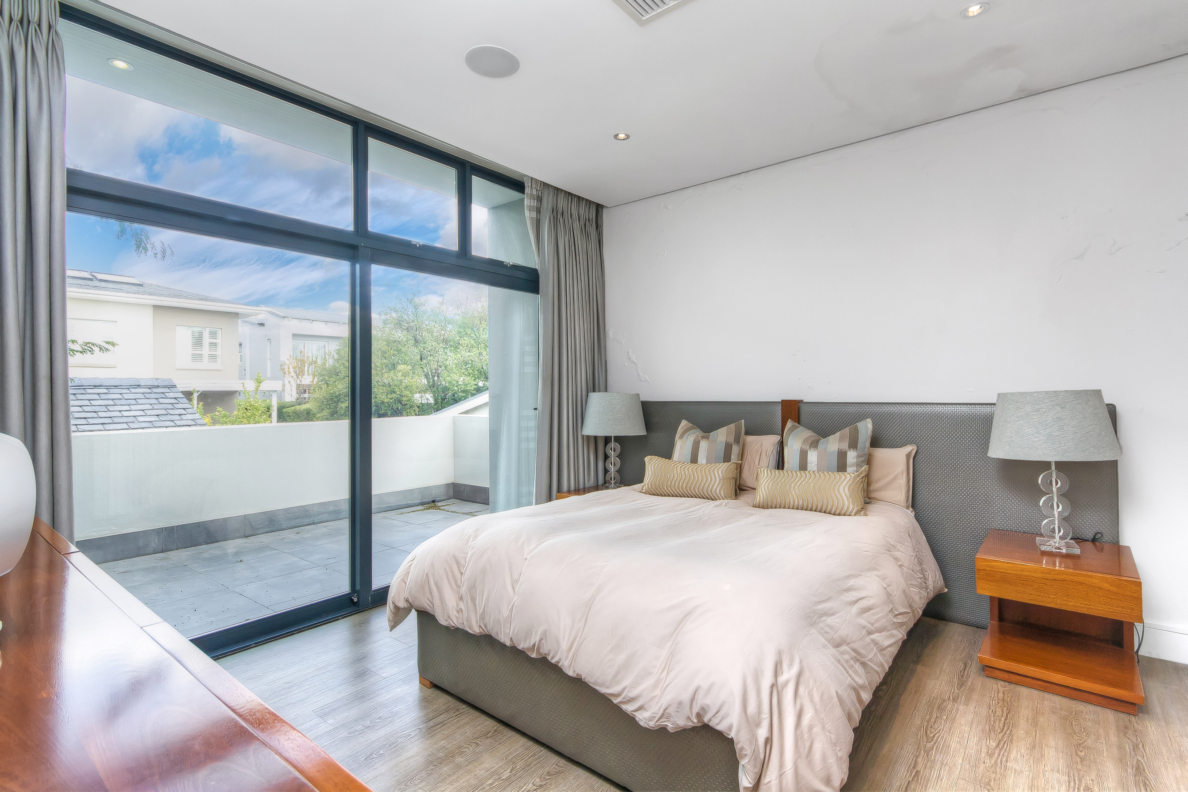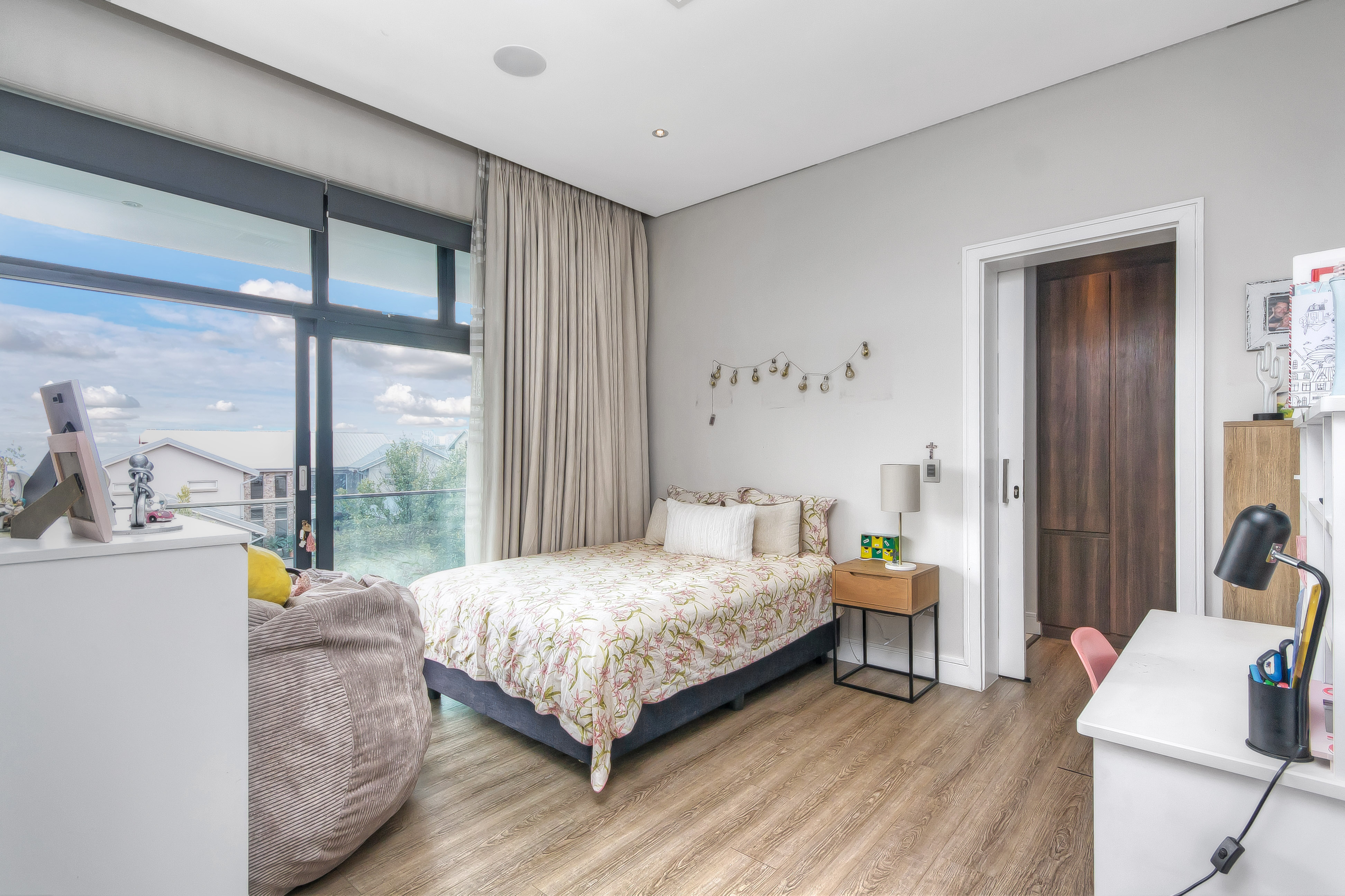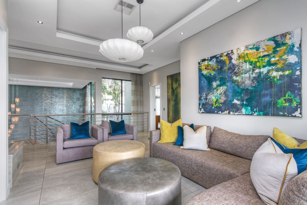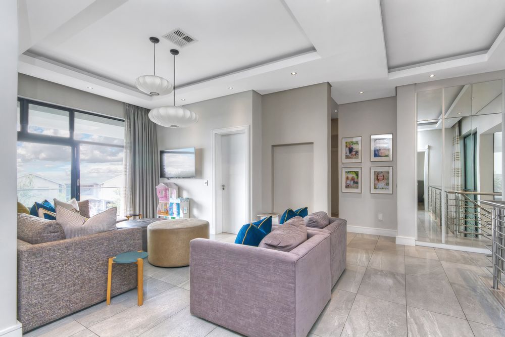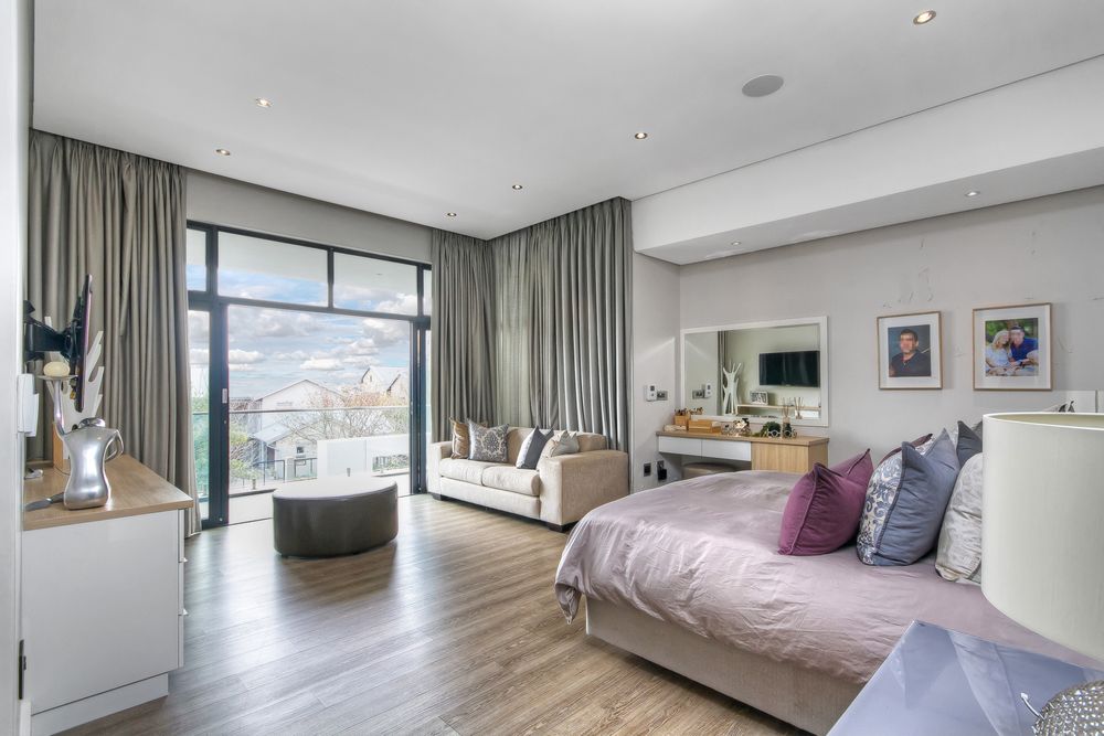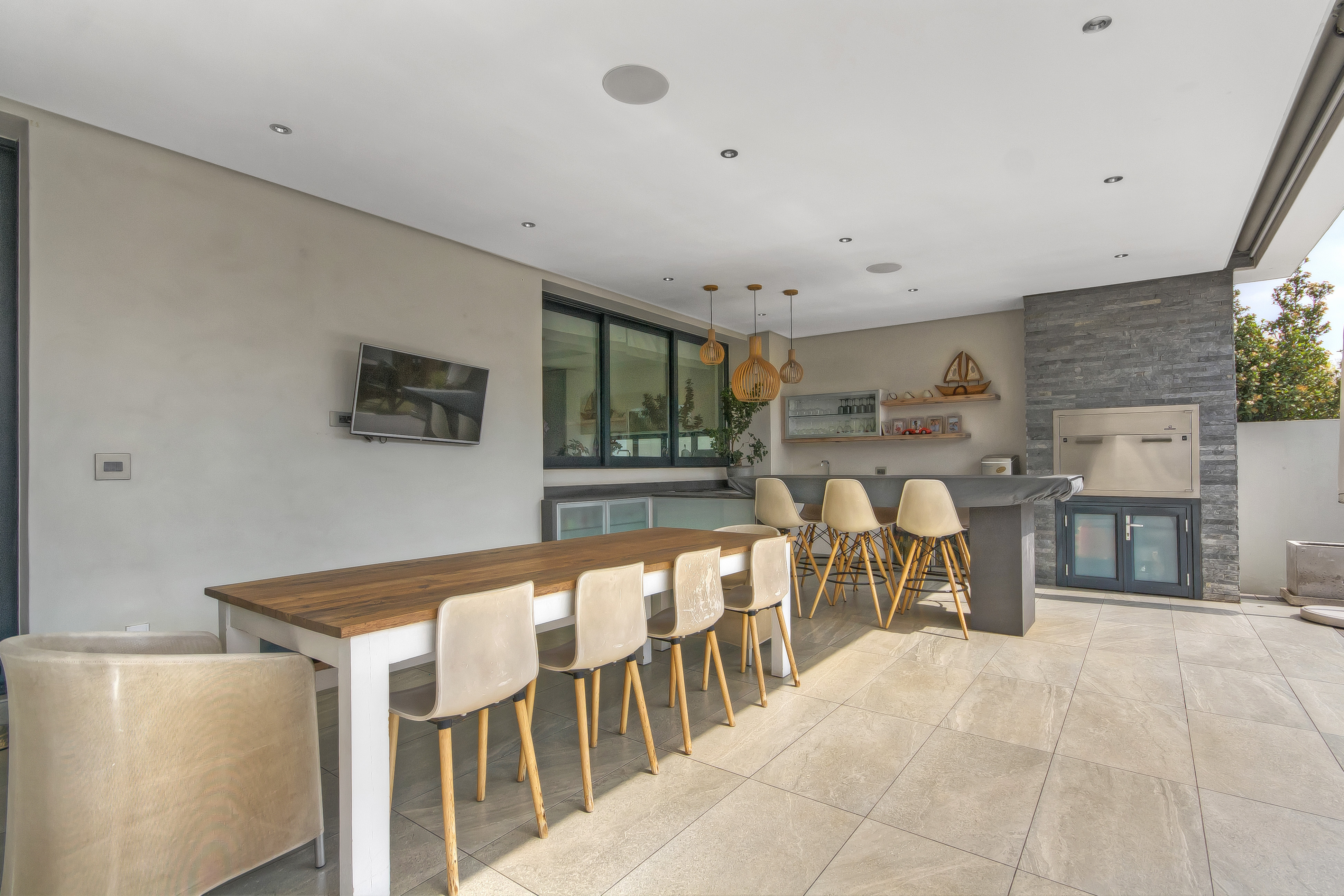 Descending into the fully tiled, open-plan entertainment spaces — encompassing the kitchen, dining area, and family lounge — your gaze is immediately drawn to expansive glass sliders that open seamlessly to an impressive, year-round entertainment haven. The covered patio, complete with remote-controlled drop-down sun blinds, offers a built-in gas fireplace, generous seating, and views of the sleek, elongated pool with composite decking. An adjoining fully equipped bar area boasts premium fridges, large prep bays, and a built-in gas braai — the ultimate setting for hosting unforgettable gatherings. Beyond lies a lush, established garden with expansive lawn and mature trees for the whole family to enjoy.